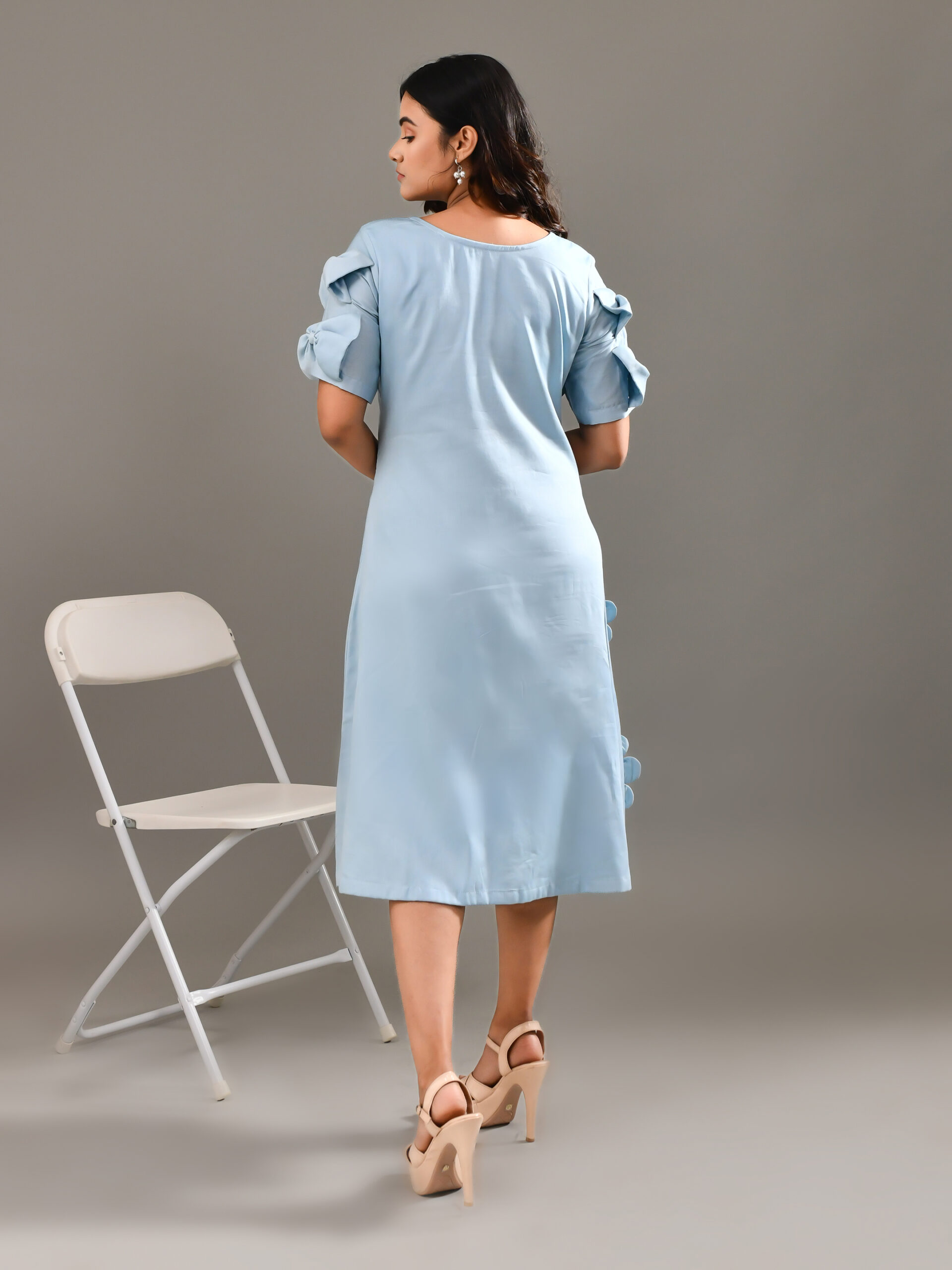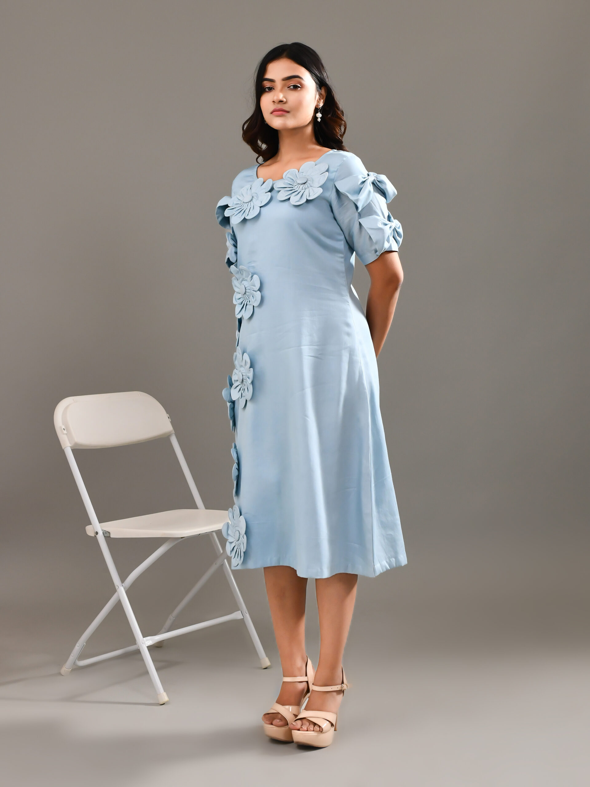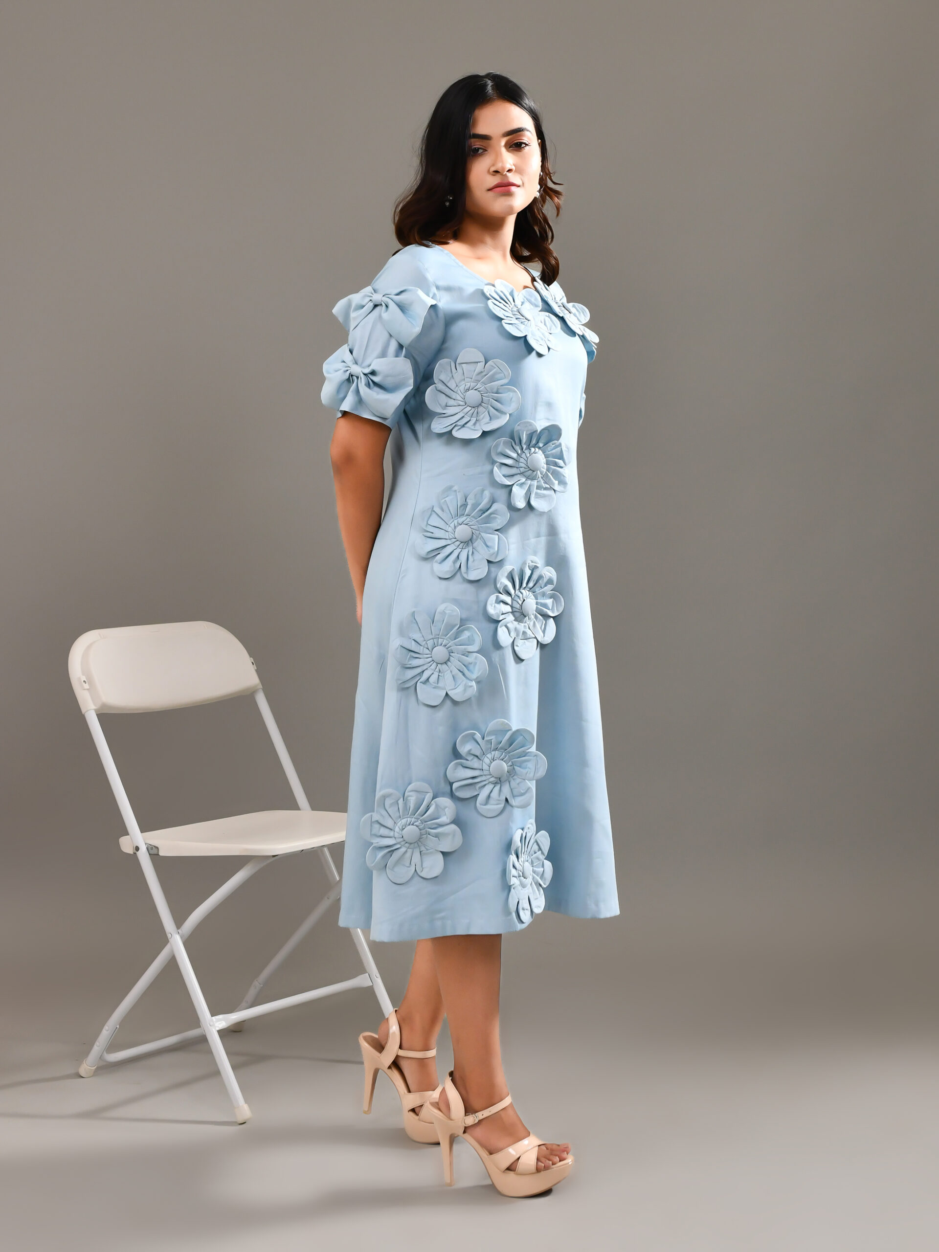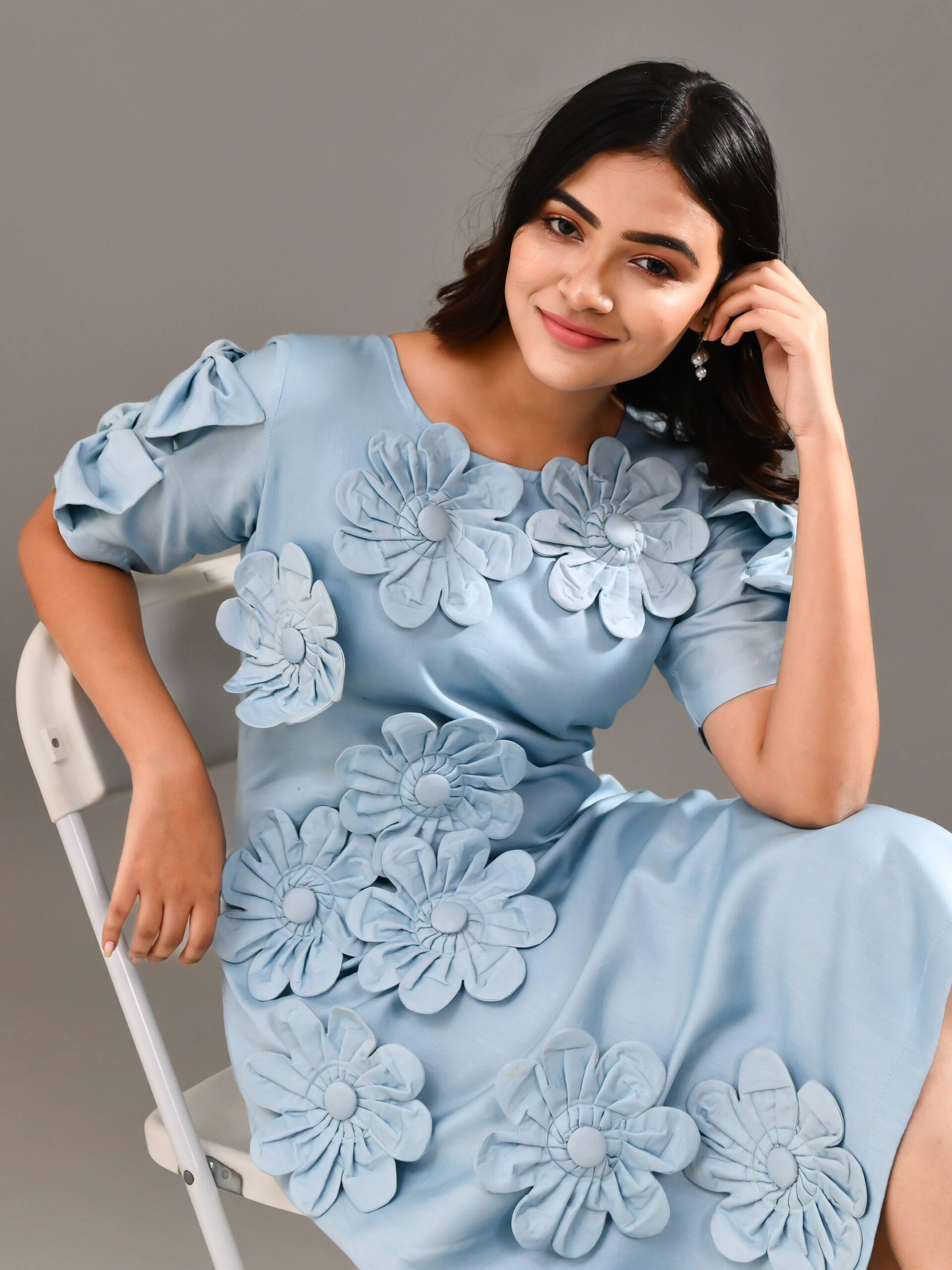 Sky Blue Flower Applique Worked Blended Cotton Dress