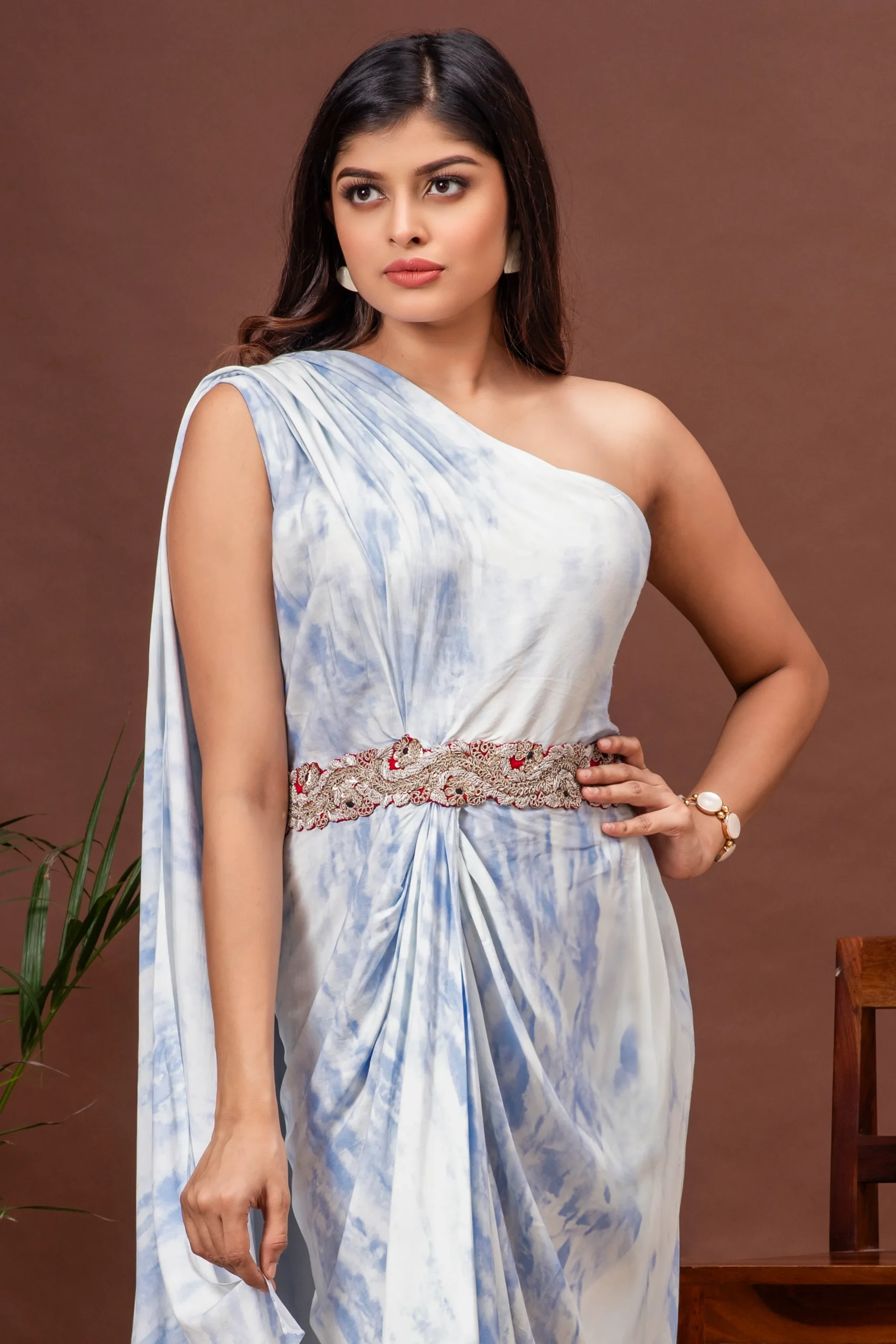 Showcasing sky blue beautifully crafted tie dye printed one shoulder draped gown in cotton base with embroidery at the waist and a shoulder drape.