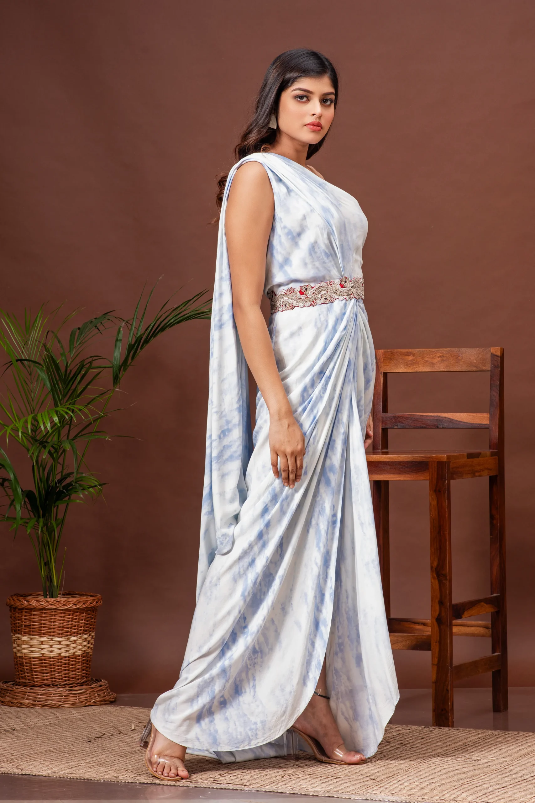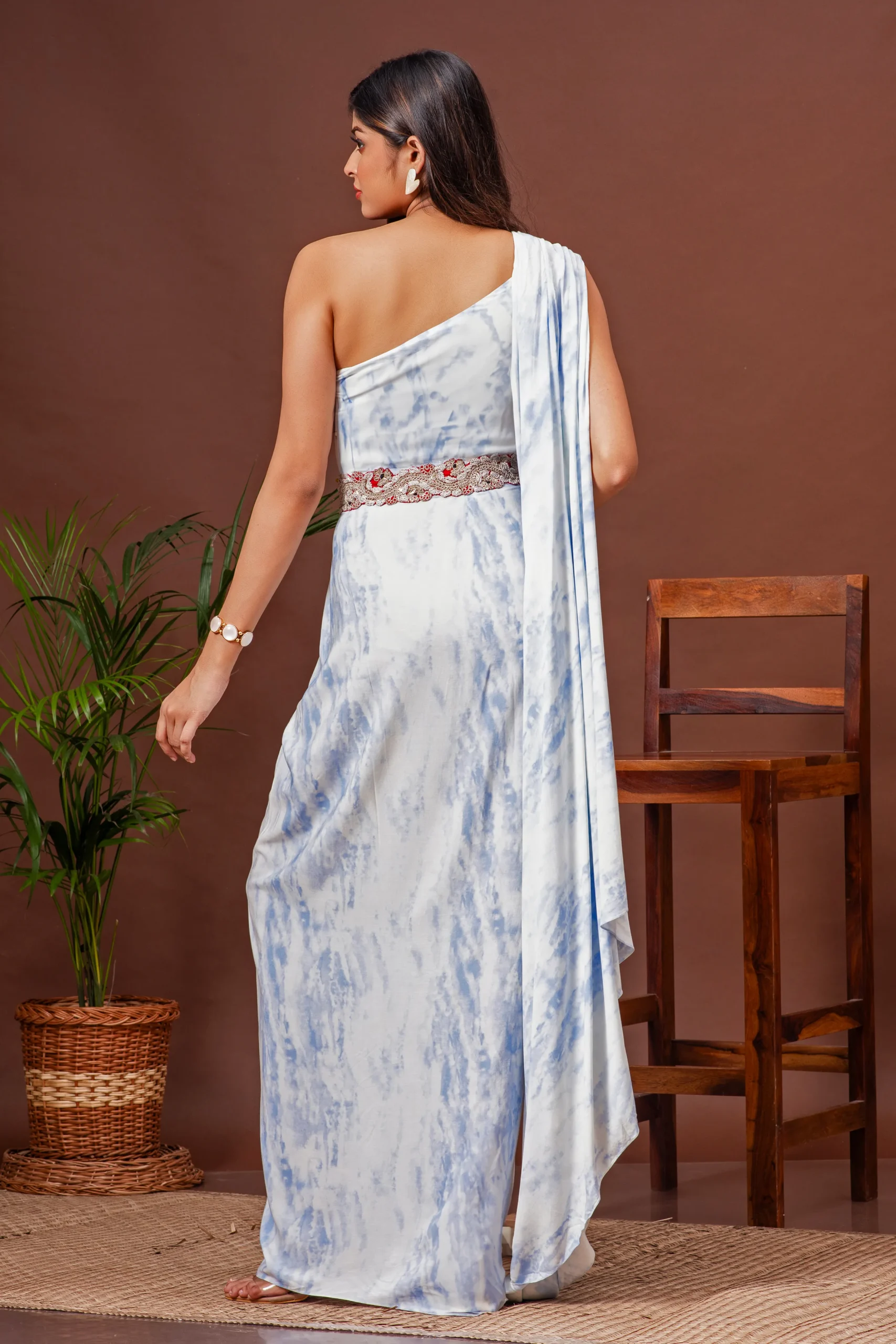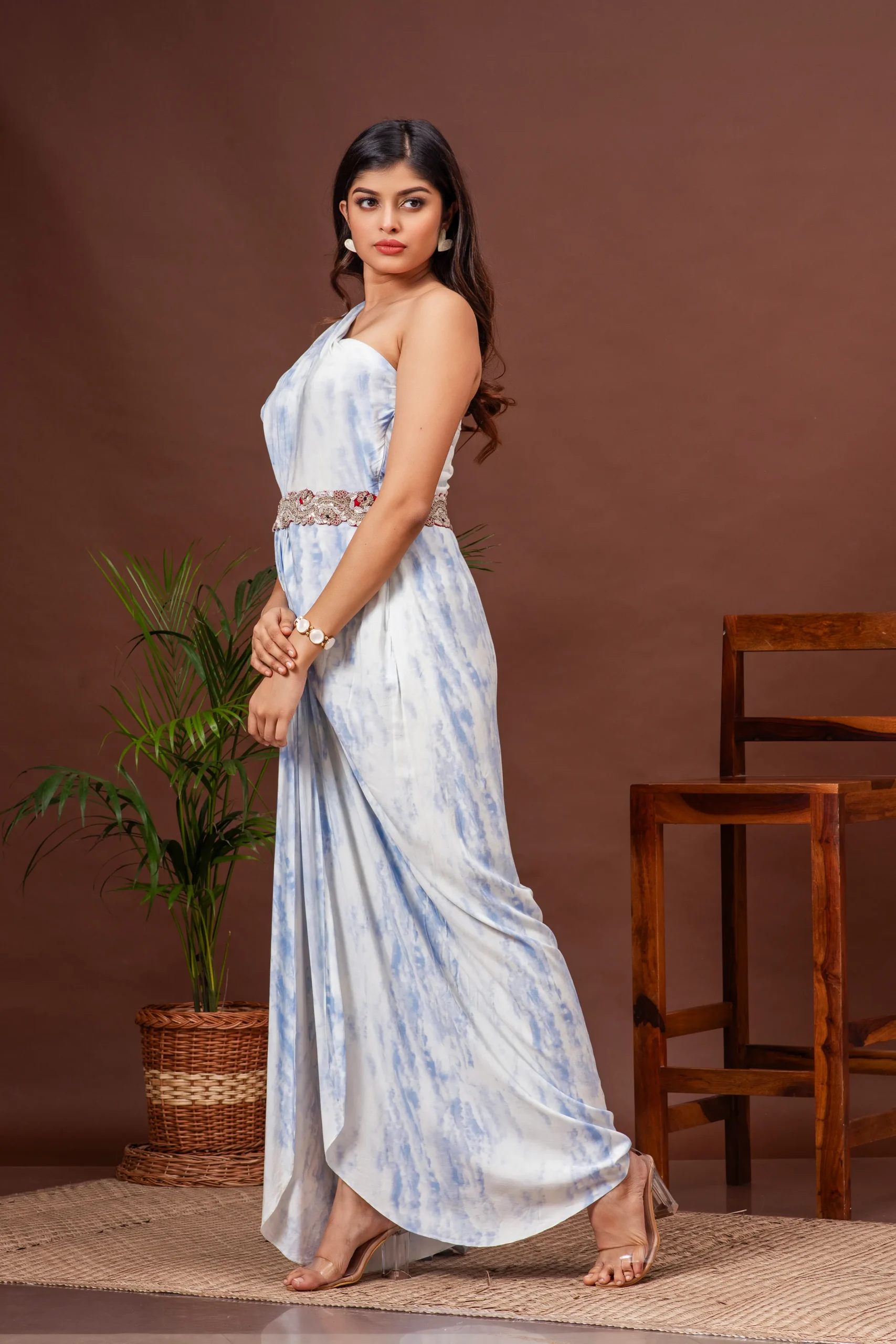 Sky Blue Tie Dye Cotton One Shoulder Draped Gown
