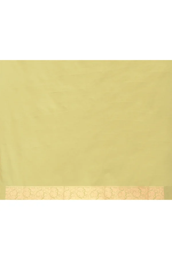 Style this soft lime green Banarasi Katan silk saree with antique gold, pearl, or pastel-toned polki jewelry to complement its delicate butti motifs and refined gold zari border. Pair with gold, ivory, or nude-toned heels or classic juttis, and finish with a subtle metallic or pastel clutch