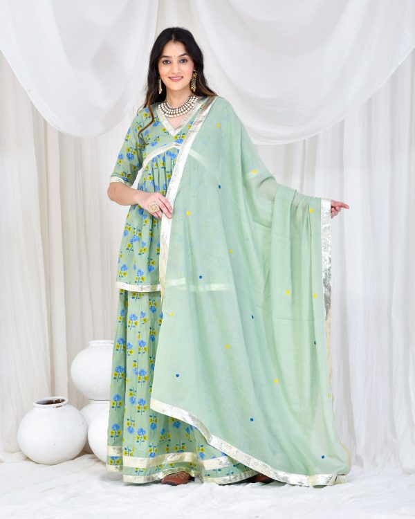 Introducing a refined soft mint green cotton hand block printed skirt set, thoughtfully crafted to celebrate artisanal charm and timeless elegance. Made from high-quality cotton, the skirt features intricate hand block prints, while the airy mulmul dupatta is adorned with delicate aari embroidery and subtle gota accents. Blending comfort with festive sophistication, this ensemble is perfect for elegant celebrations and daytime festivities.