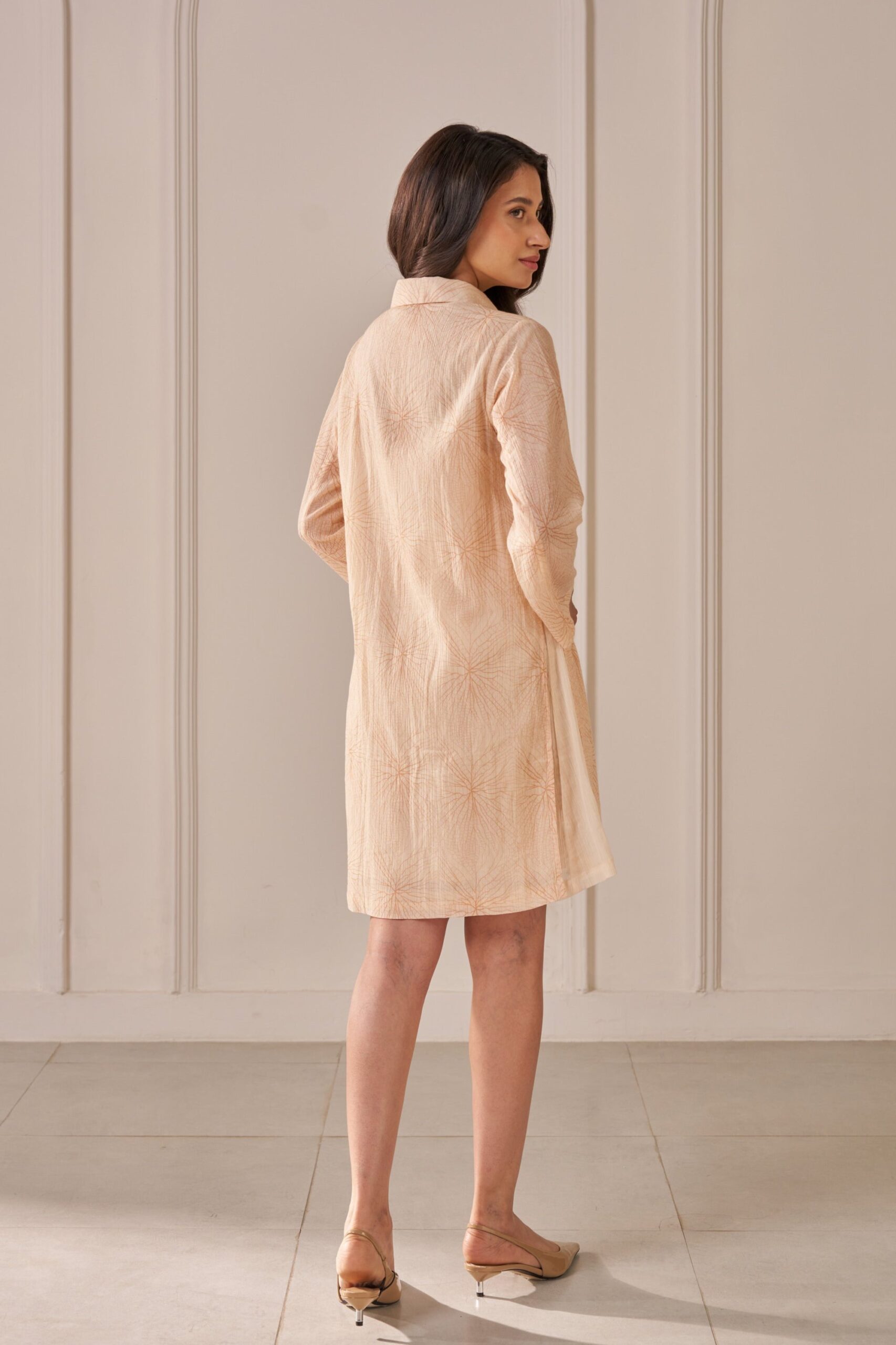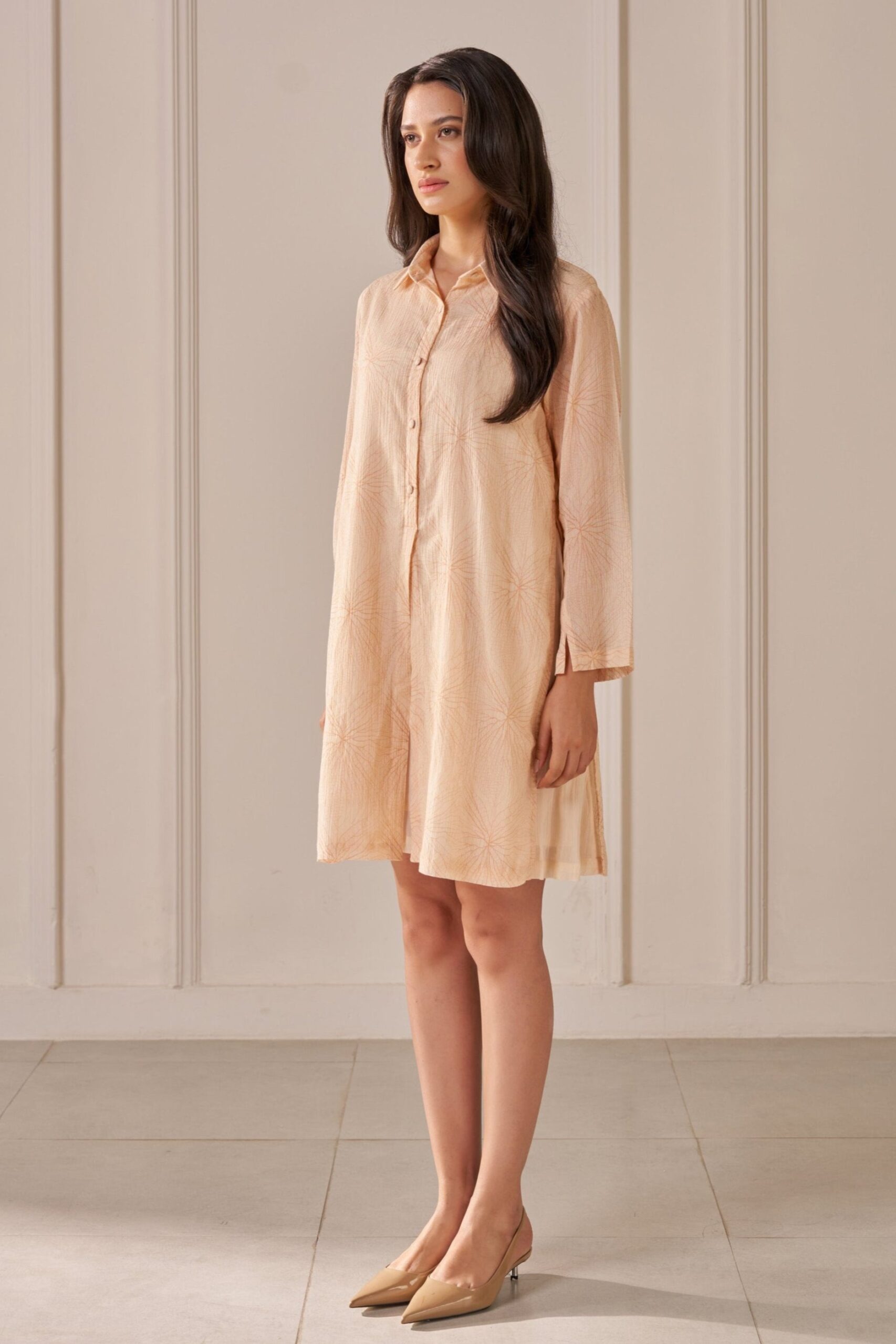 Introducing an elegant soft peach dress crafted from printed crepe cotton. This stunning piece boasts a straight fit and a layered knee-length design, perfect for any occasion. The classic shirt collar and two-piece sleeves add a touch of sophistication, while the button placket enhances its refined look. Enjoy the perfect blend of style and comfort with this timeless dress._x000D_