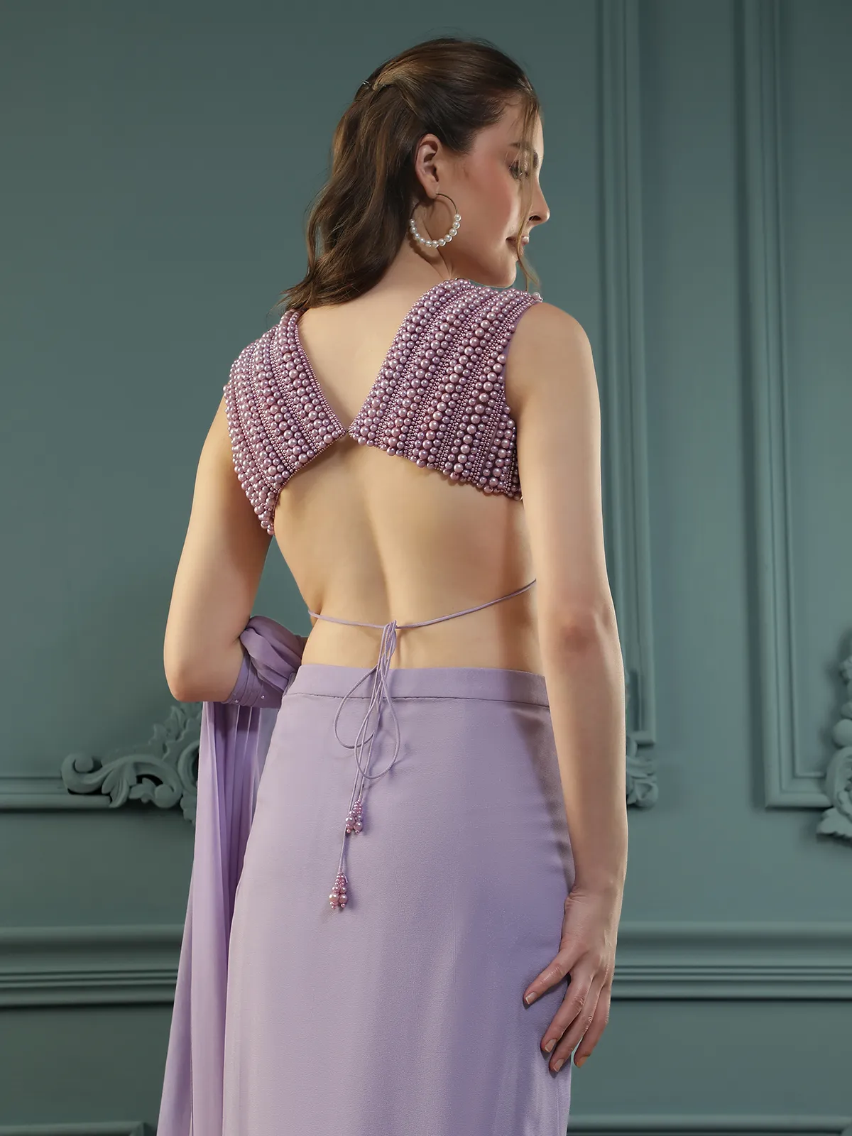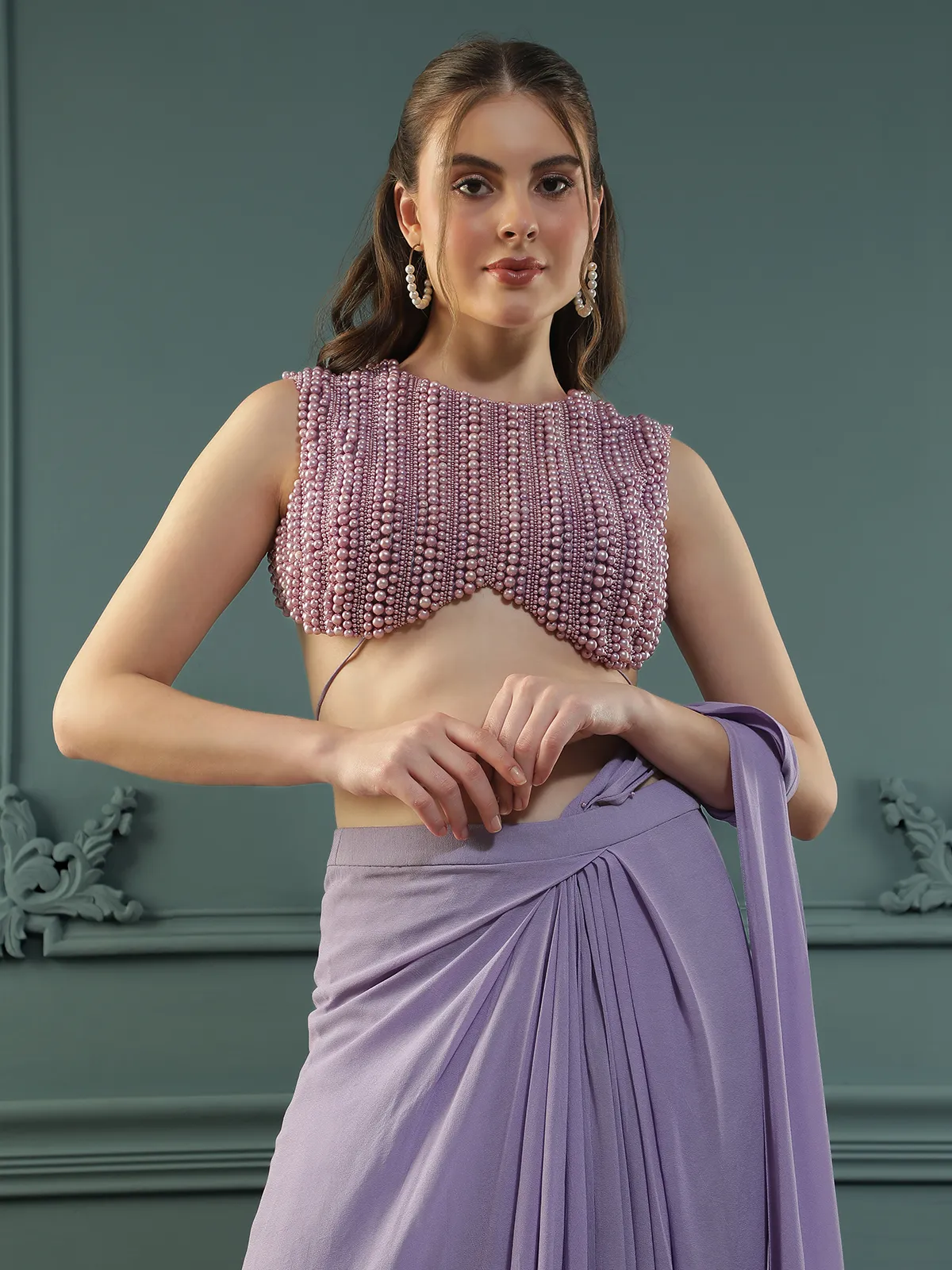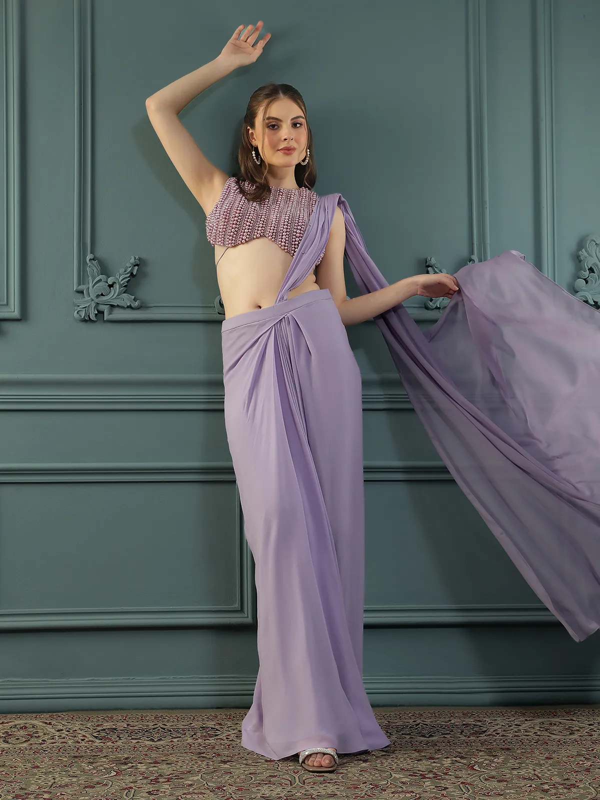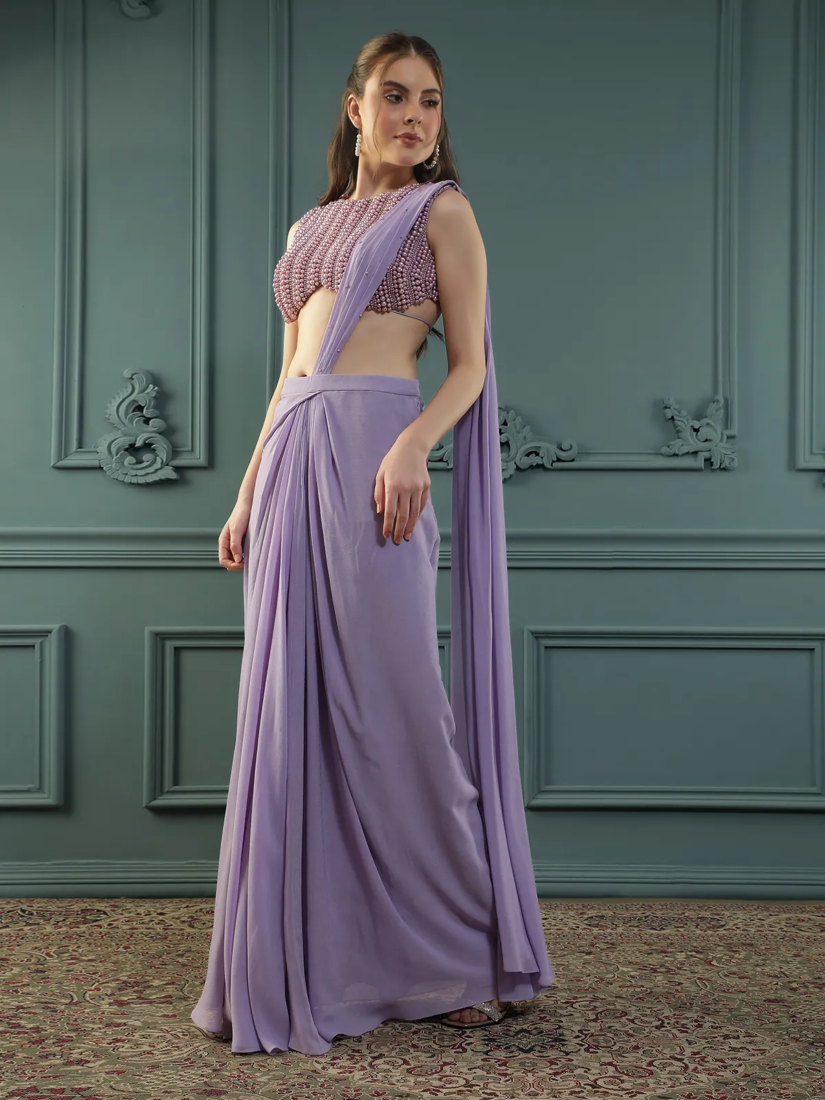 Style this soft purple pre-draped saree with statement crystal or pearl earrings, strappy metallic heels, and a sleek clutch for a sophisticated look.