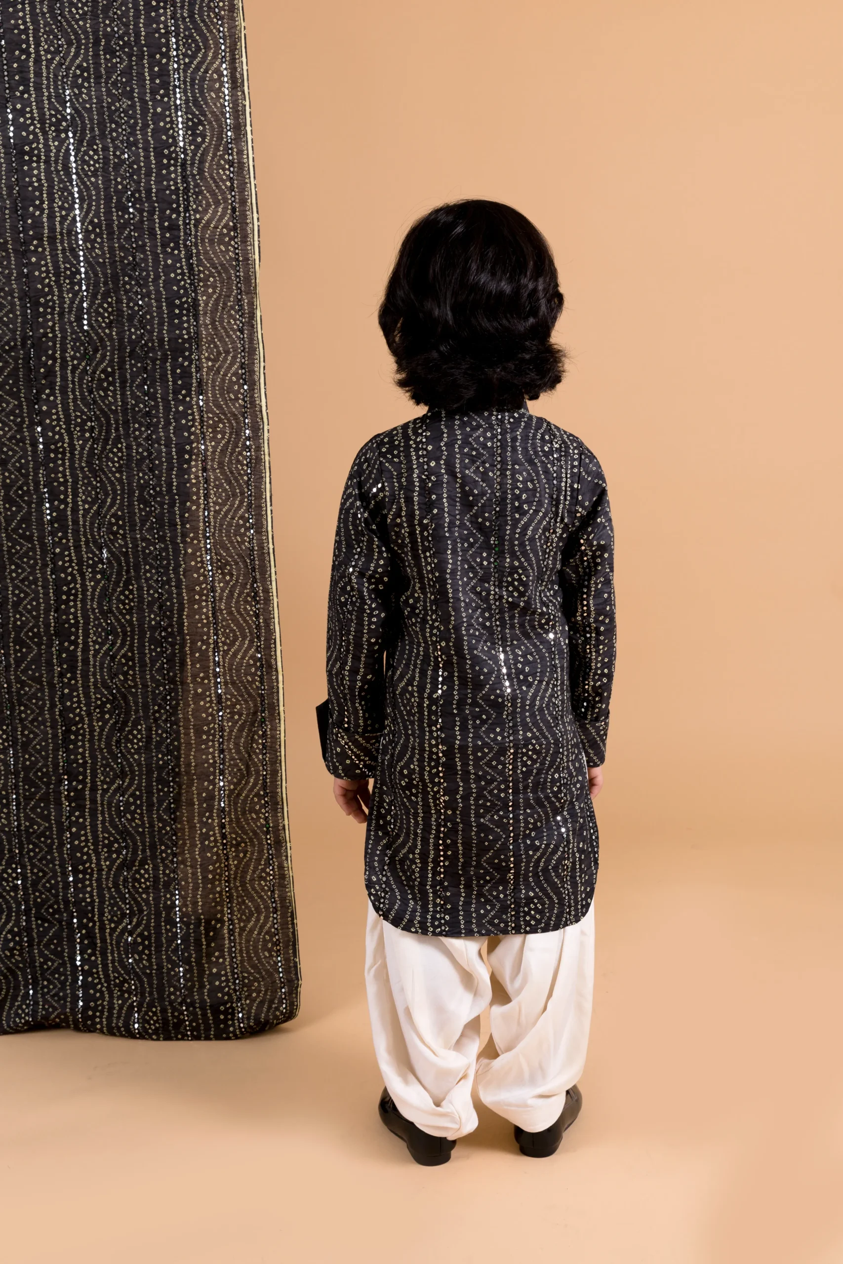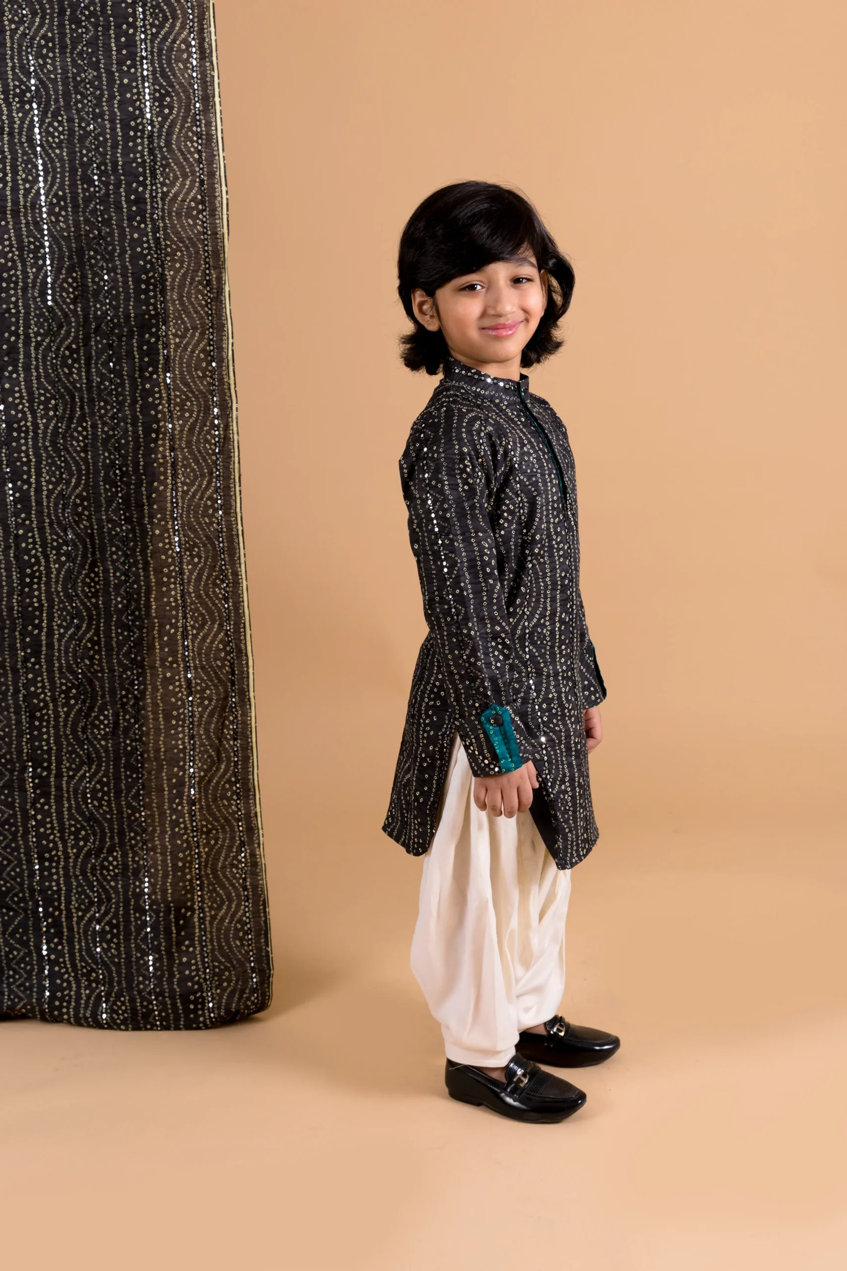 Black Bandhani Cotton Pathani Kurta Salwar Set with Faux Mirror Detailing for Boys
