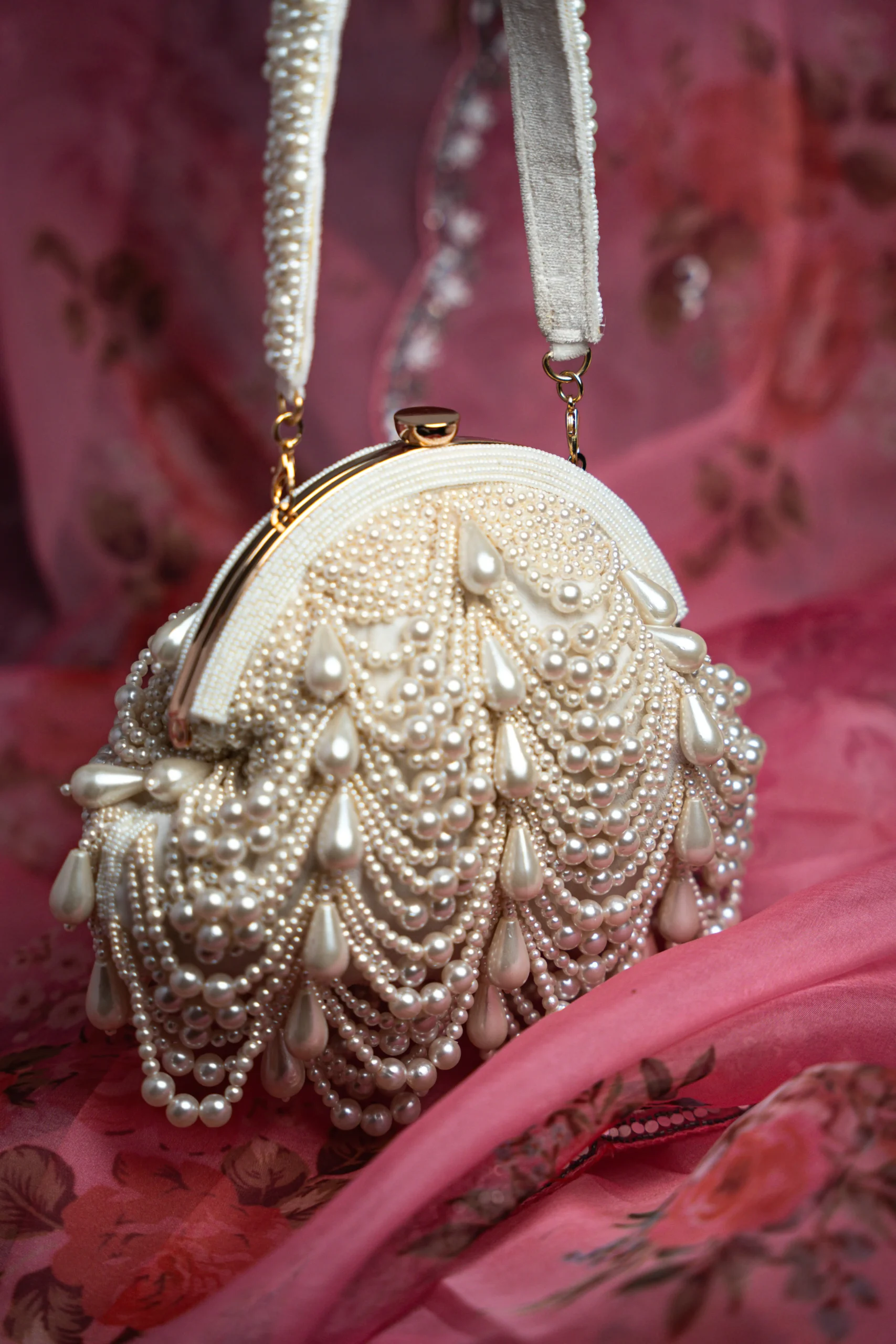 Style this suede gold clutch with embroidered sarees, embellished lehengas, or elegant evening gowns for weddings, receptions, and festive celebrations. The pearl drops and gold bead detailing add a refined statement, making it perfect to pair with pearl jewelry, metallic heels, and classic silhouettes for a sophisticated look.