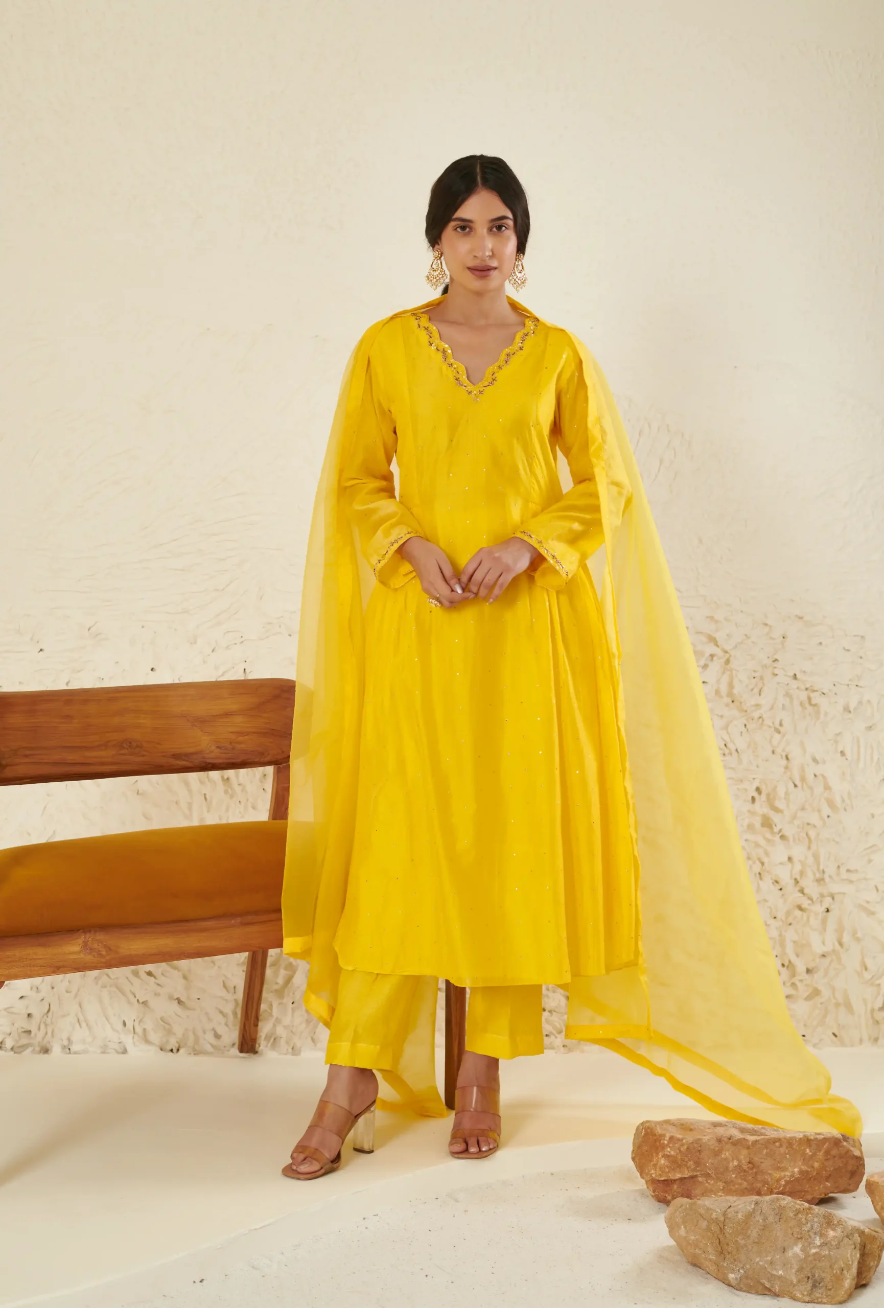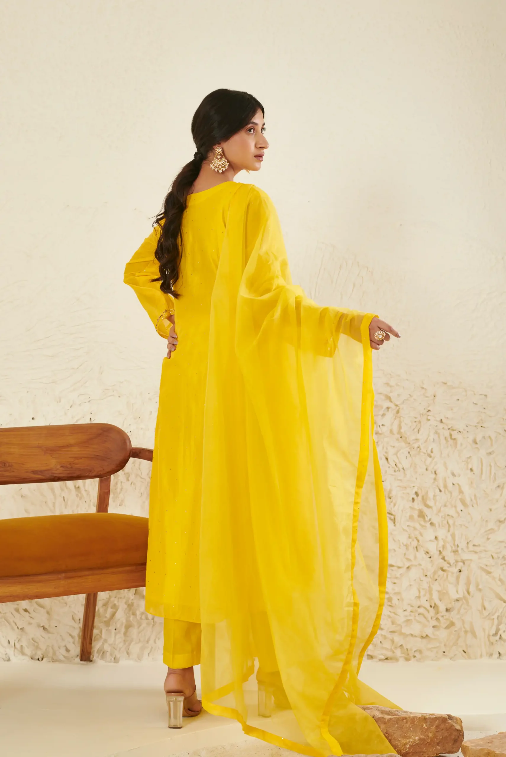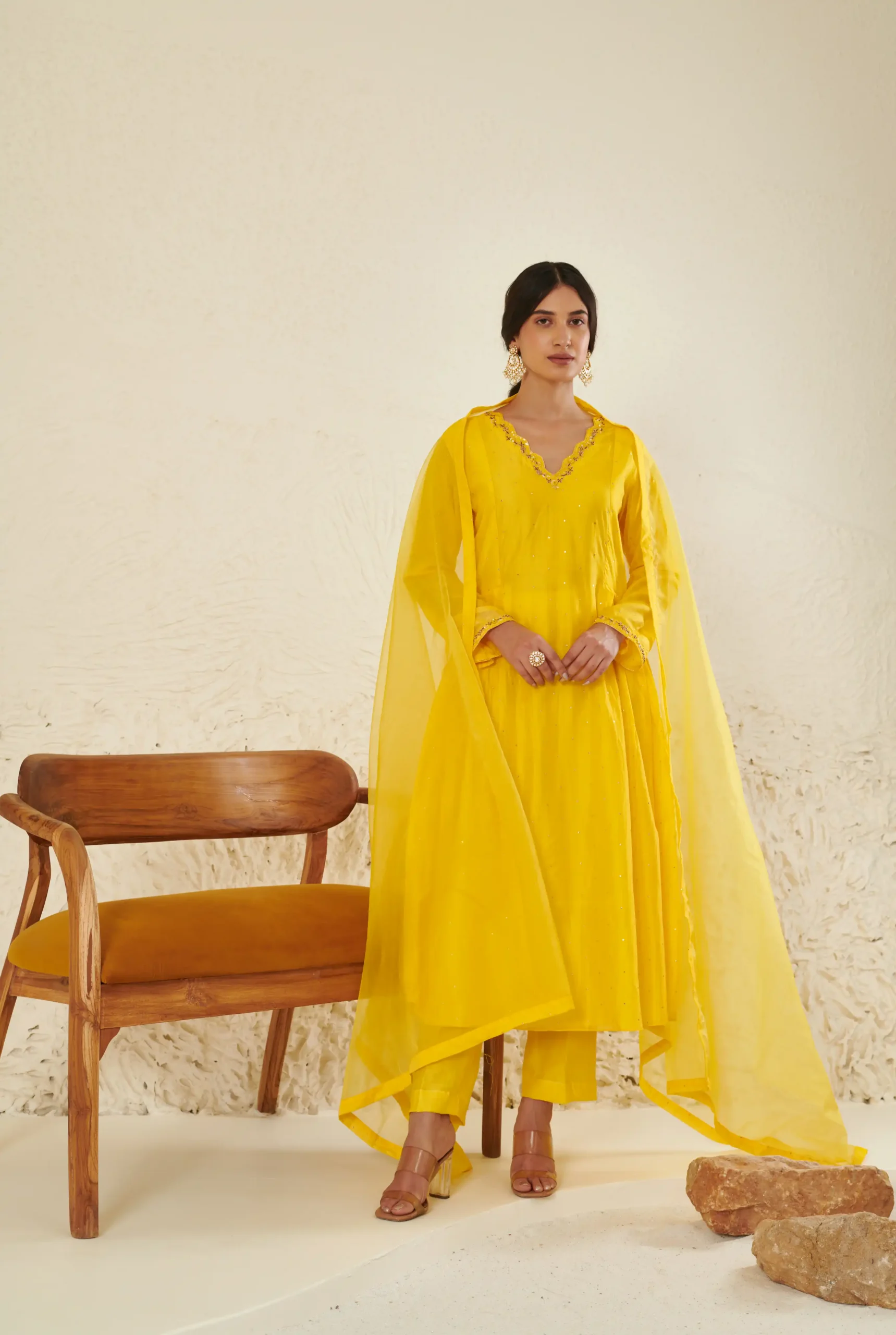 Style this radiant yellow Chanderi kurta set with statement kundan or pearl earrings to enhance the intricate neckline. Pair it with gold heels or traditional juttis for a festive touch. Opt for soft glowing makeup with warm tones and finish the look with a sleek bun or soft curls for a graceful ethnic appeal.