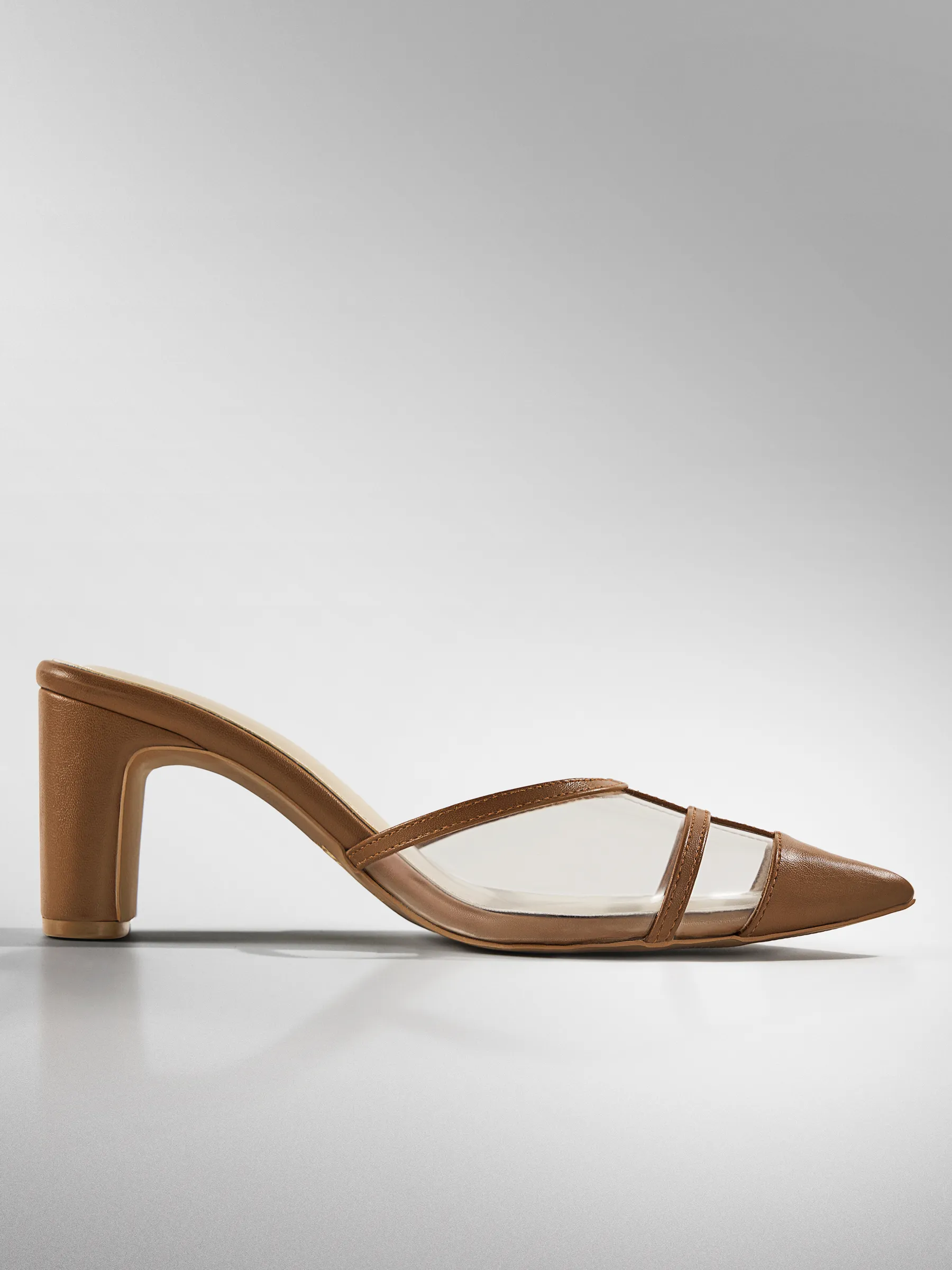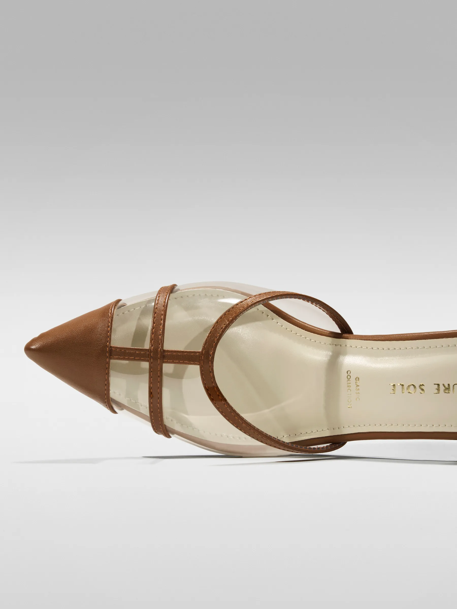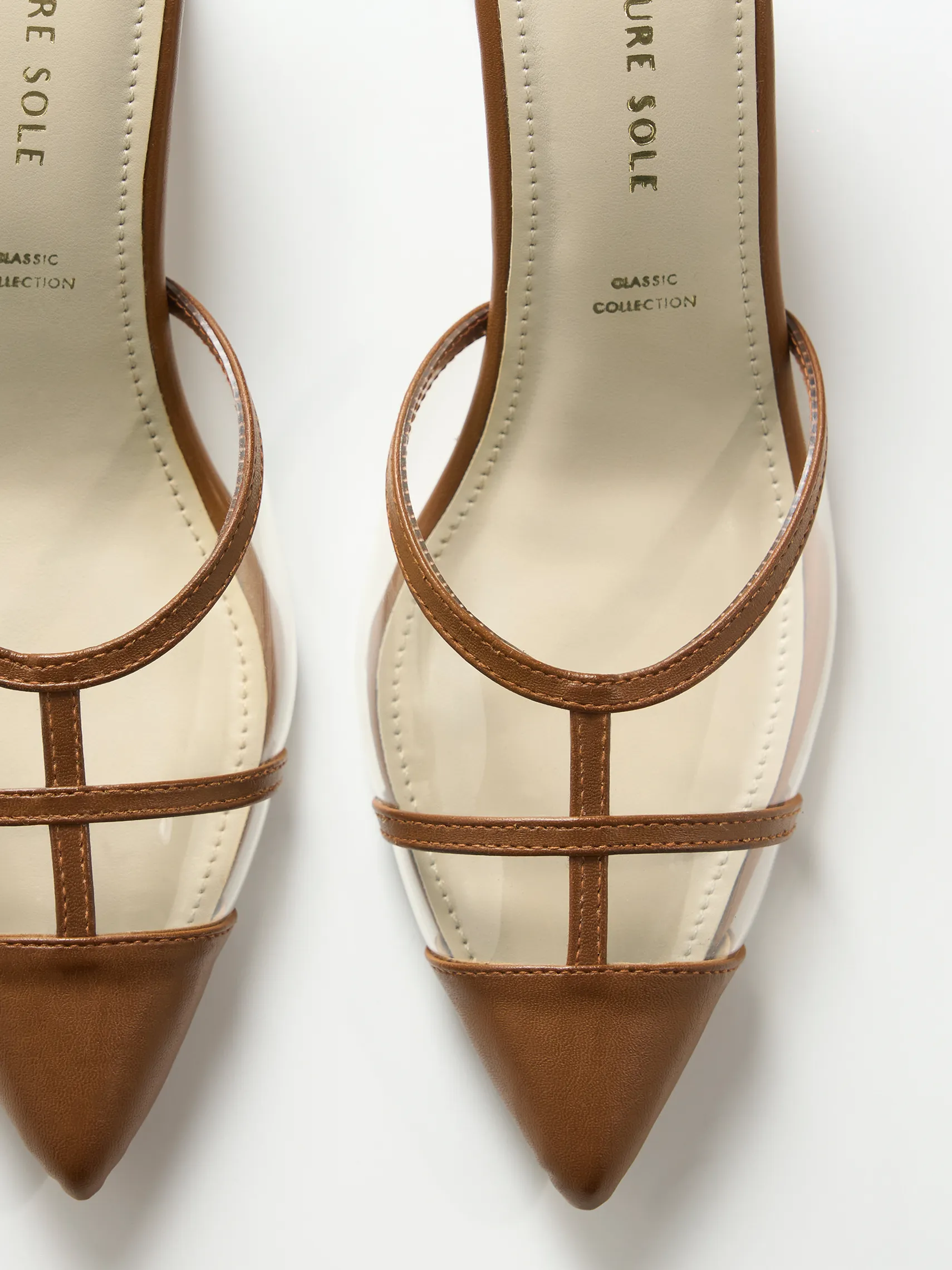 Featuring T-strap cage grid with clear transparent panels and cap toe in faux leather, this Tan Cage Slingback Kitten Heel brings modern detailing.