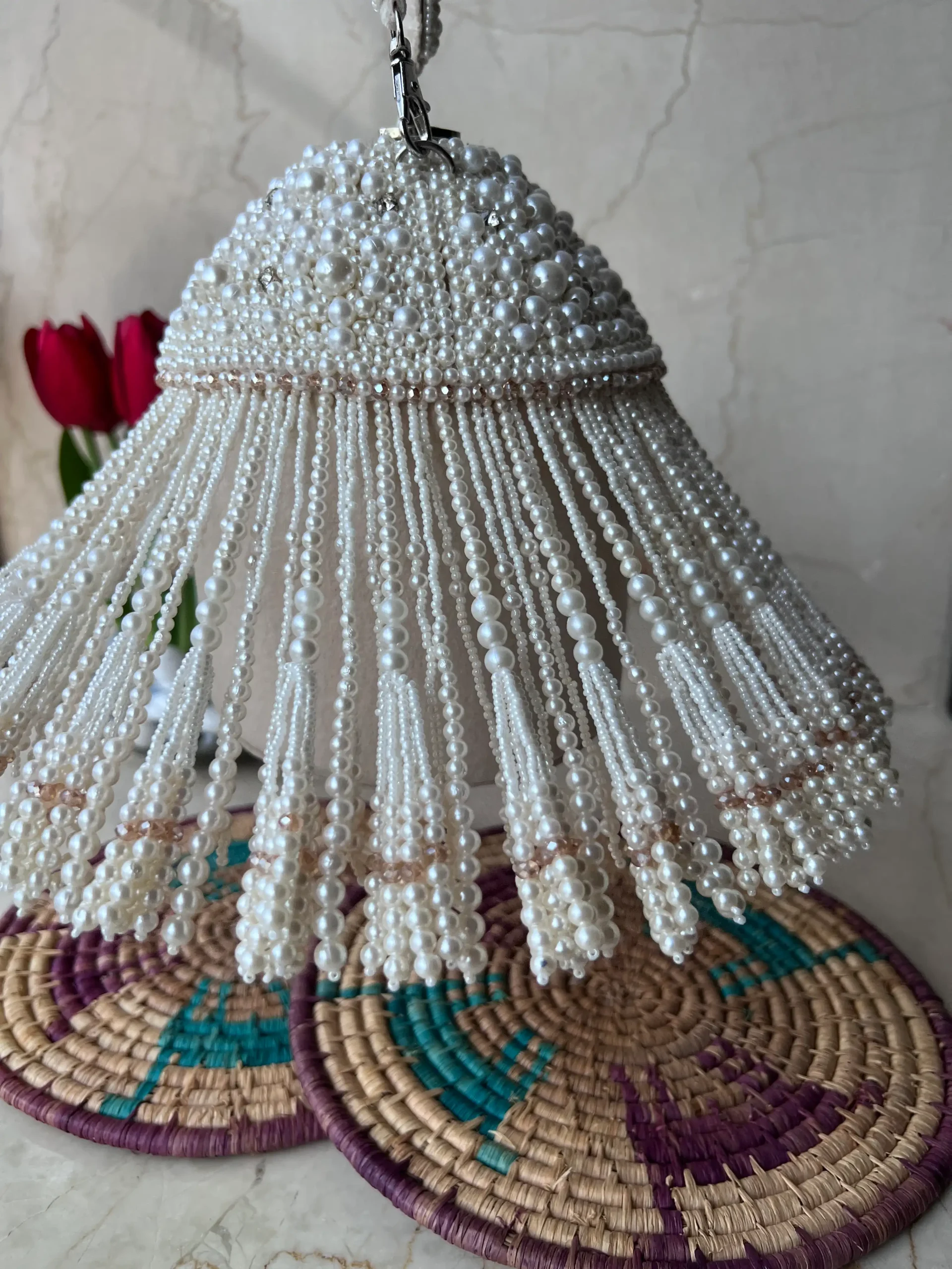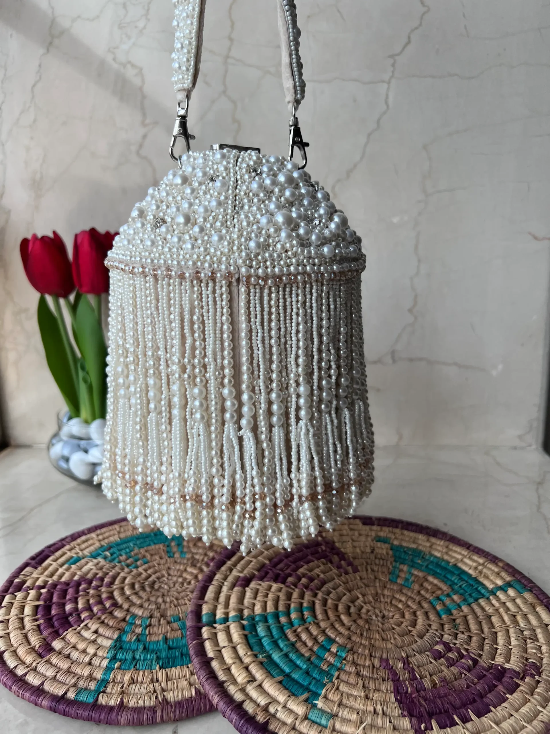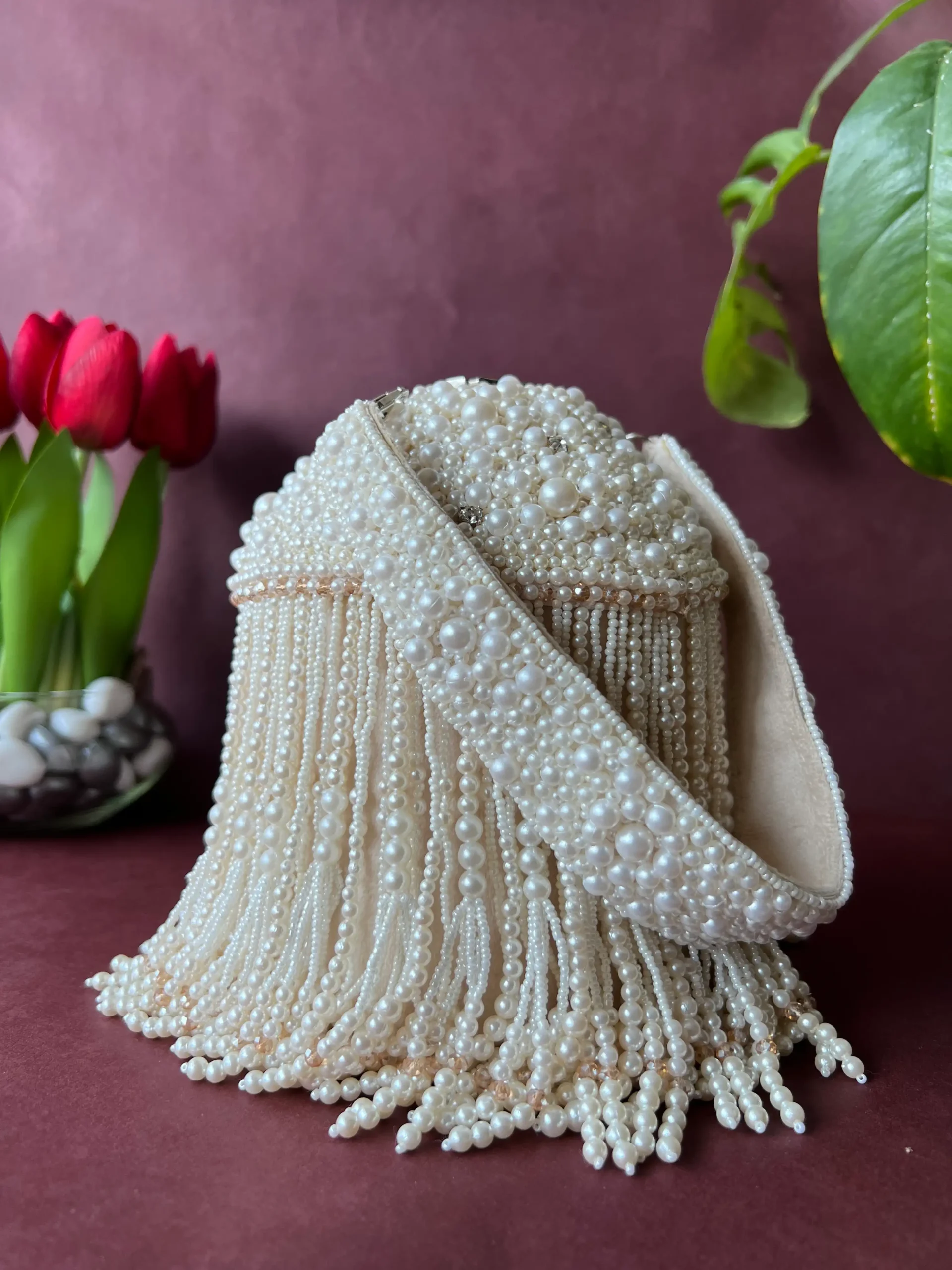 Introducing a refined tan velvet potli designed to bring effortless elegance to any occasion. Crafted on a rich velvet base, it features a delicate scallop of dainty pearls that adds a graceful and sophisticated touch to the design. The soft tan hue offers timeless versatility, making it suitable for both day and evening events. Perfect for weddings, festive celebrations, and elegant gatherings, this potli complements traditional and contemporary ensembles with understated charm.