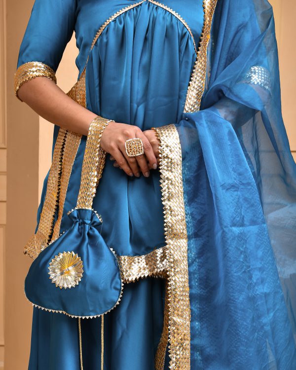 Introducing a teal blue satin silk lehenga set featuring a short kurta with a V-neckline and gota lace detailing, paired with a flowing satin silk lehenga. The look is completed with a teal blue organza dupatta with gota lace and a coordinating potli.