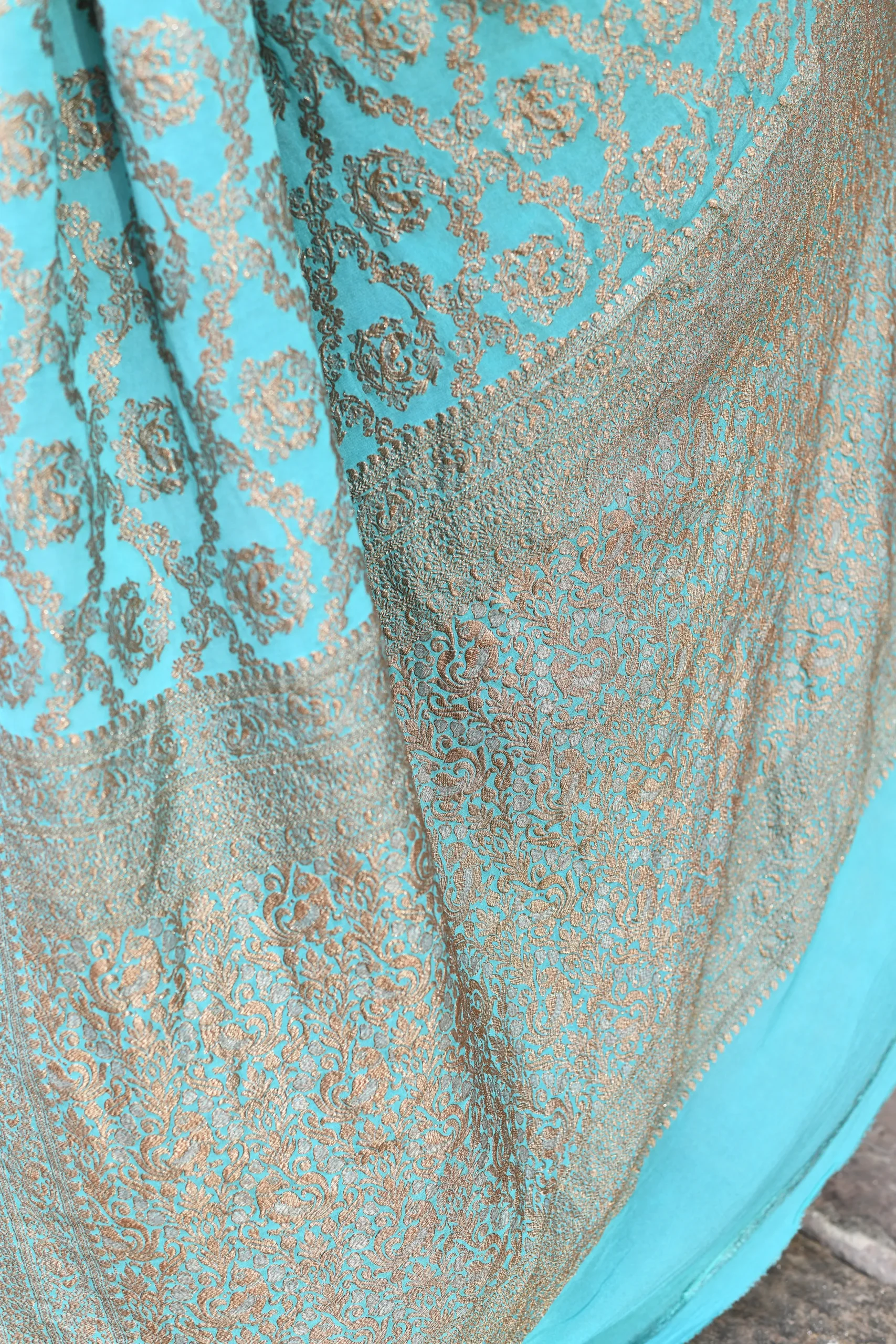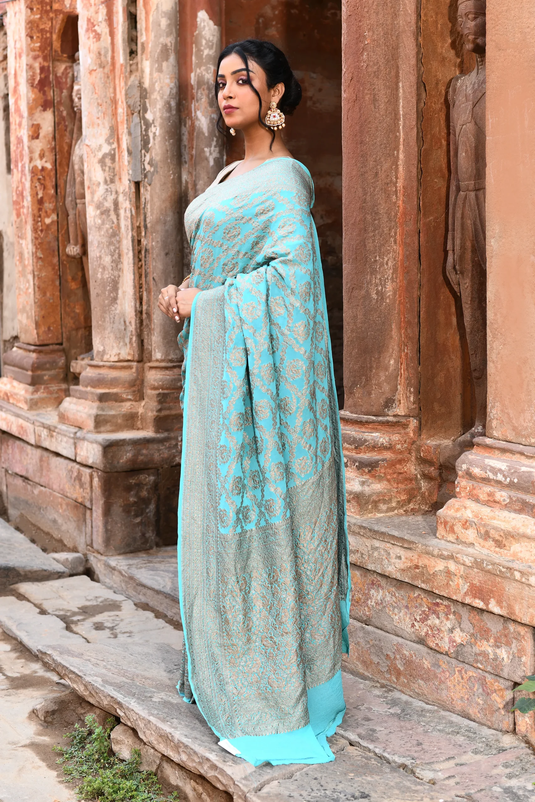 Teal Green Silk Saree with Gold Zari Flower Jaal & Contrast Palla