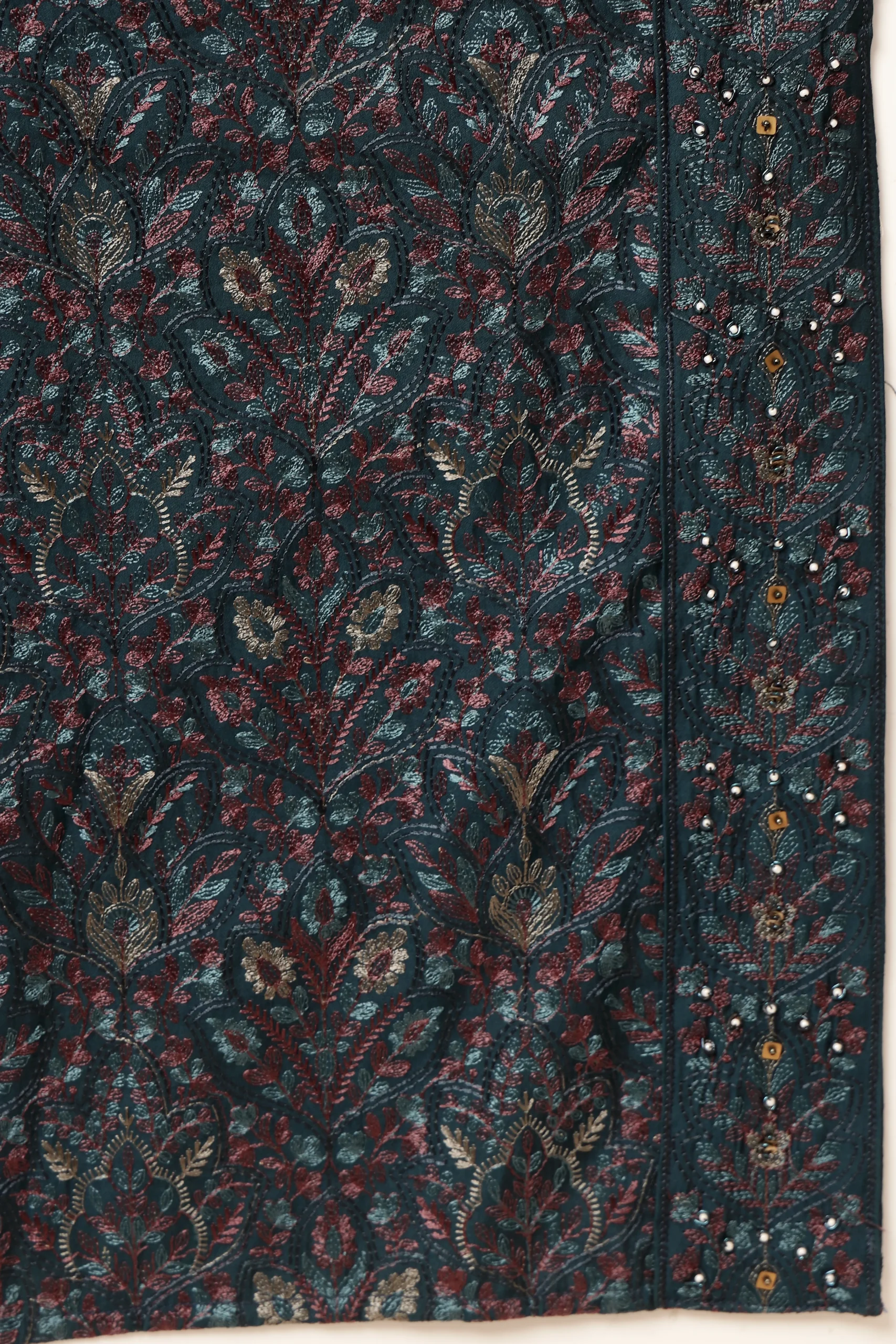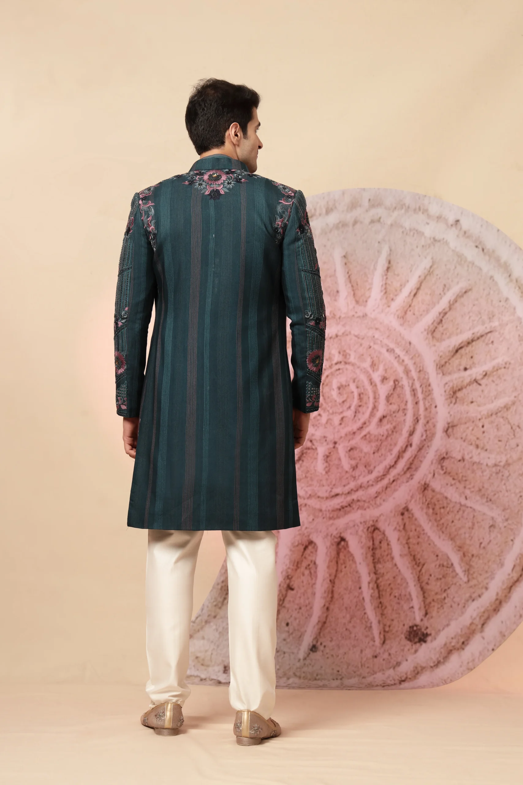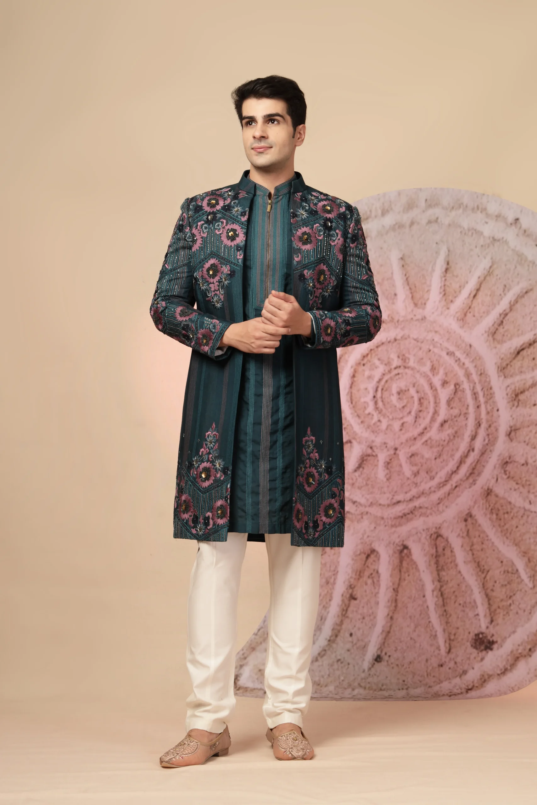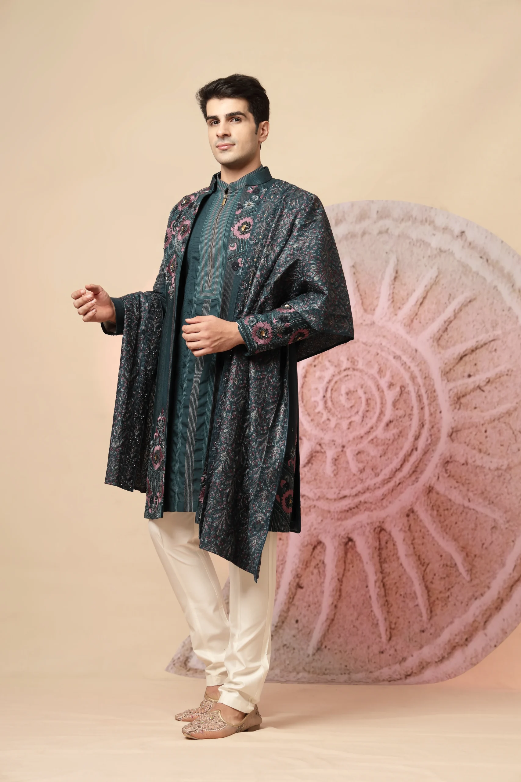 Introducing a sophisticated teal Indo-Western kurta set that blends modern elegance with traditional artistry. Crafted for refined festive wear, the jacket-style kurta features delicate floral embroidery on the shoulders and chest in soft contrasting tones. Designed with a mandarin collar and concealed placket, it is paired with an intricately patterned shawl and ivory trousers—perfect for weddings, receptions, and celebratory occasions.