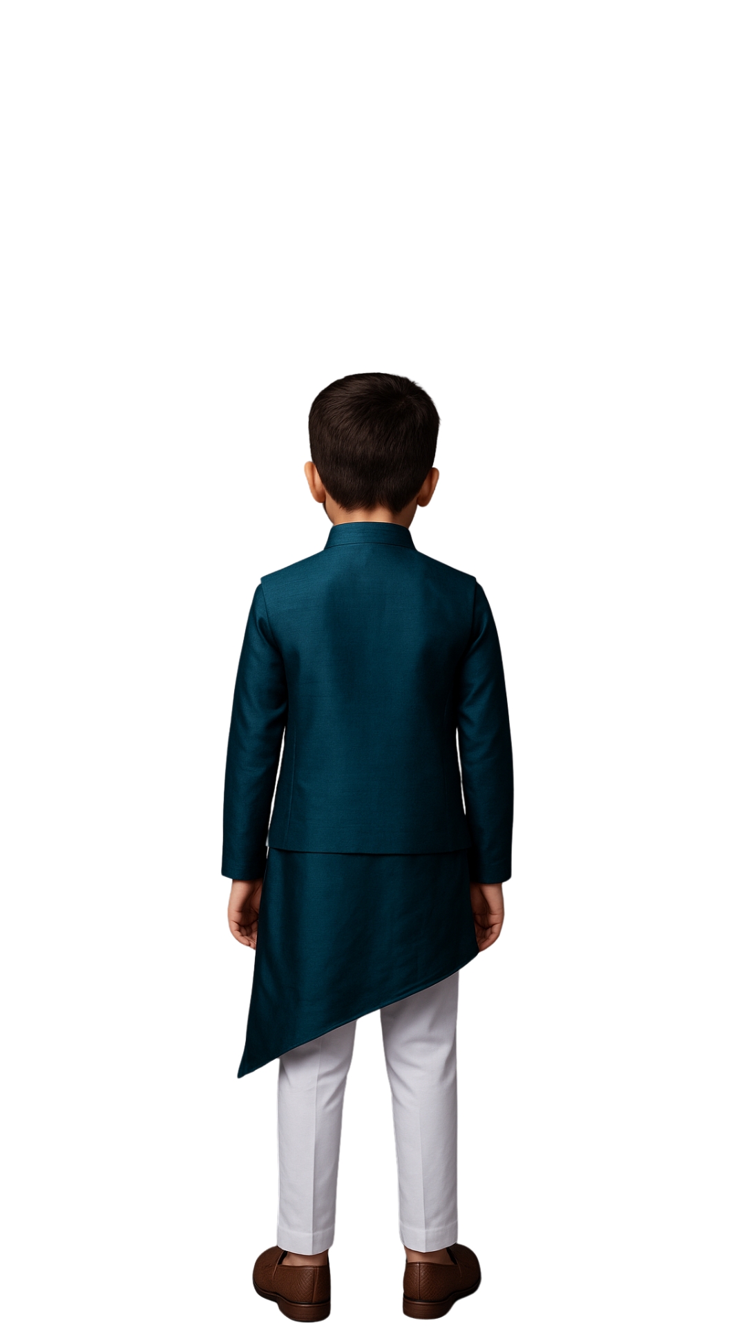 Introducing a teal nehru jacket for boys in luxurious bamberg silk, adorned with intricate embroidery depicting nature, lotus ponds, and royal figures. Paired with a matching bamberg silk kurta and cotton pants, this ensemble offers a festive and regal traditional look, perfect for special occasions.