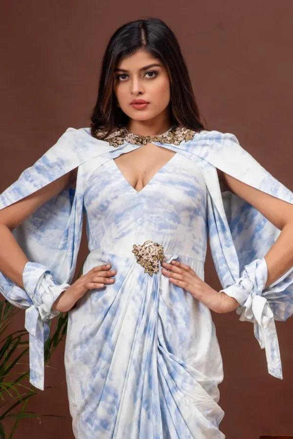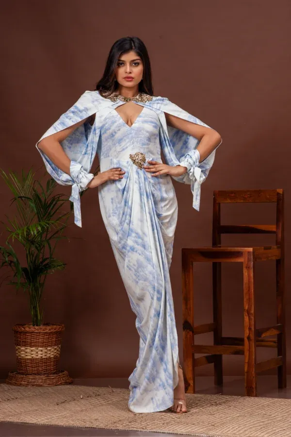 Kumar Rahul presents a captivating tie-dyed cotton cowl gown, featuring exquisite placement embroidery and stylish tied-up open balloon sleeves. This unique design beautifully blends contemporary aesthetics with artistic detailing.