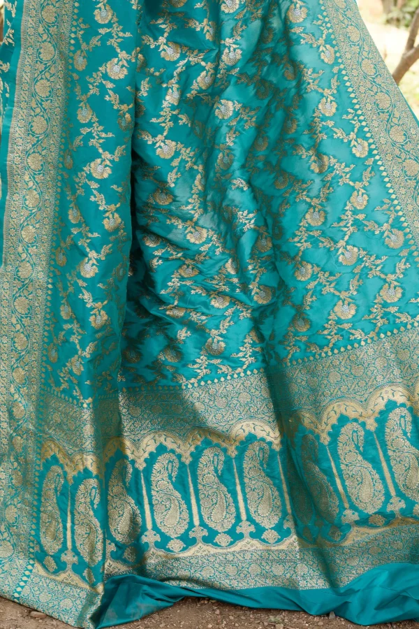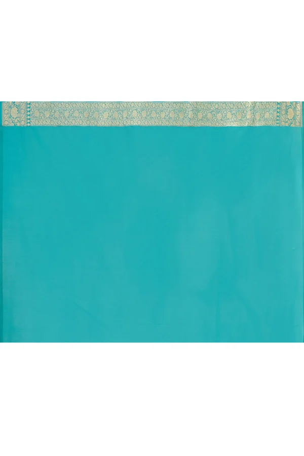Introducing a turquoise green Banarasi soft silk saree, handwoven with classic artistry. Featuring all-over traditional motifs delicately woven in antique gold zari, it is enhanced by a heavily woven traditional border and pallu enriched with rich gold zari, creating a regal and festive elegance. Comes with a matching running blouse piece.