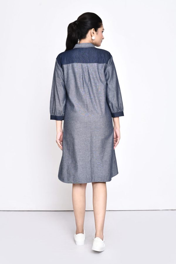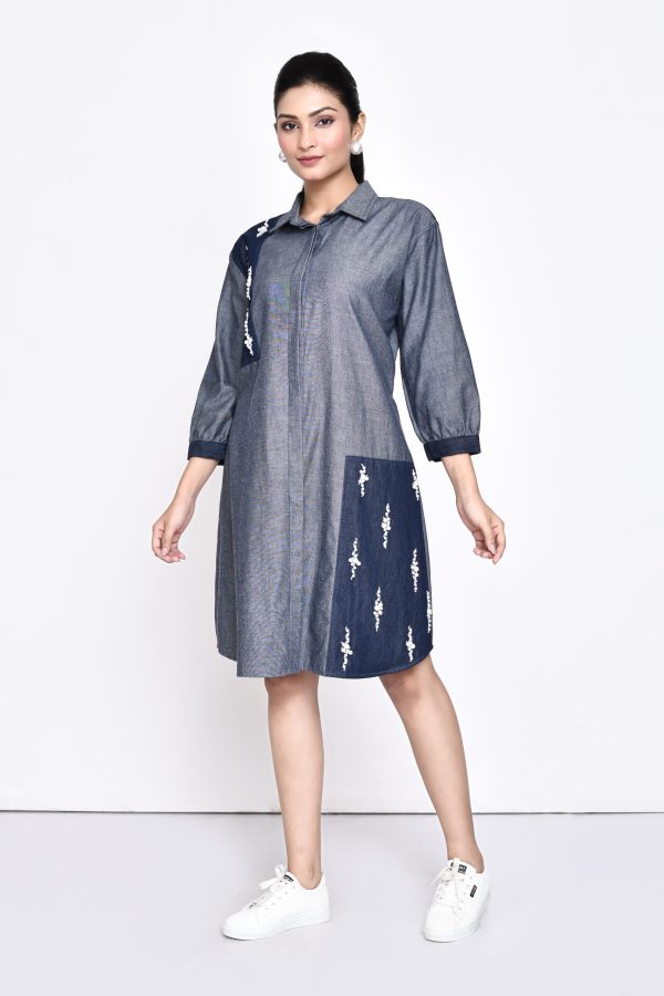 Presenting a comfortable two-toned panelled denim shirt dress, designed to make a stylish statement. Adorned with elegant pearl embellishments, this dress combines classic denim with a modern twist. The unique panelling adds visual interest while ensuring a flattering fit, making it a versatile addition to your wardrobe.