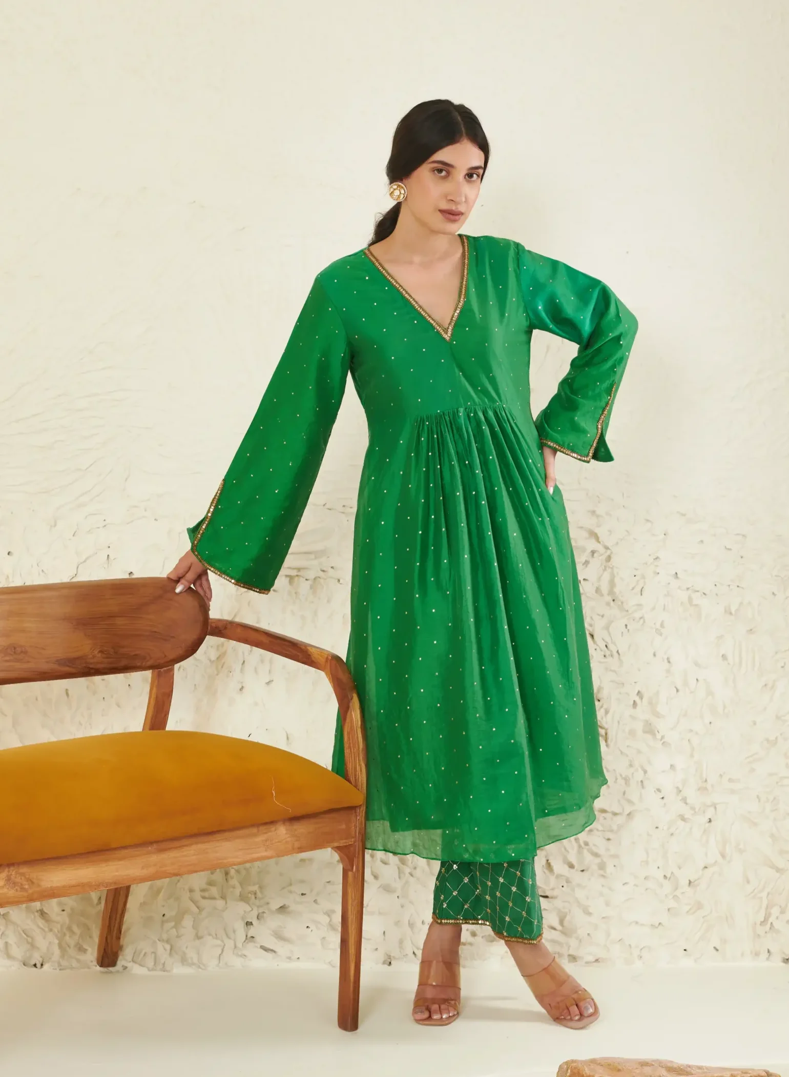 This velvet kurta set features intricate gold embroidery and subtle sequin detailing, paired with embroidered pants and a matching dupatta. Designed with a rich, regal silhouette, it offers timeless elegance and refined craftsmanship, making it ideal for festive celebrations, evening gatherings, and wedding occasions.