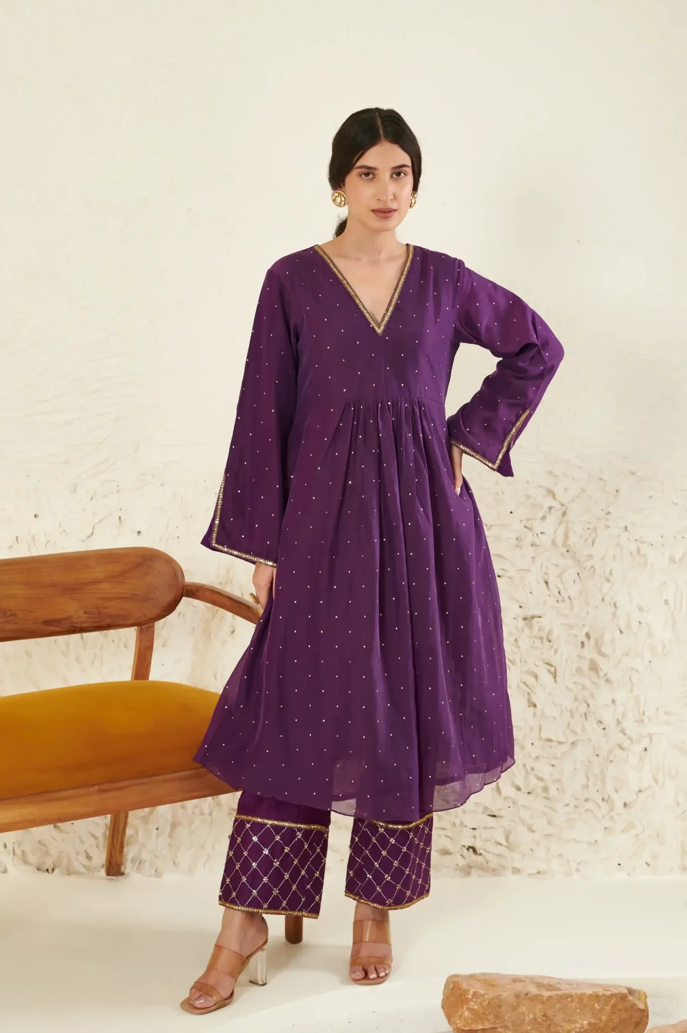 Royal Purple Kurta Palazzo Set with Gold Embroidery, Flared Palazzo and Dupatta for Festive Wear from Golden Muslin By Satya JB