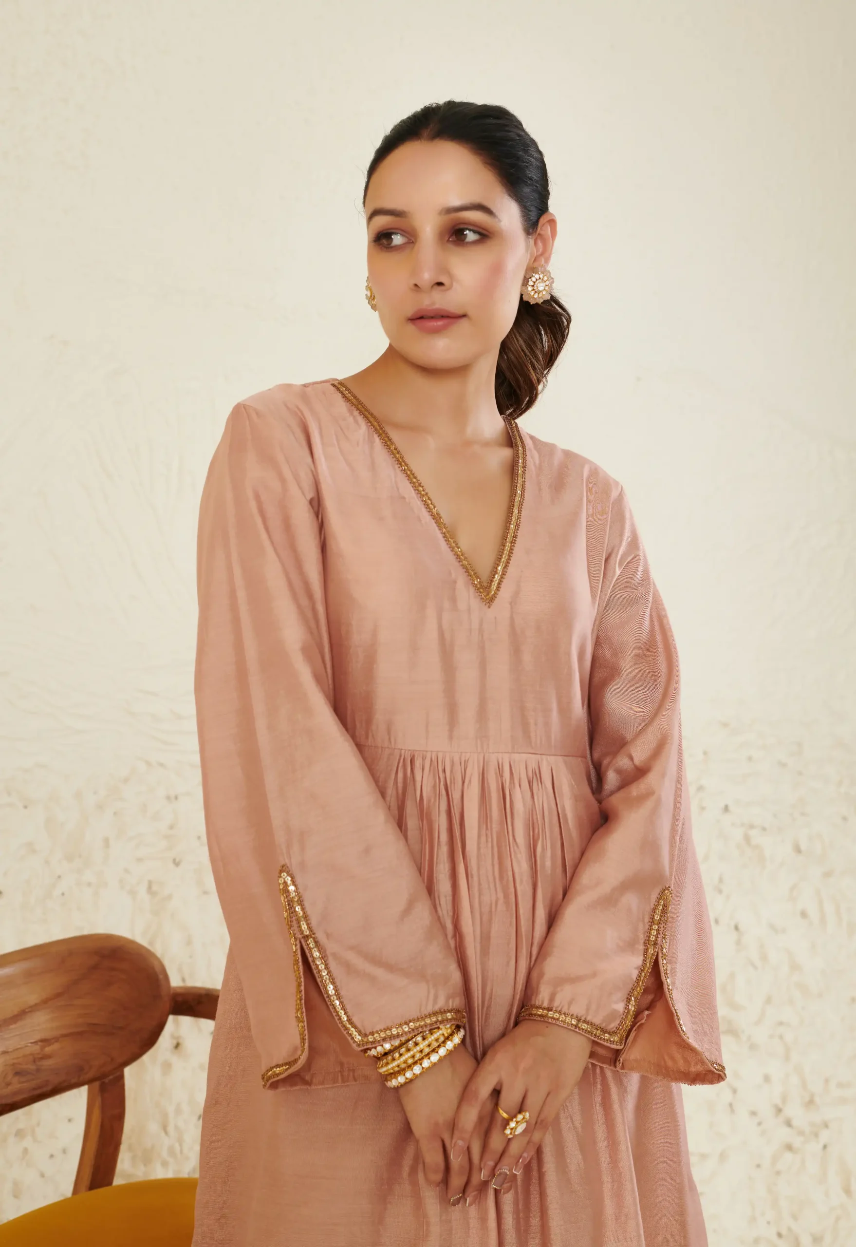 Dusty Rose Kurta Sharara Set with Silver Floral Embroidery, Flared Sharara and Organza Dupatta from Golden Muslin By Satya JB