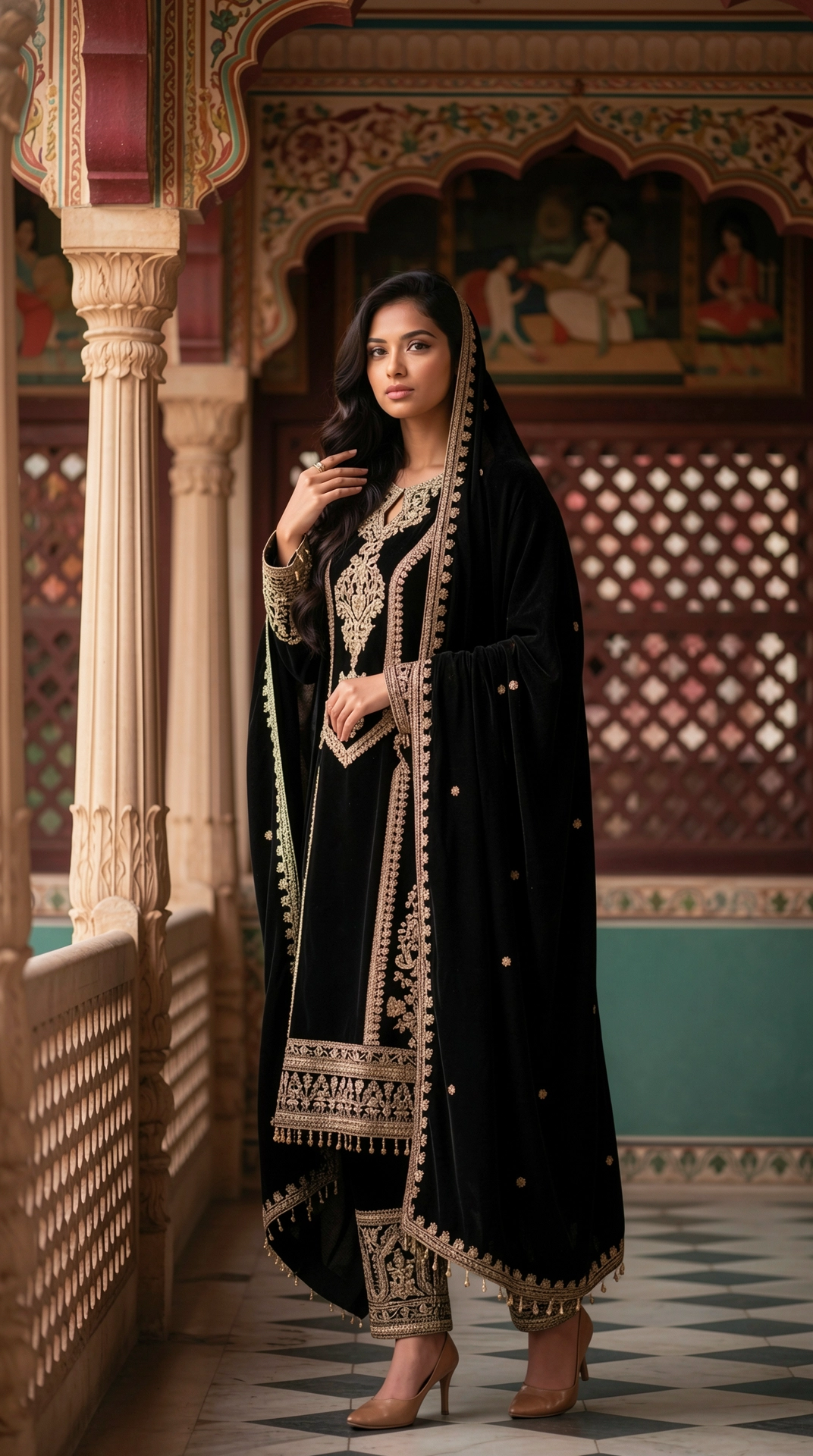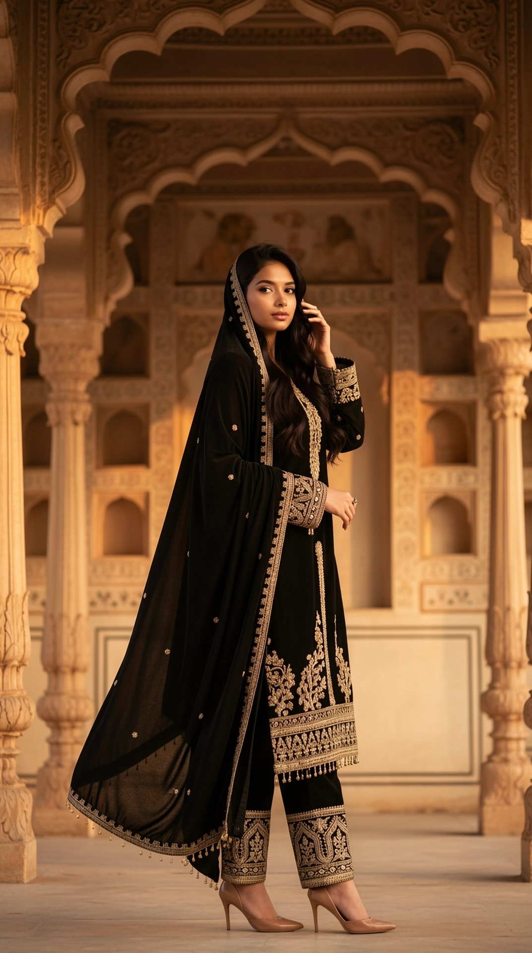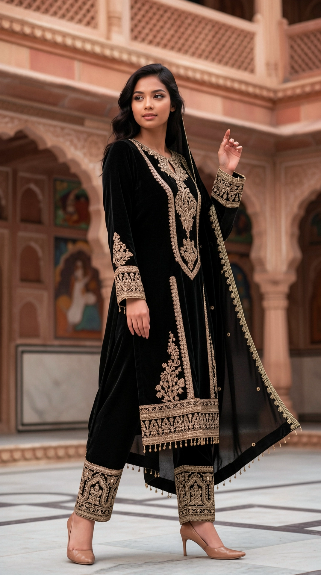 This velvet kurta set features intricate gold embroidery and subtle sequin detailing, paired with embroidered pants and a matching dupatta. Designed with a rich, regal silhouette, it offers timeless elegance and refined craftsmanship, making it ideal for festive celebrations, evening gatherings, and wedding occasions.