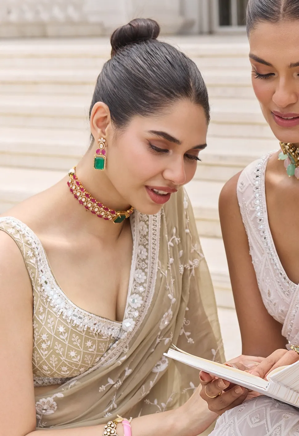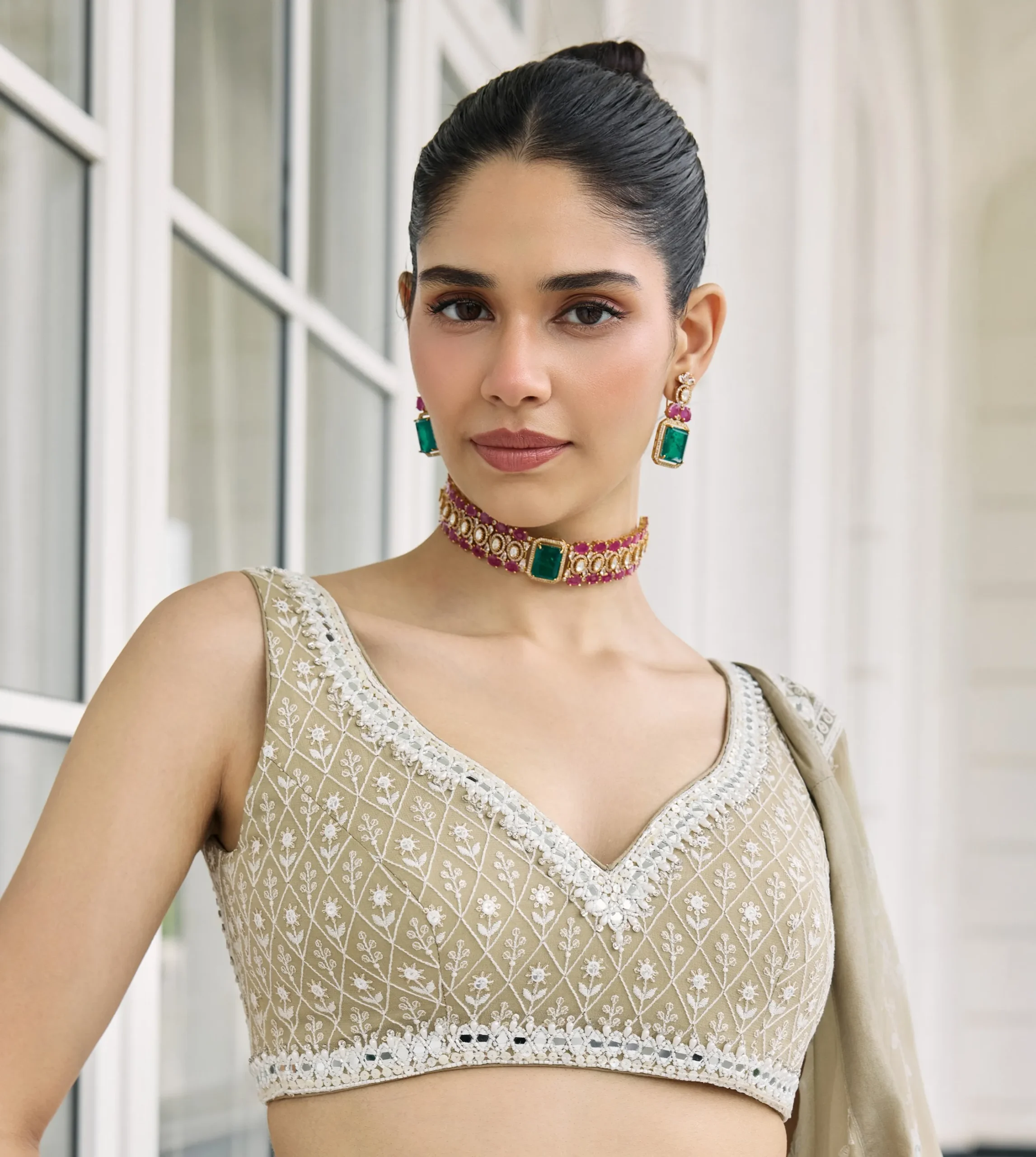 Style this striking choker with deep neckline blouses, lehengas, or sarees to highlight its emerald centerpiece. Pair it with matching emerald studs or minimal earrings and sleek hairstyles for weddings, festive celebrations, receptions, or elegant evening occasions.