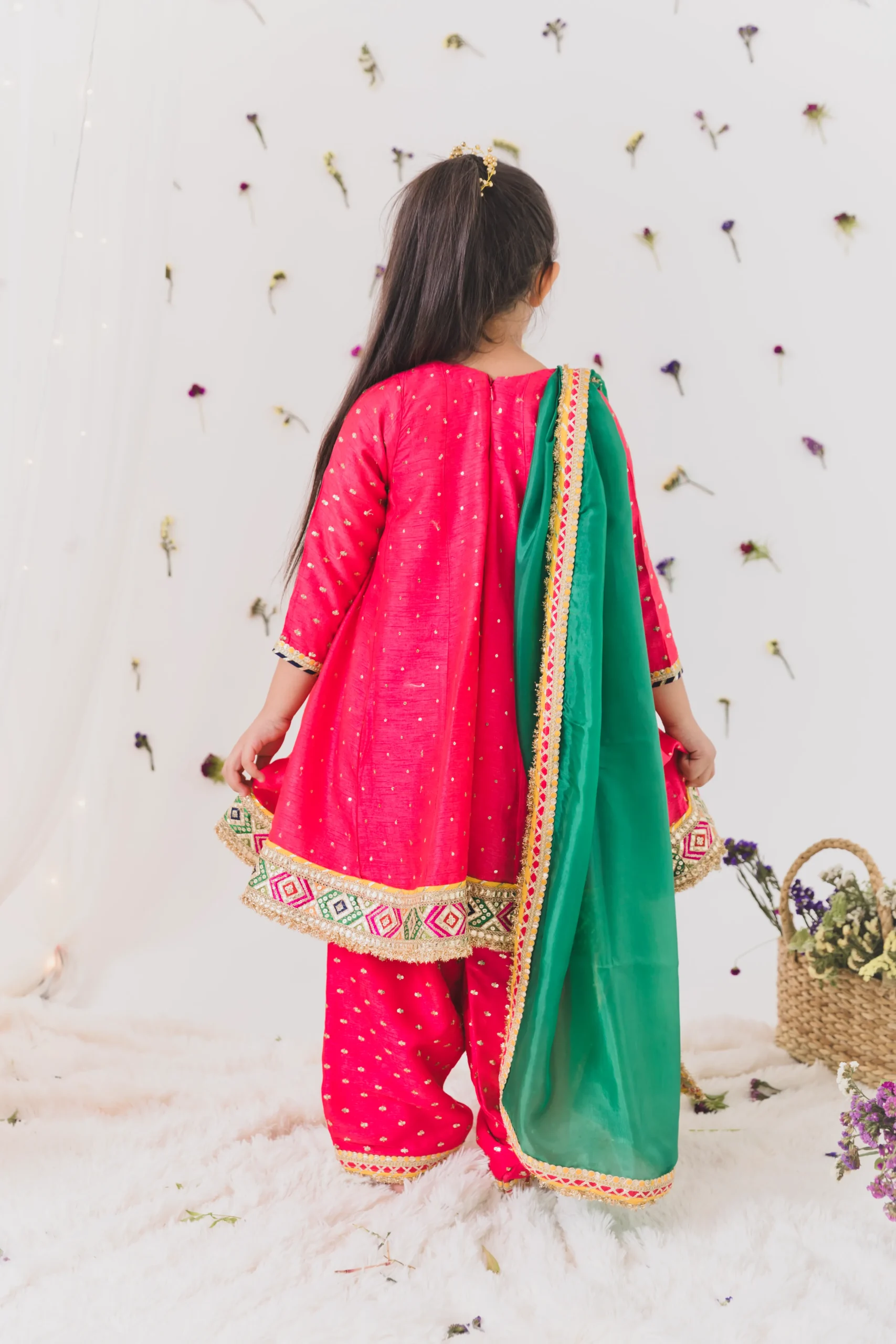 Hot Pink Silk Kurta Salwar Set for Girls with Contrast Dupatta