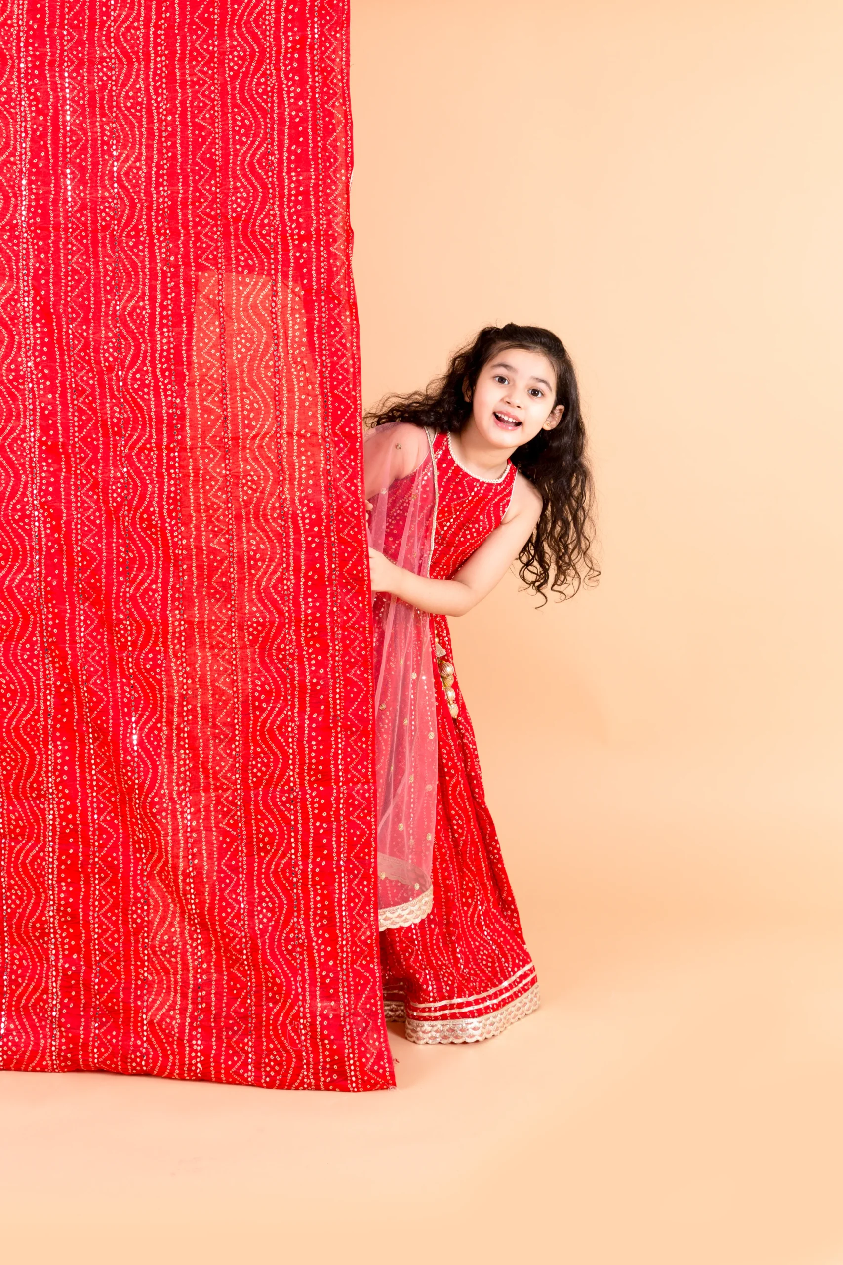 Introducing our vibrant Red Bandhani Lehenga Set, crafted in breathable cotton for a perfect blend of tradition and comfort. Featuring a red bandhani print crop top with pearl detailing and delicate thread with faux mirror work, this ensemble is paired with a flared lehenga and contrast net dupatta. Finished with gota tassels, back hook closure, side zip, and soft mulmul lining, it ensures effortless festive elegance.