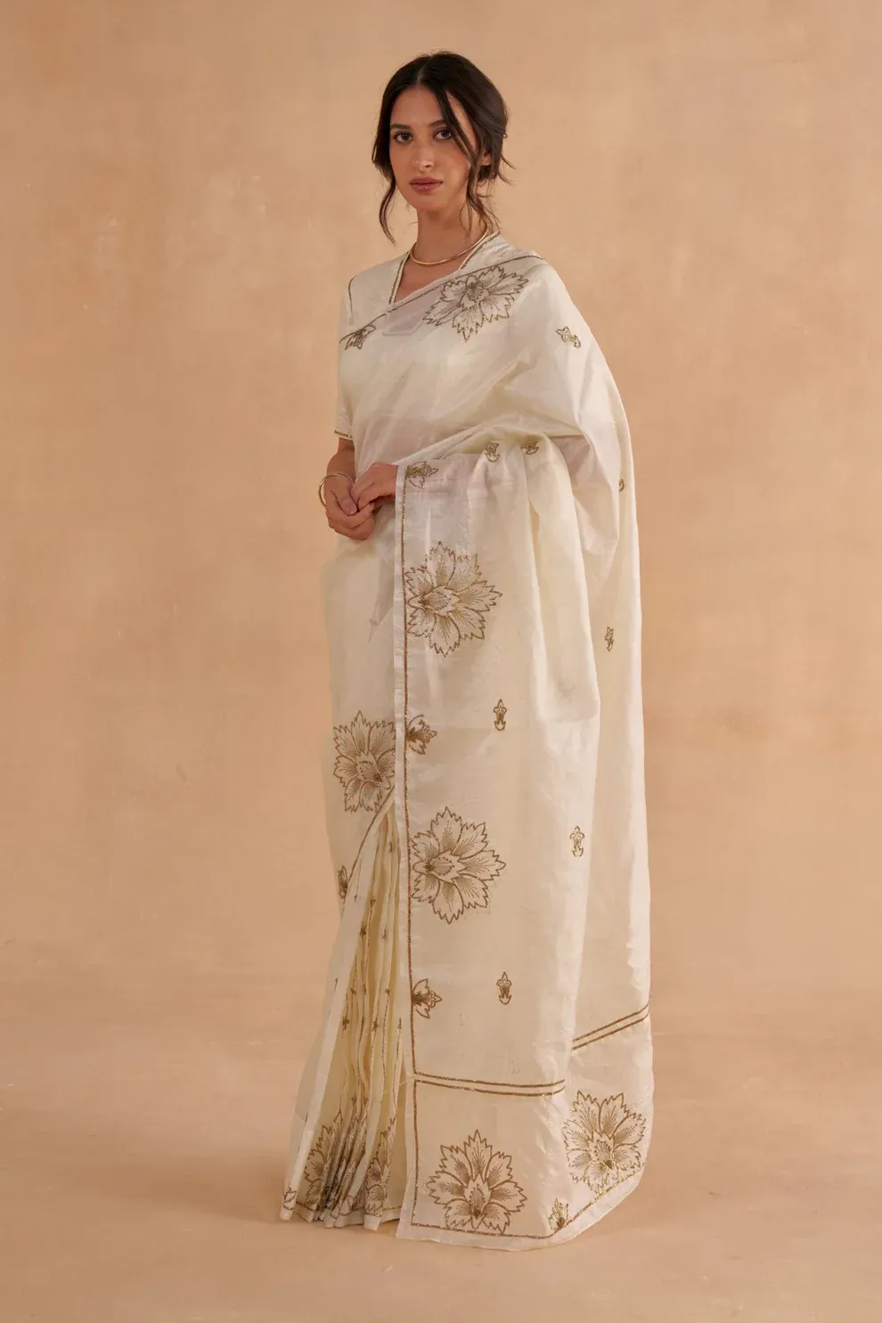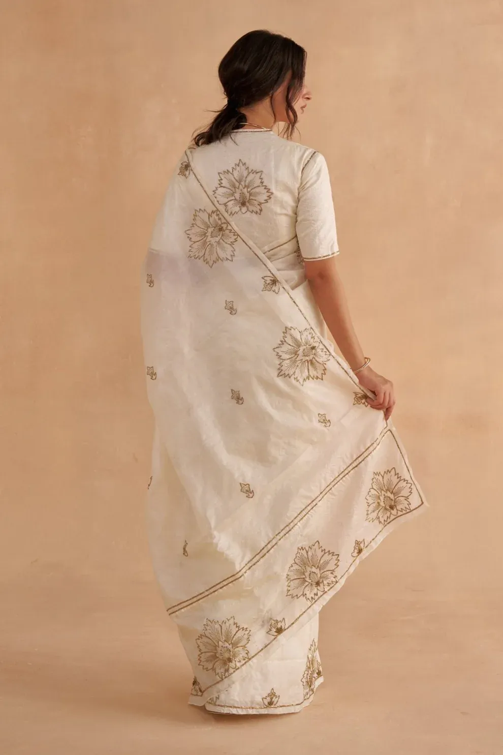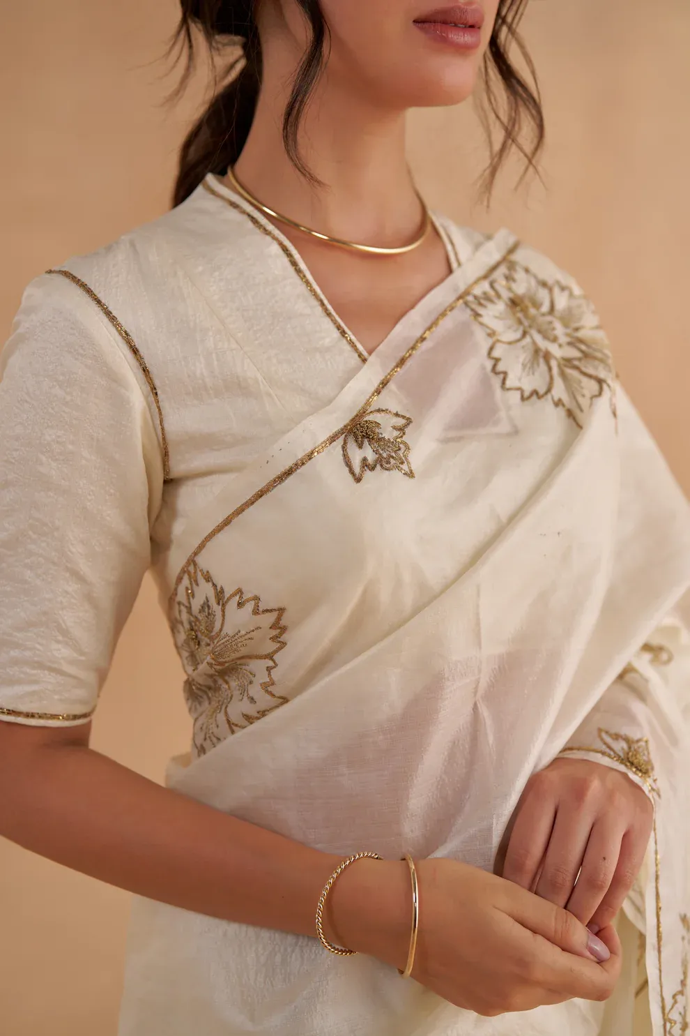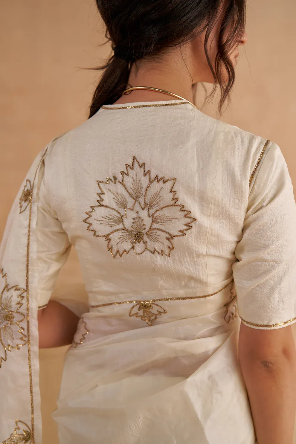 This statement saree in vintage ivory is crafted from one-of-a-kind Paper Tussar silk. Adorned with intricate gold Zardozi embroidery inspired by classic chintz patterns, it exudes timeless elegance. Delicate borders provide a sophisticated finish, making this saree a perfect choice for a special occasion. Paired with a statement blouse in vintage ivory Paper Tussar, the ensemble radiates understated elegance. Minimal embroidery along the sleeves and neckline adds a subtle touch of opulence, enhancing the rich combination of gold and ivory.