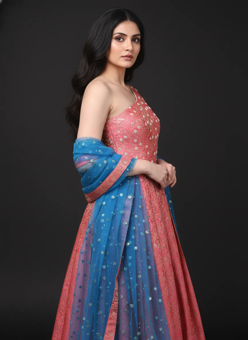 Watermelon Pink One-Shoulder Banarasi Gown with Blue Net Dupatta
