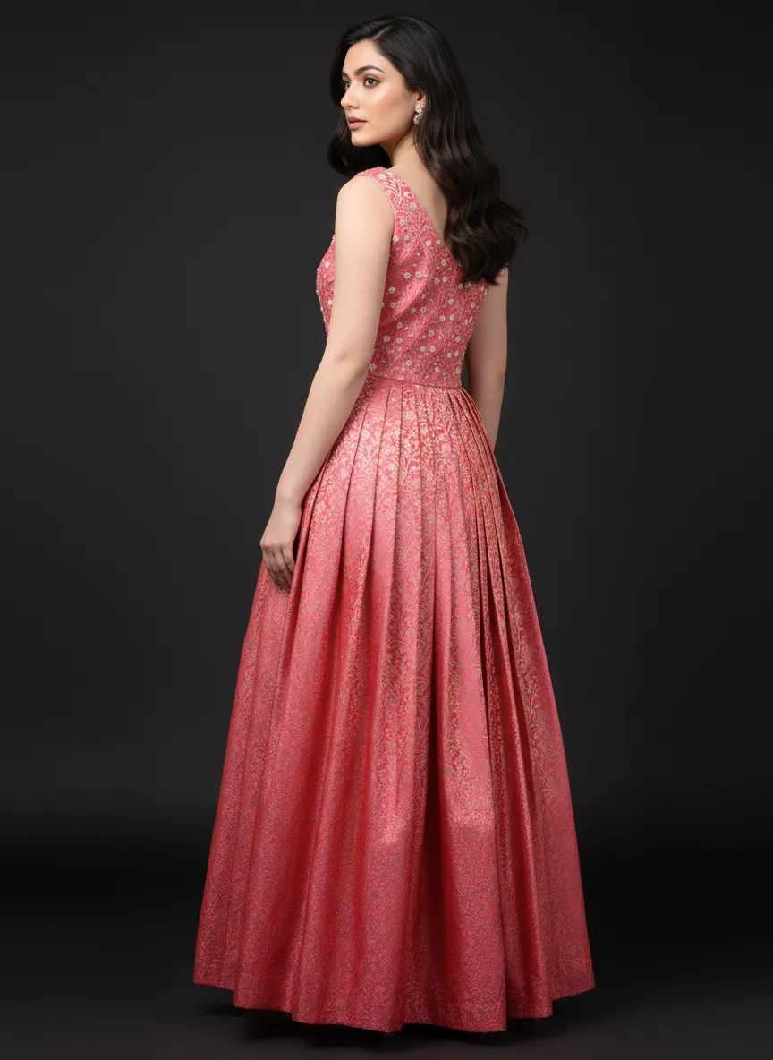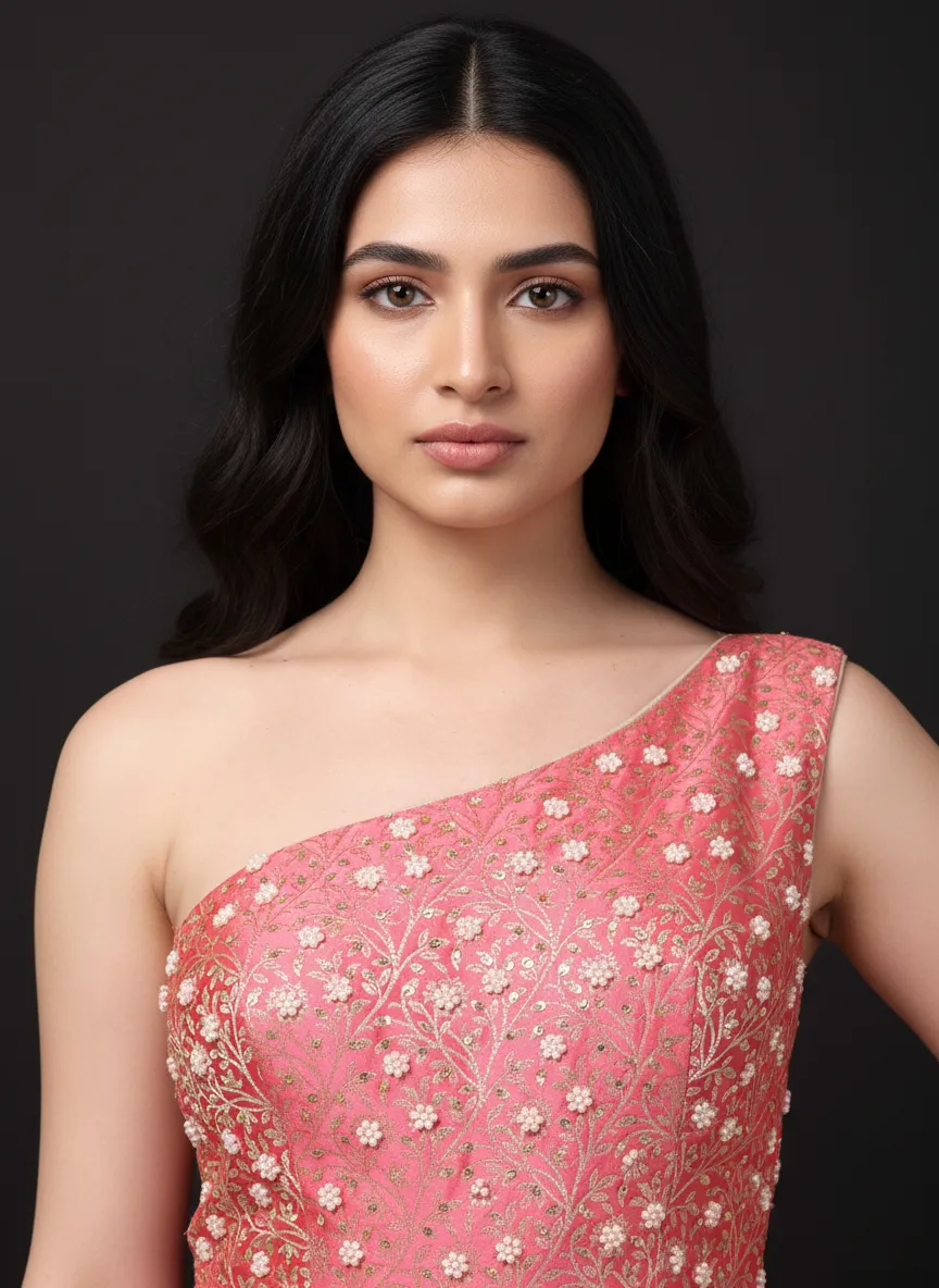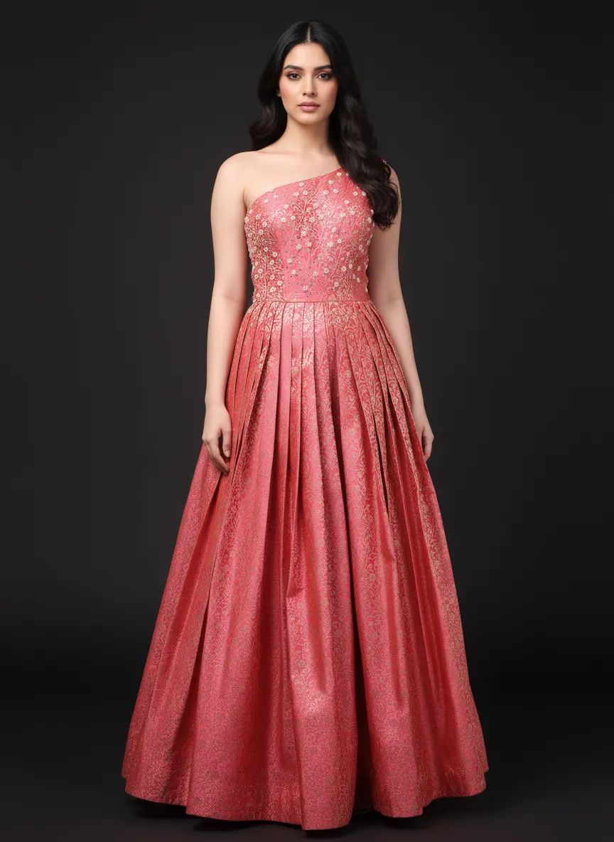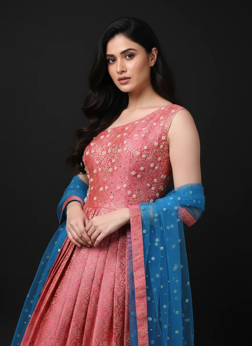 Introducing a stunning Watermelon Pink One-Shoulder Banarasi Gown adorned with intricate zari embroidery that reflects timeless craftsmanship. Designed with a chic one-shoulder silhouette and paired with a contrasting blue net dupatta, this elegant ensemble blends tradition with modern style, making it perfect for weddings, festive occasions, and grand celebrations.
