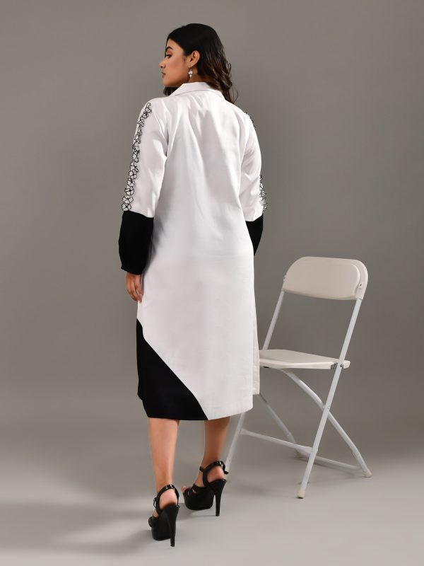 This simple yet elegant white and black colored blended cotton dress is a blend of practicality and style, in our signature colour blocking technique. Soft organza floral patch detailing on the sleeves and on the pocket adds the touch of glamour and makes the outfit stand out. Feel confident and glamorous , enjoy a comfortable, flattering fit in our soft and breathable fabric for all day comfort. A Dress that can carry you easily from a day to night look.
