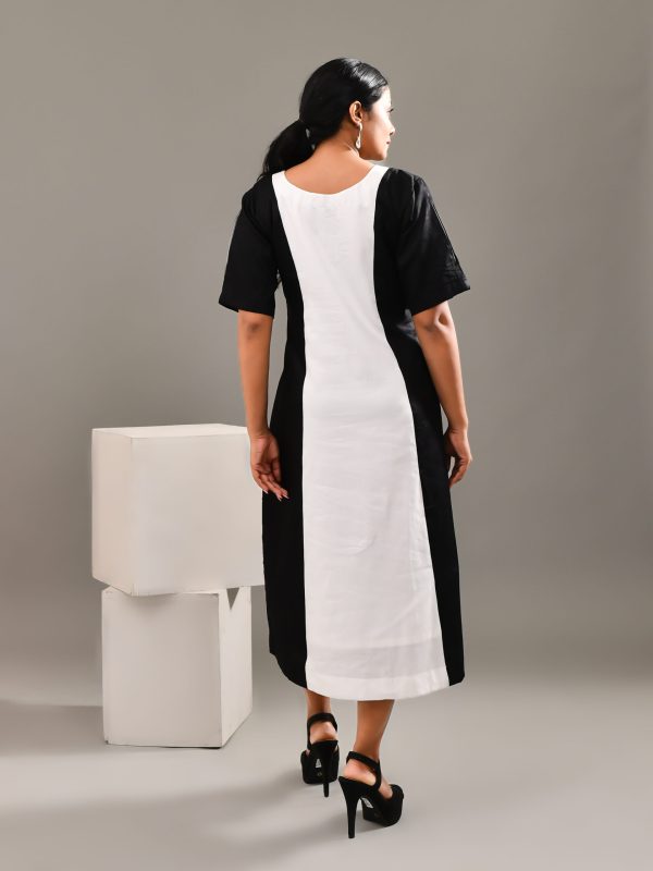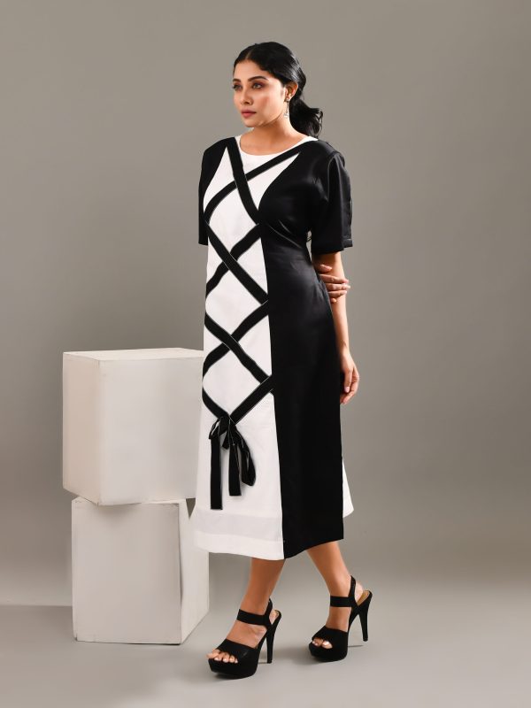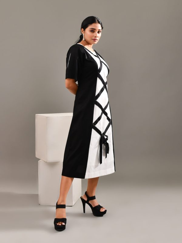 Bringing in little country charm to the city, with this simple and modern white and black colored blended cotton dress , with minimalistic features, geometric pattern and a knot at the lower part of the dress to enhance the entire look. Keep it simple and stylish.