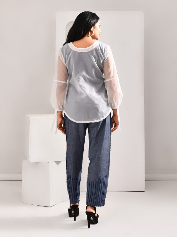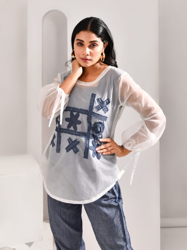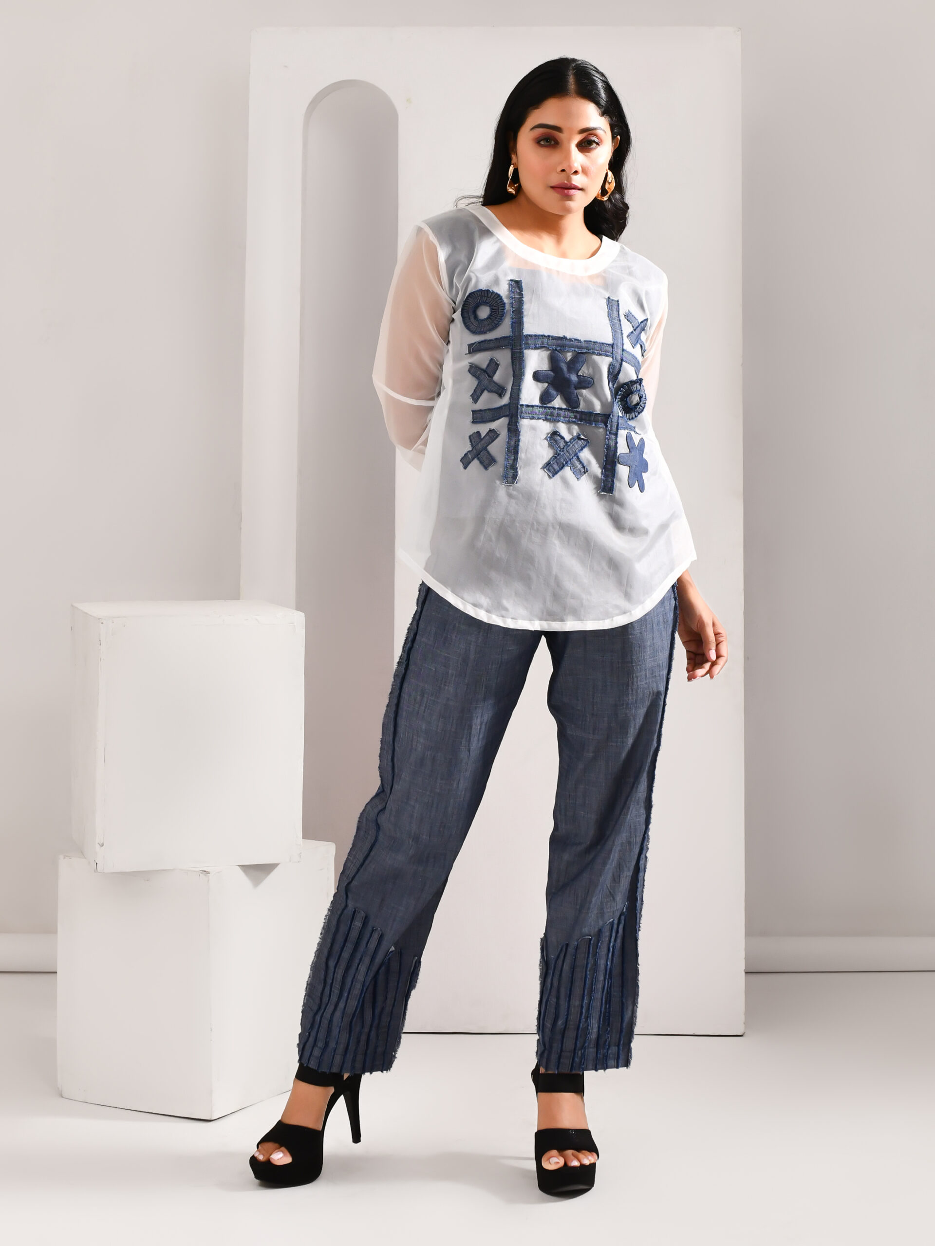 White can be a colour palleted too, when paired with the right kind of shades. Grunge meets soft elegance in this set with Denim, frayed details pants and game patterned patch worked top. A perfect outfit for and casual outing.