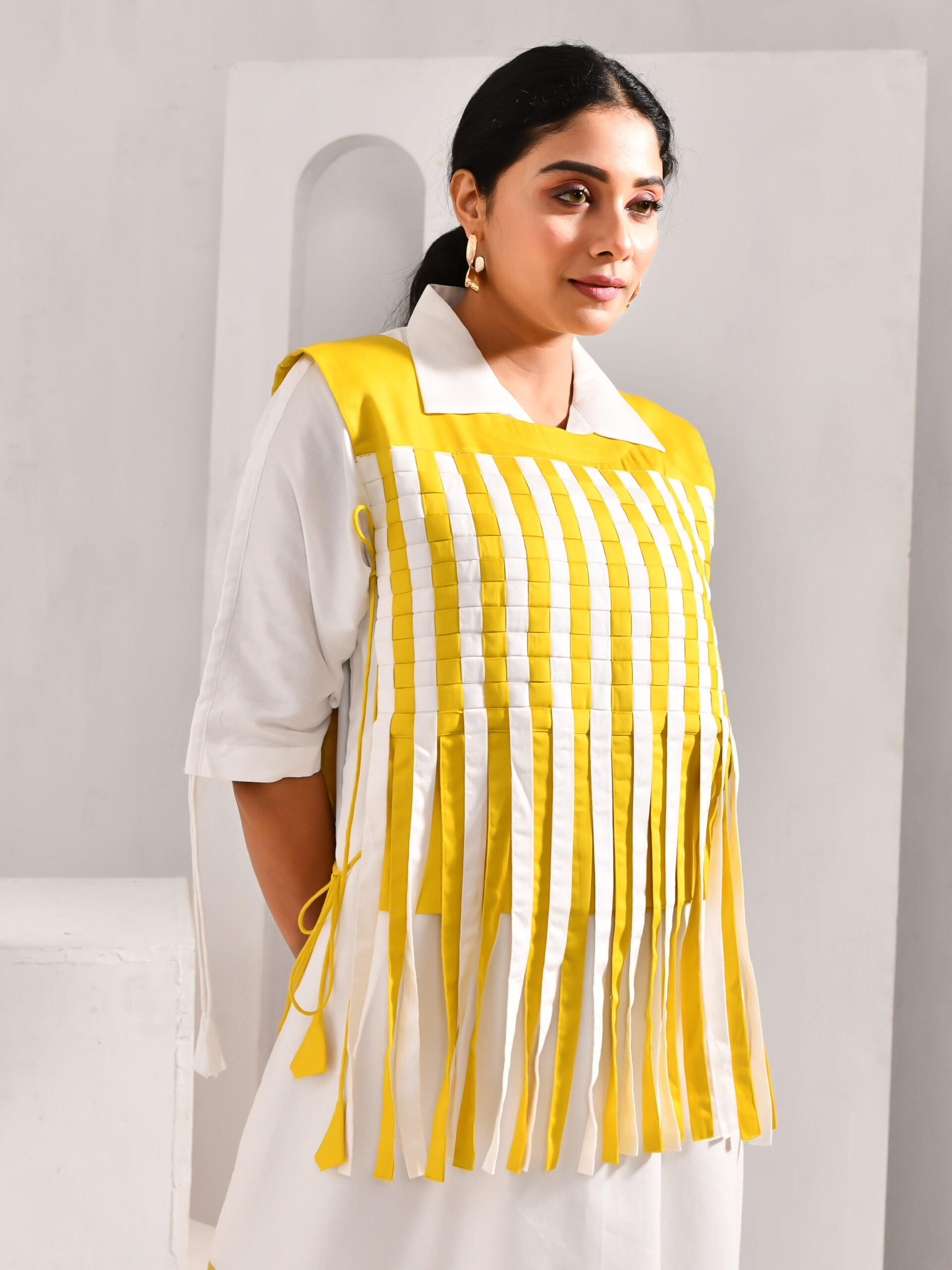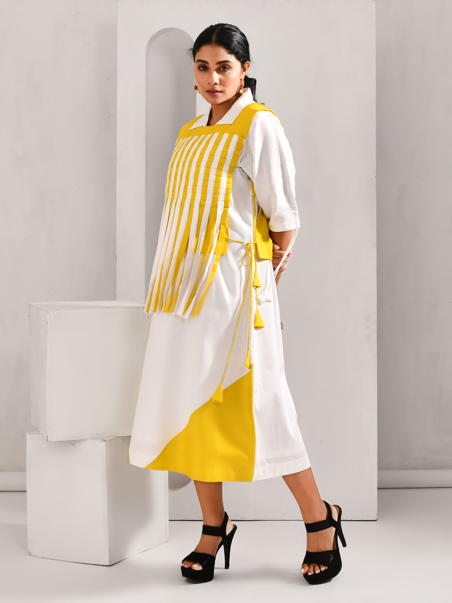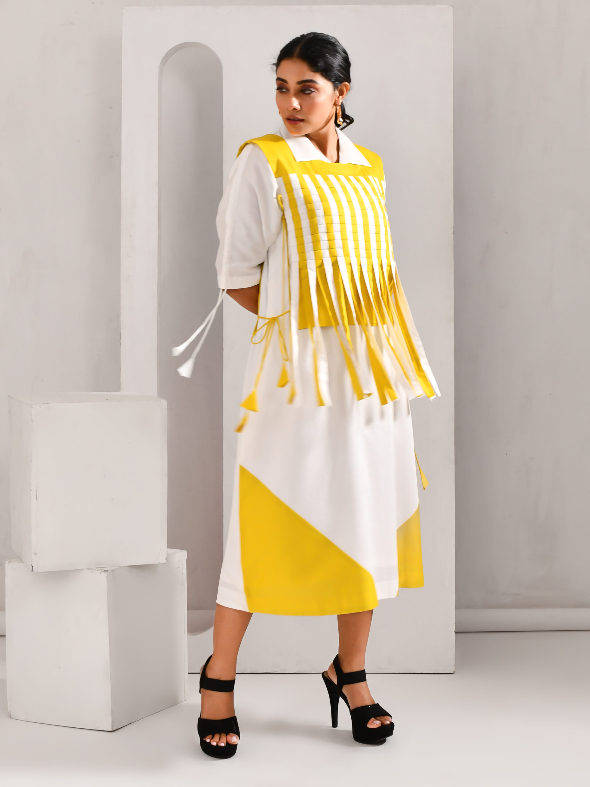 Trendy women’s take on the bib dress with tassels. Tediously crafted for that casual chic look to elevate your look. This white and lime yellow colored blended cotton dress is a perfect outfit for any corporate party due to its captivating pattern of work.
