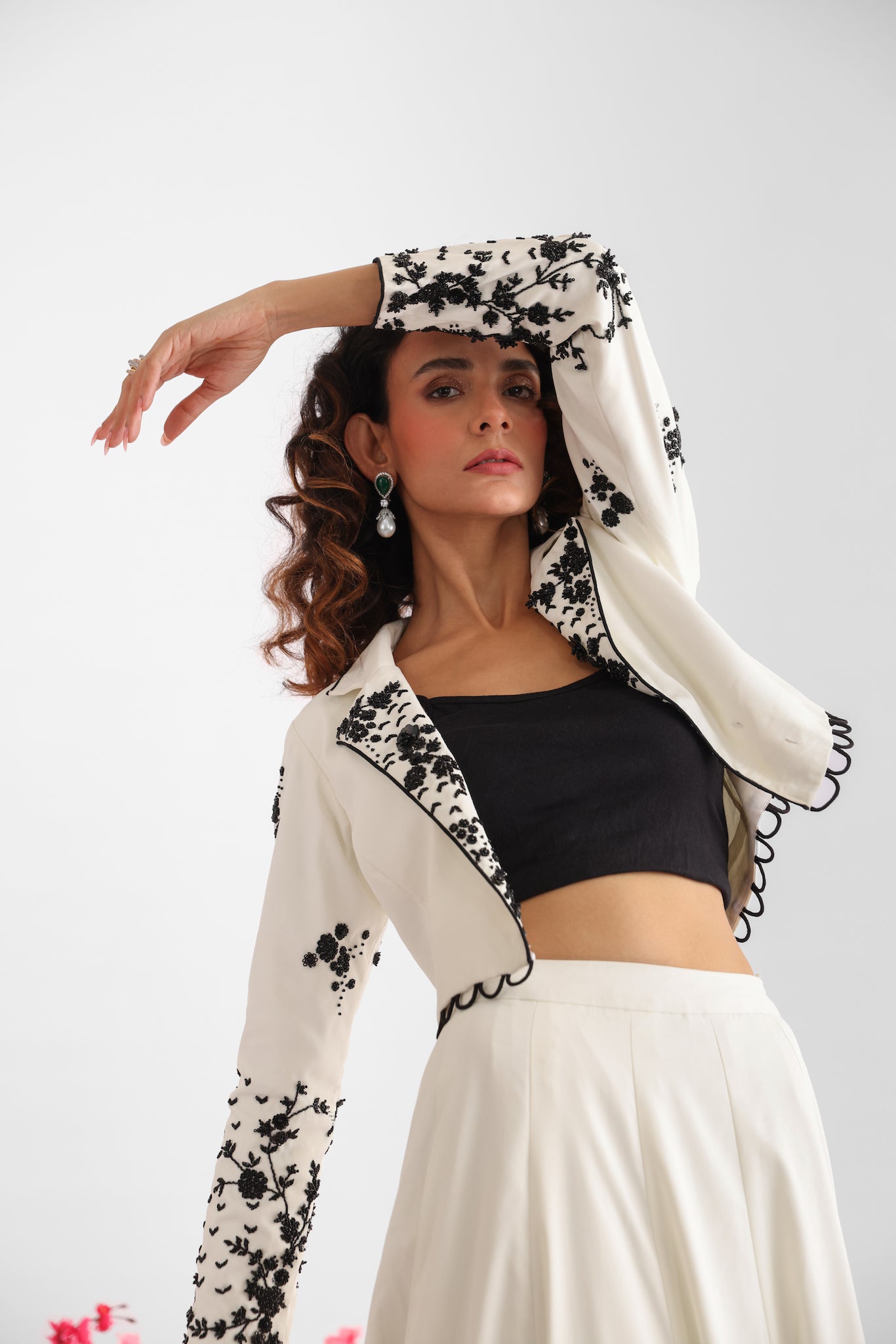 White organza jacket with 3D floral embroidery paired with white crop top and high-waisted flared pants – Golden Muslin