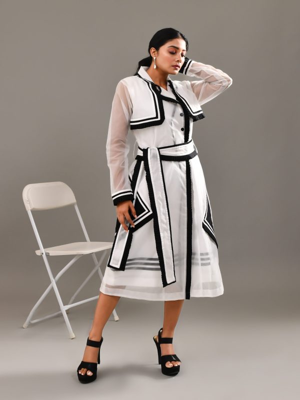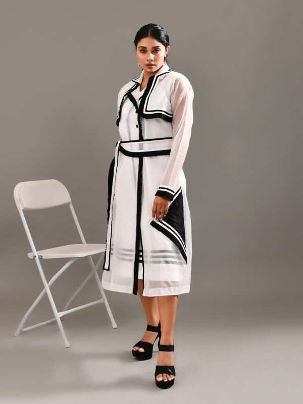 This white and black colored blended cotton and organza dress making hearts flutter with the westworld charm, entwined in delicate pleating details and sheer layering. A trench inspired sheer jacket with details to die for, completes the look with the most comfortable dress underneath.