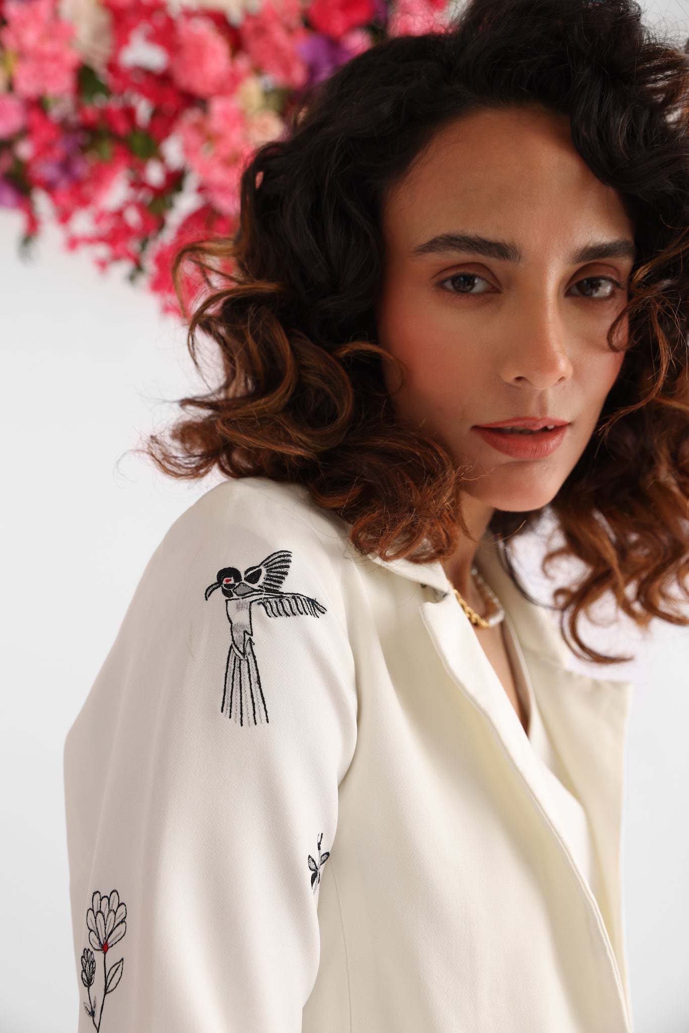 The white jacket features subtle yet enchanting nature-inspired embroidery—delicate florals and abstract motifs that add a playful twist to its structured silhouette. It’s paired with a matching white crop top that offers a flattering, clean-cut look, and high-waisted flared pants that flow effortlessly with every step.