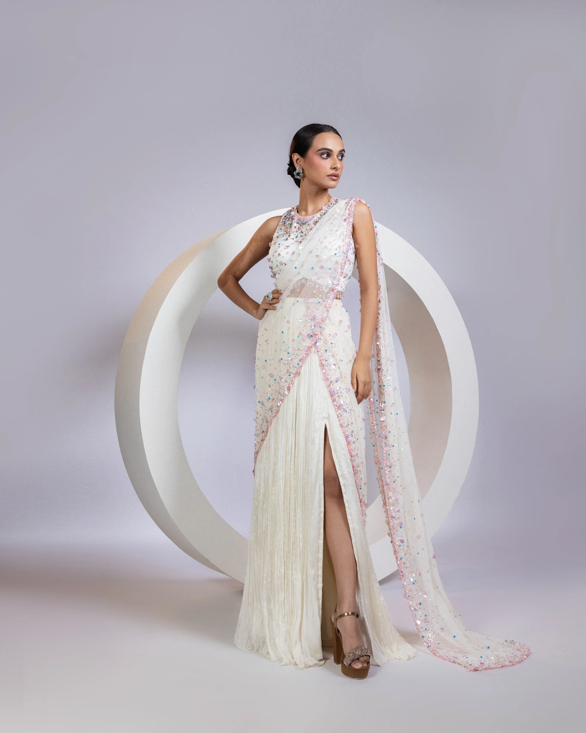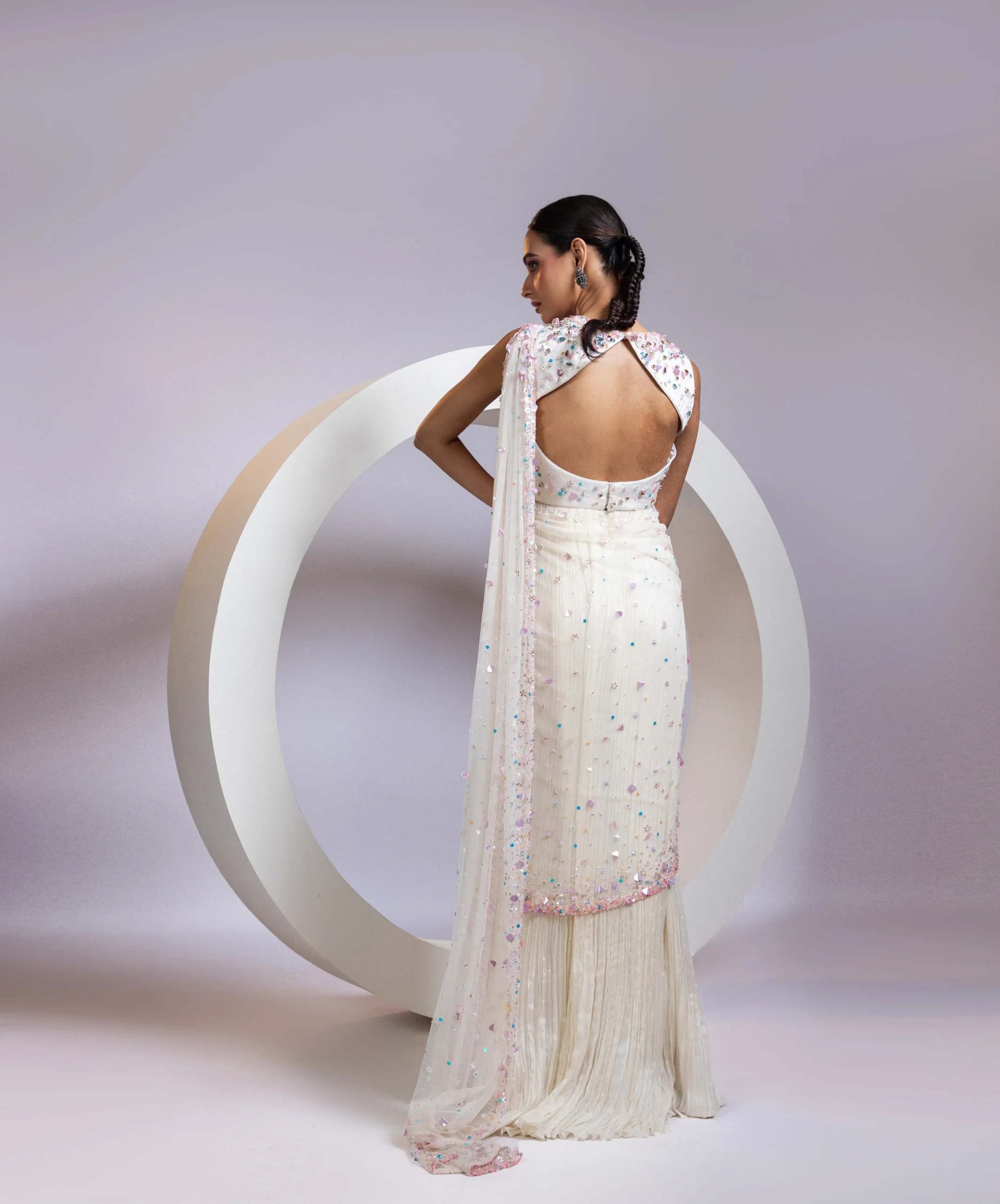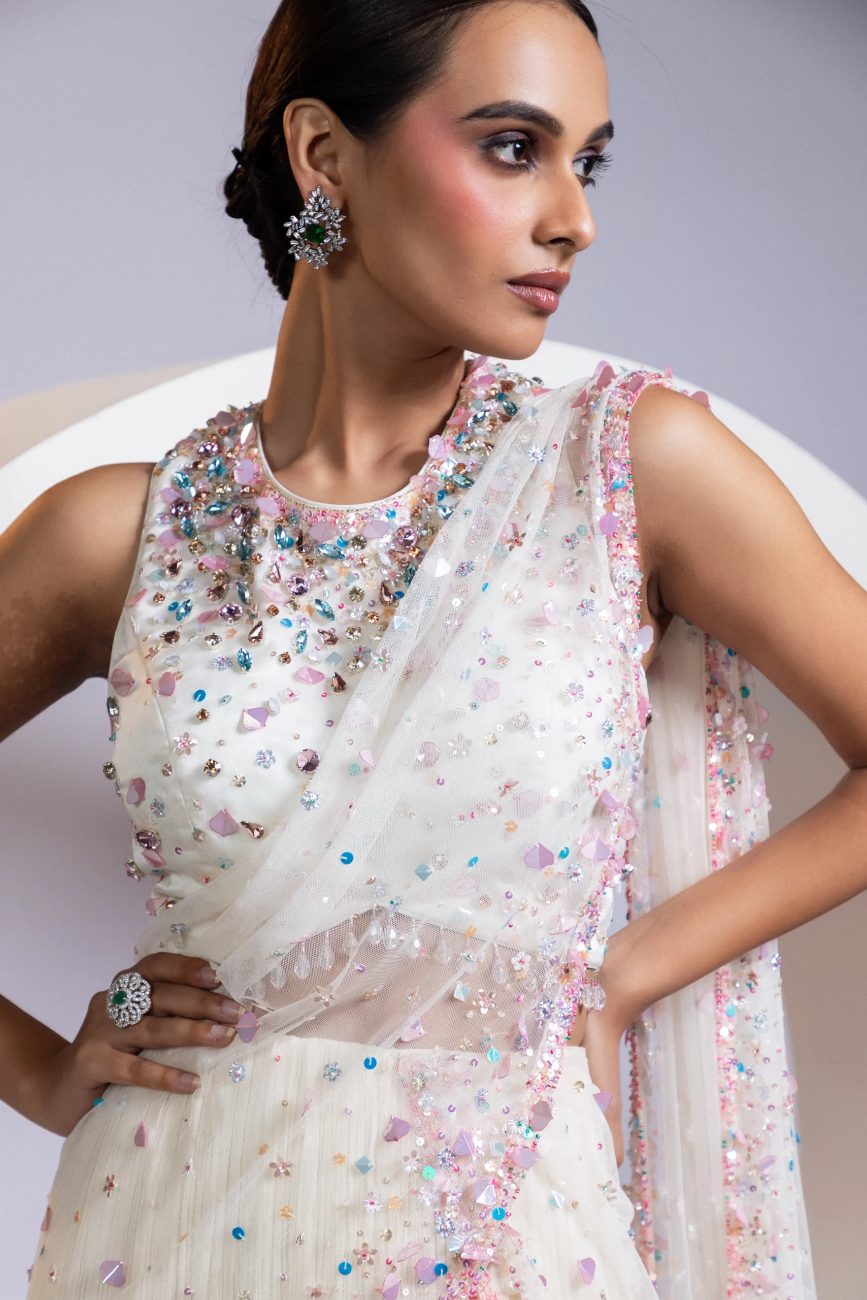 A white drape saree featuring a heavily embellished blouse and palla encrusted with pastel sequins, pink and blue gems, and clear crystals. The multicolored detailing adds dimension and brilliance against the clean base. Light-catching and refined, it brings a soft, jeweled glow to any occasion. Perfect for elegant celebrations and soirées.