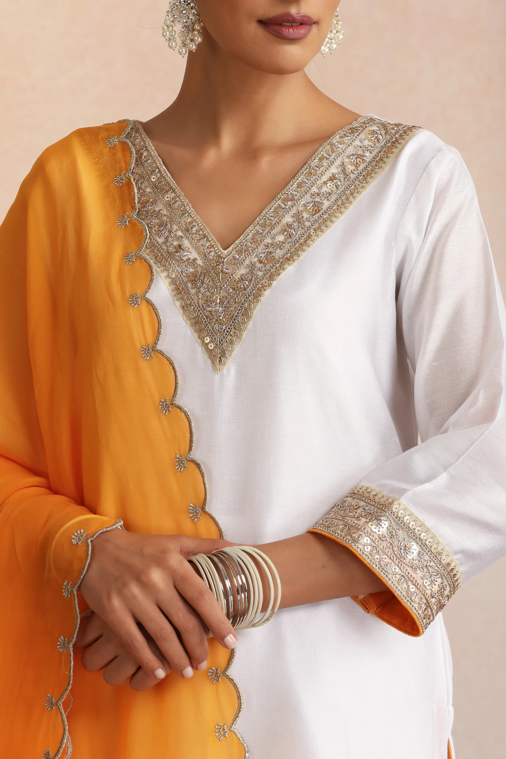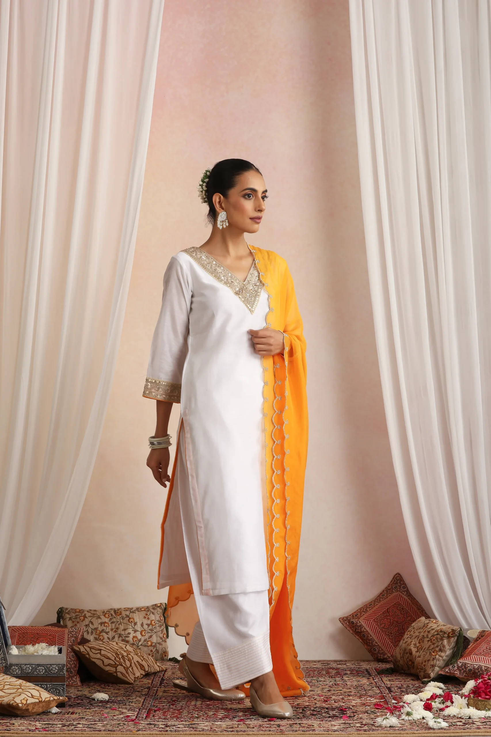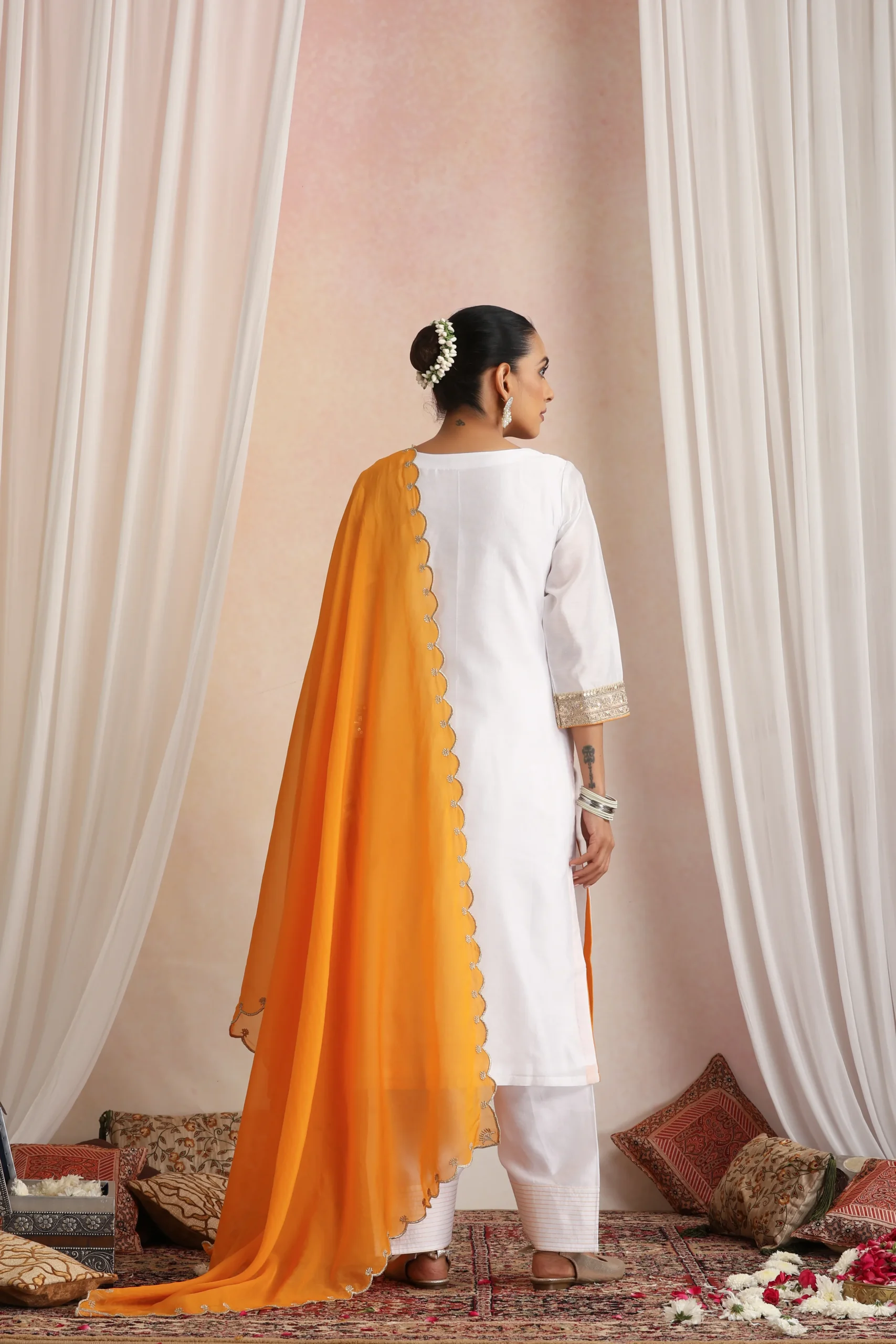 Introducing a graceful white ethnic kurta set paired with a vibrant orange dupatta, blending timeless elegance with contemporary charm. The pristine white kurta features a clean, minimalist silhouette, while the rich orange dupatta adds a striking contrast. Lightweight and breathable, this ensemble is perfect for festive occasions, office ethnic days, and cultural gatherings, offering refined style, comfort, and versatile everyday sophistication.