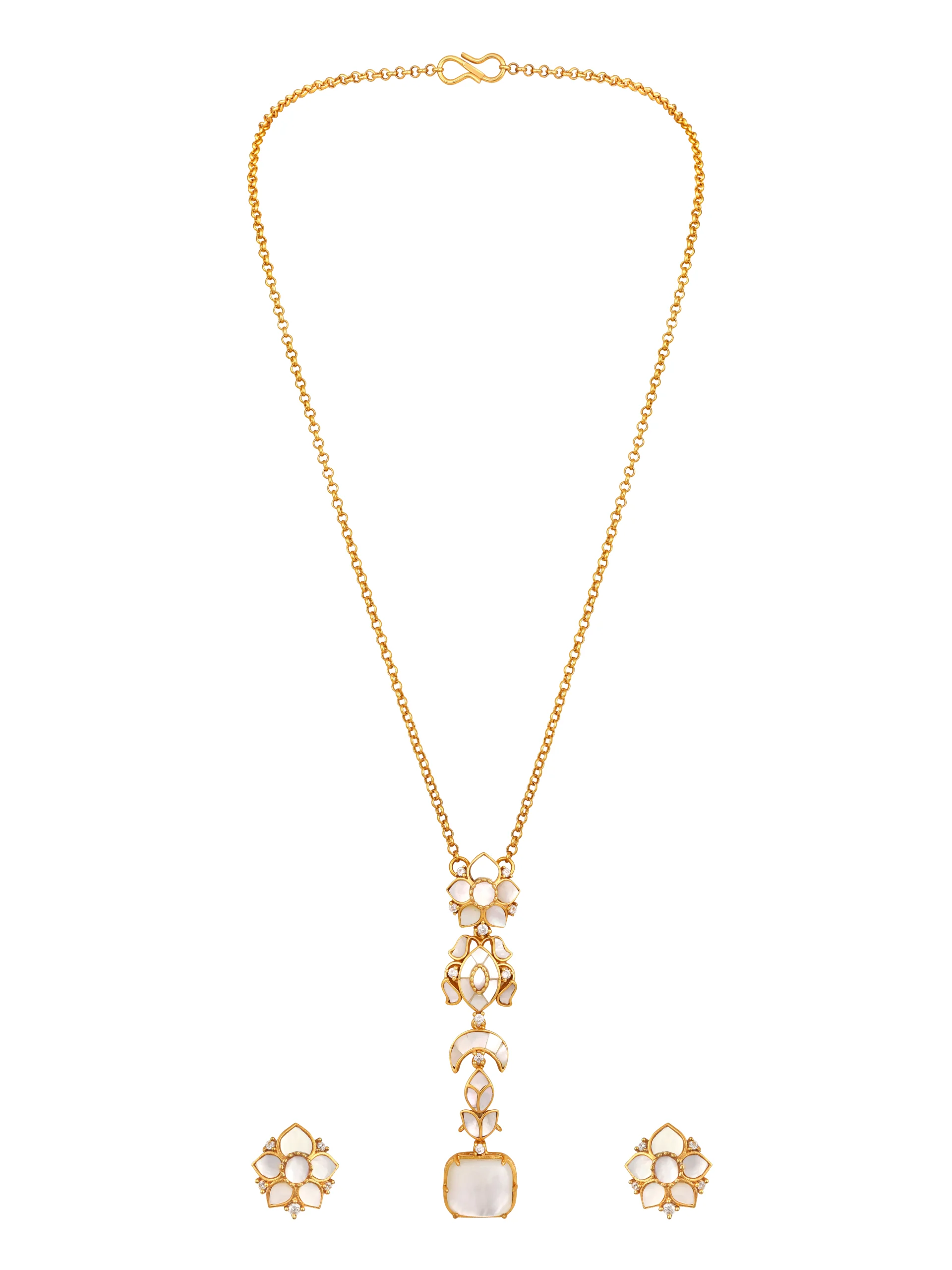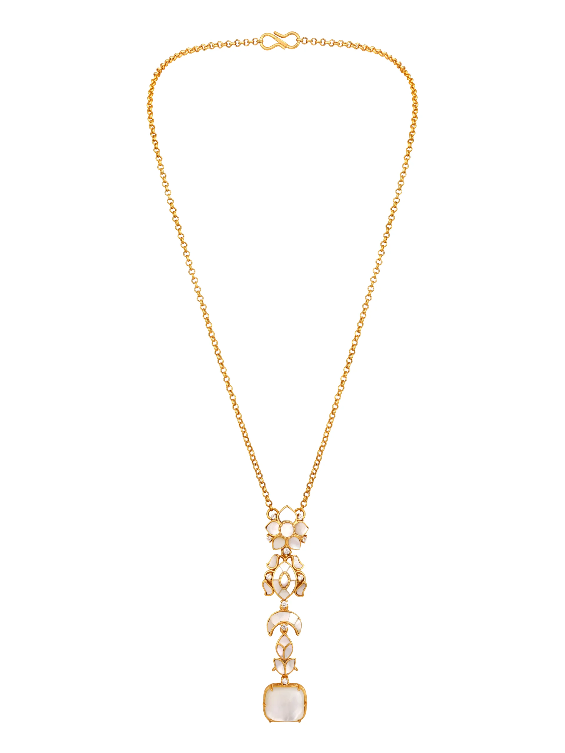 Introducing White Kundan Polki Pearl Drop Pendant Long Necklace Set crafted in micron gold polished brass, featuring delicate kundan polki motifs and elegant pearl drop accents. Handcrafted with intricate artistry, this graceful necklace set blends timeless tradition with contemporary elegance for festive occasions and refined Indo-western styling.
