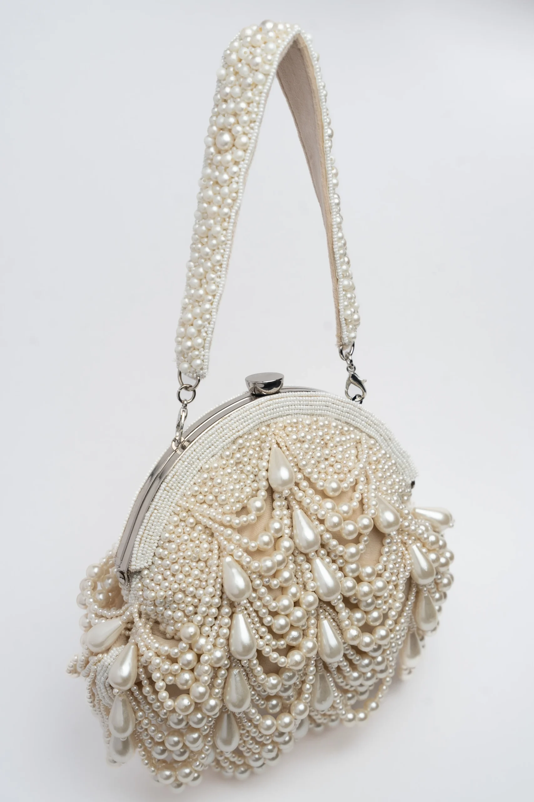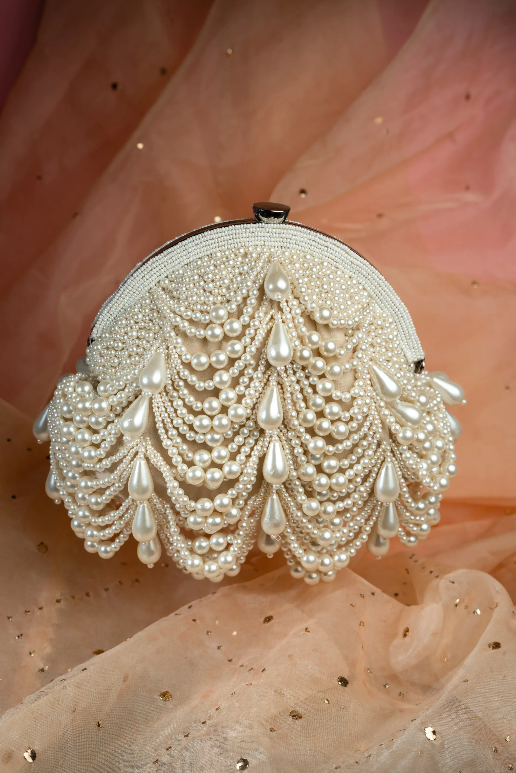Introducing a sophisticated white pearl scalloped frame clutch designed to bring timeless elegance to any occasion. Crafted on a refined white base, it features delicate scalloped pearl detailing along the frame that creates a graceful and luminous finish. The pearly beaded handle enhances its charm while offering a stylish carry option. Perfect for weddings, festive celebrations, and elegant day or evening events, this clutch complements both traditional and contemporary ensembles effortlessly.