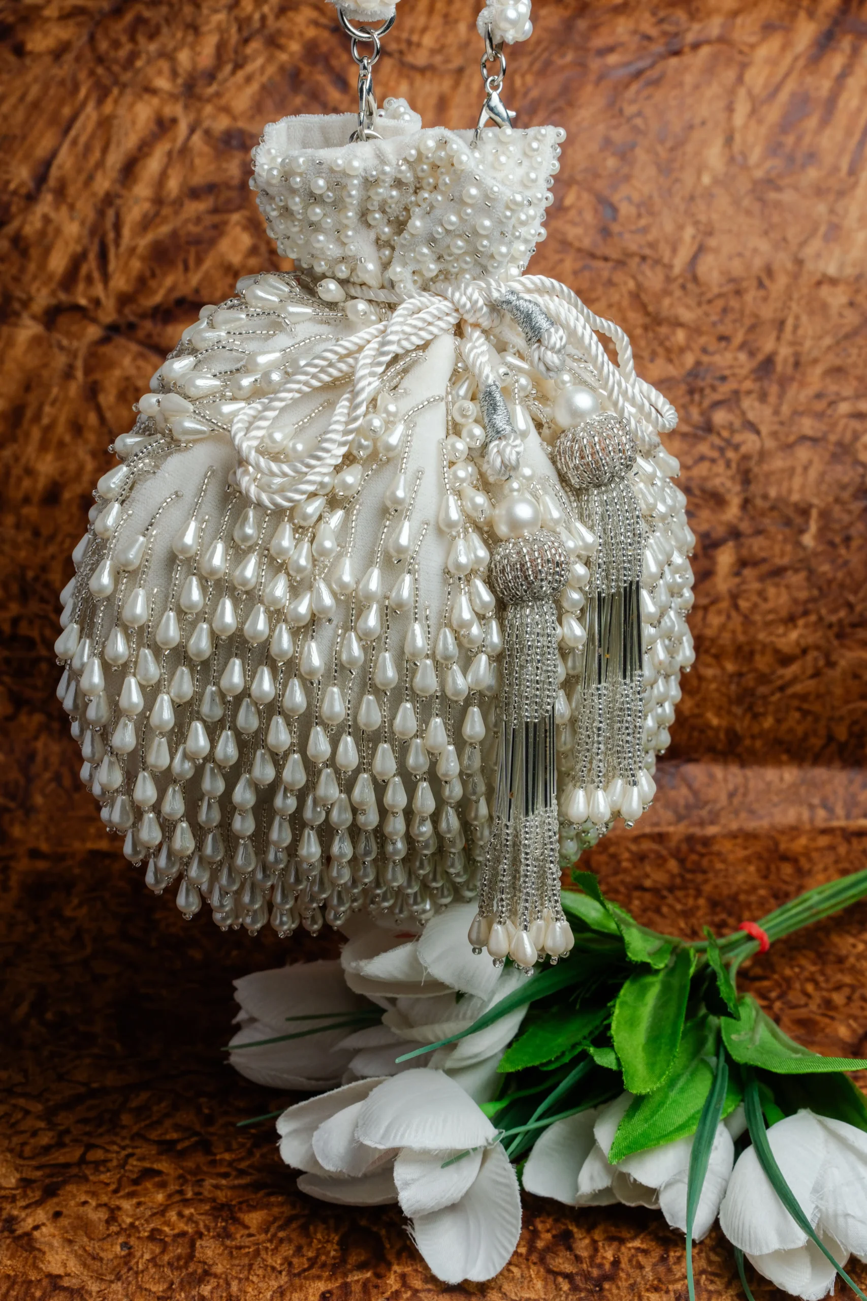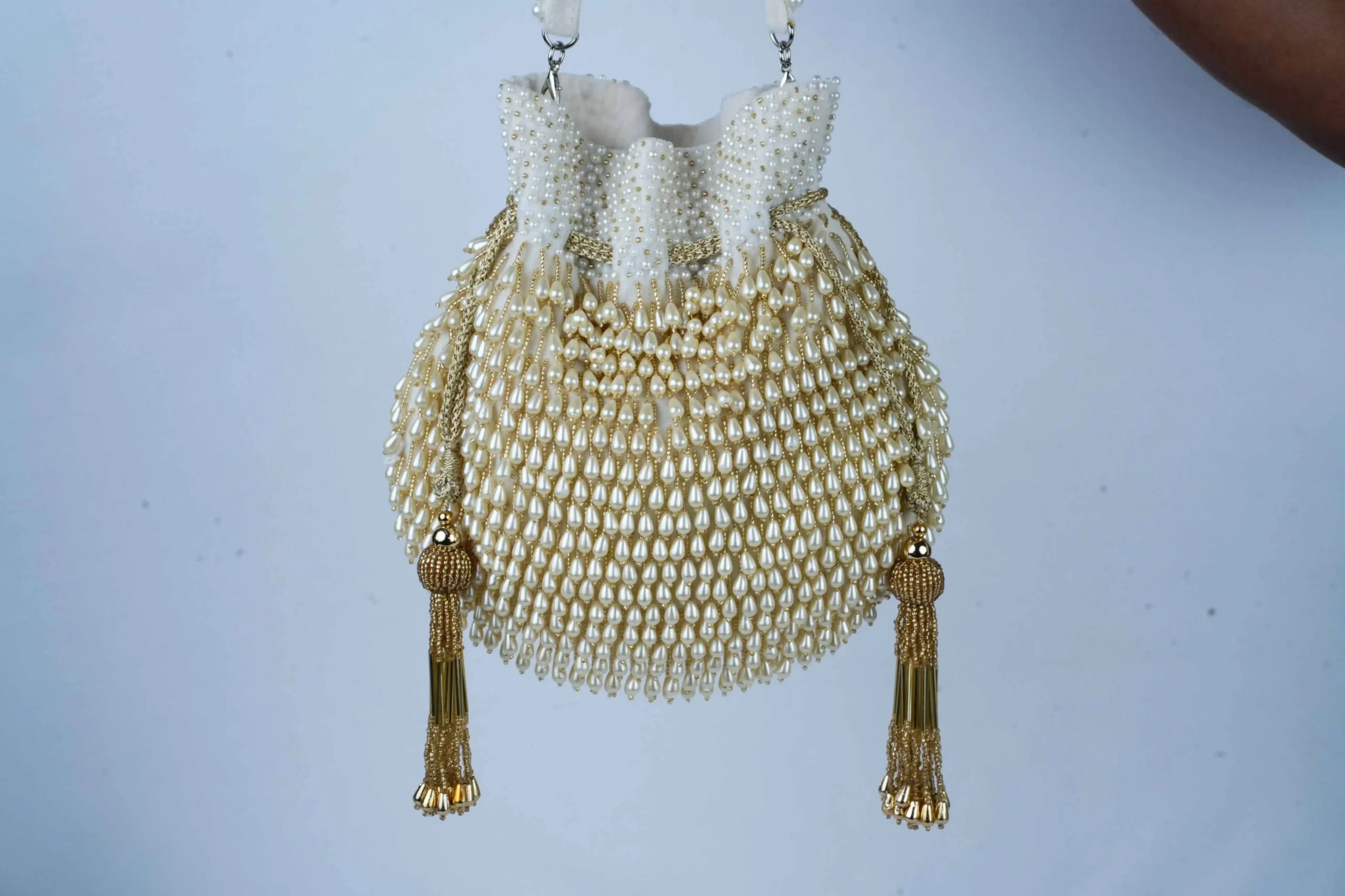 Introducing the White Pearl Tassel Potli with Beaded and Intricate Pearl Work, an elegant accessory adorned with delicate beads, detailed pearl embellishments, and graceful pearl tassels. Designed in a refined white palette with luxurious pearl finishing, this potli adds timeless charm and subtle sparkle to weddings, festive celebrations, and special occasions.
