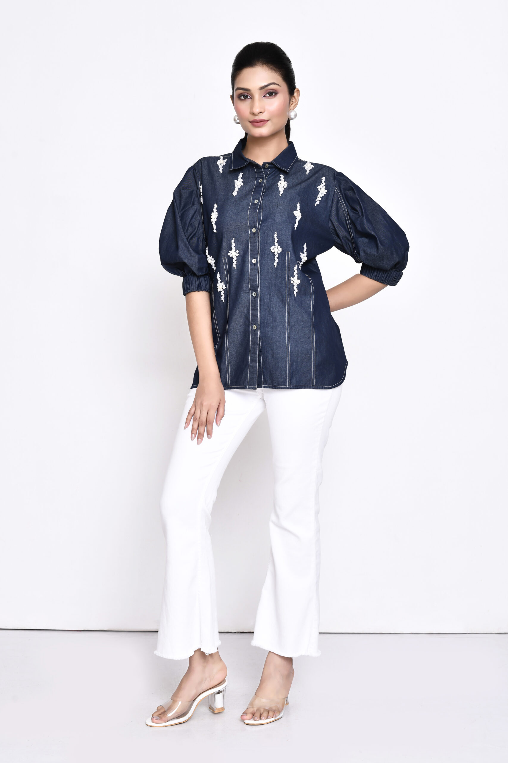 White organza jacket with 3D floral embroidery paired with white crop top and high-waisted flared pants – Golden Muslin