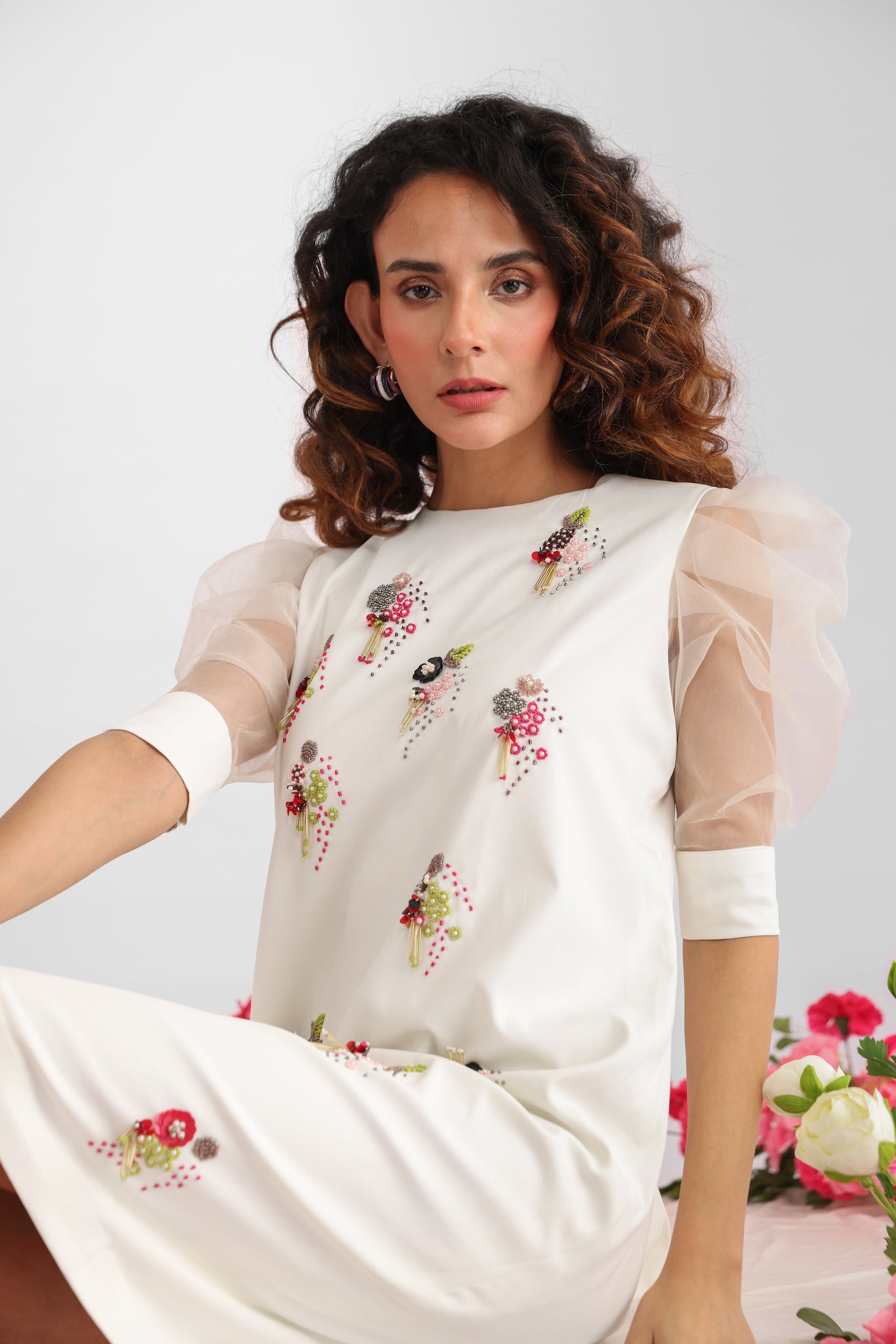 Introducing a white poly viscose shift dress with puff sleeves. A perfect blend of timeless elegance and playful charm. Crafted from a soft poly-viscose blend, this dress features a flattering shift silhouette that drapes effortlessly for a sleek and comfortable fit. The delicate puff sleeves add a touch of romance, while the vibrant floral embroidery and whimsical tassel detailing bring the dress to life with every movement.