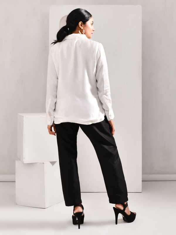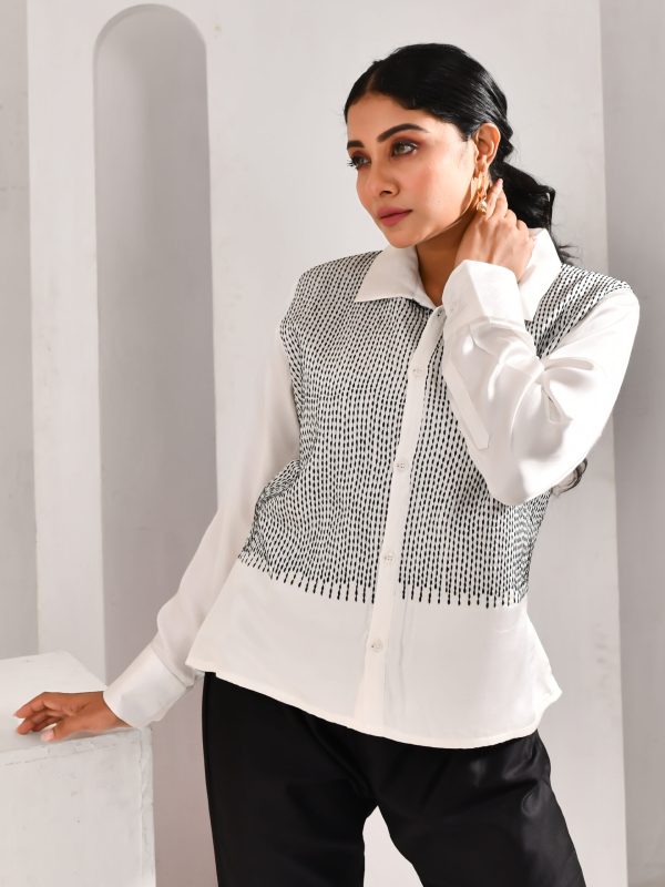 Kantha , a traditional Bengal embroidery inspired Shirt in luxurious satin fabric with a smooth, lustrous finish. Classic white color that’s perfect for formal events, parties, or nights out. Elegant Shirt design that’s both timeless and on-trend.