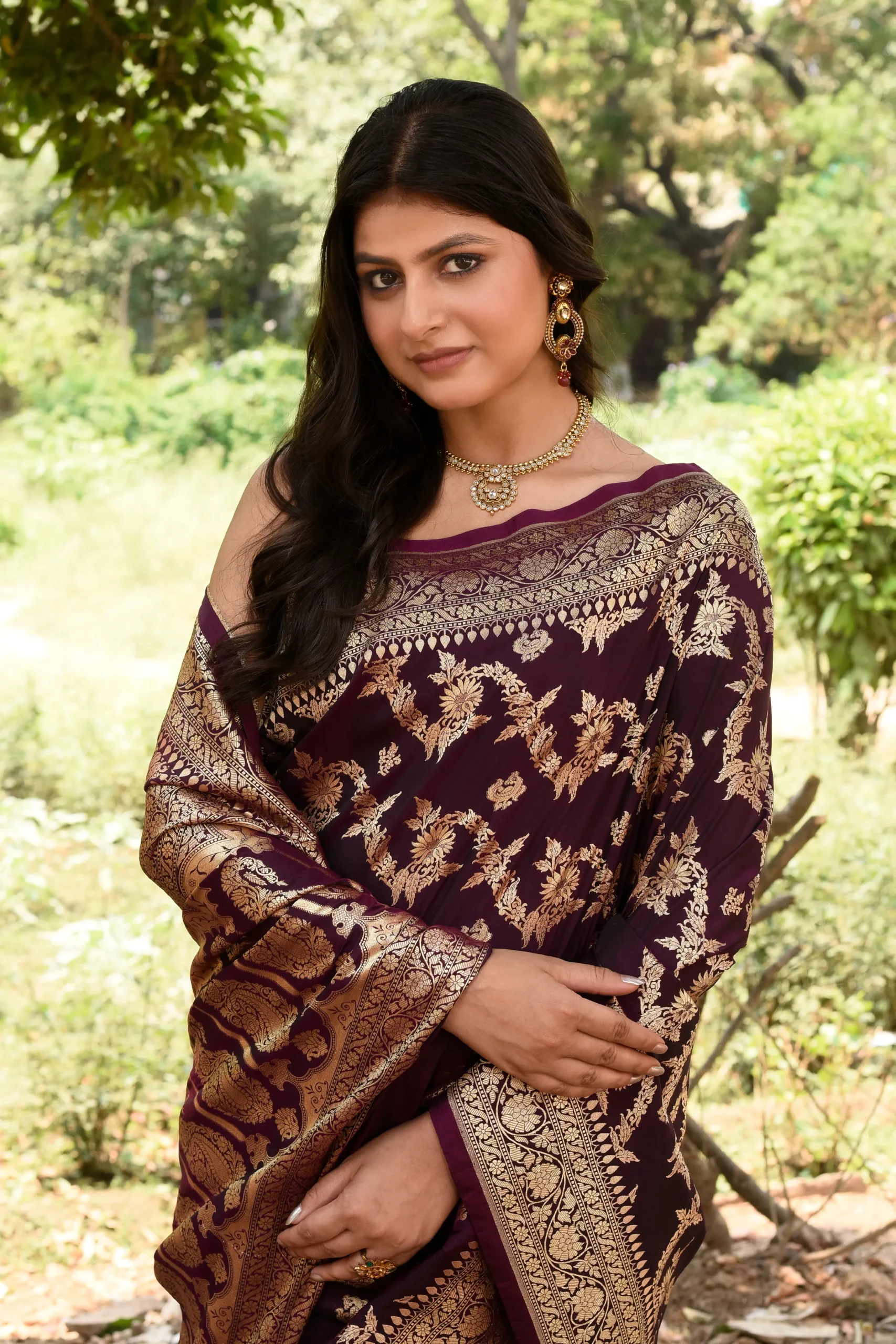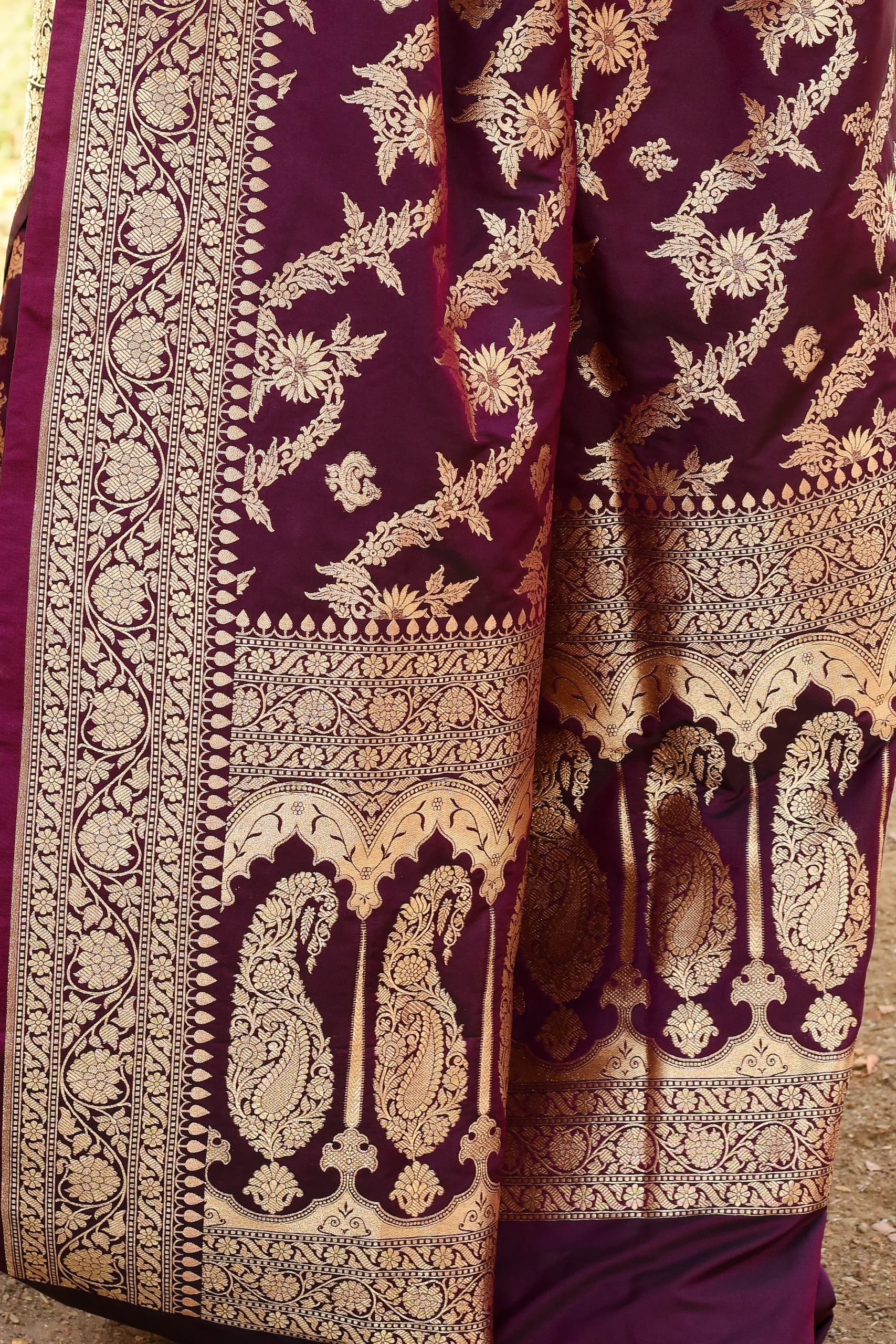 Wine Banarasi Soft Silk Saree with Rich Gold Zari Floral Jaal