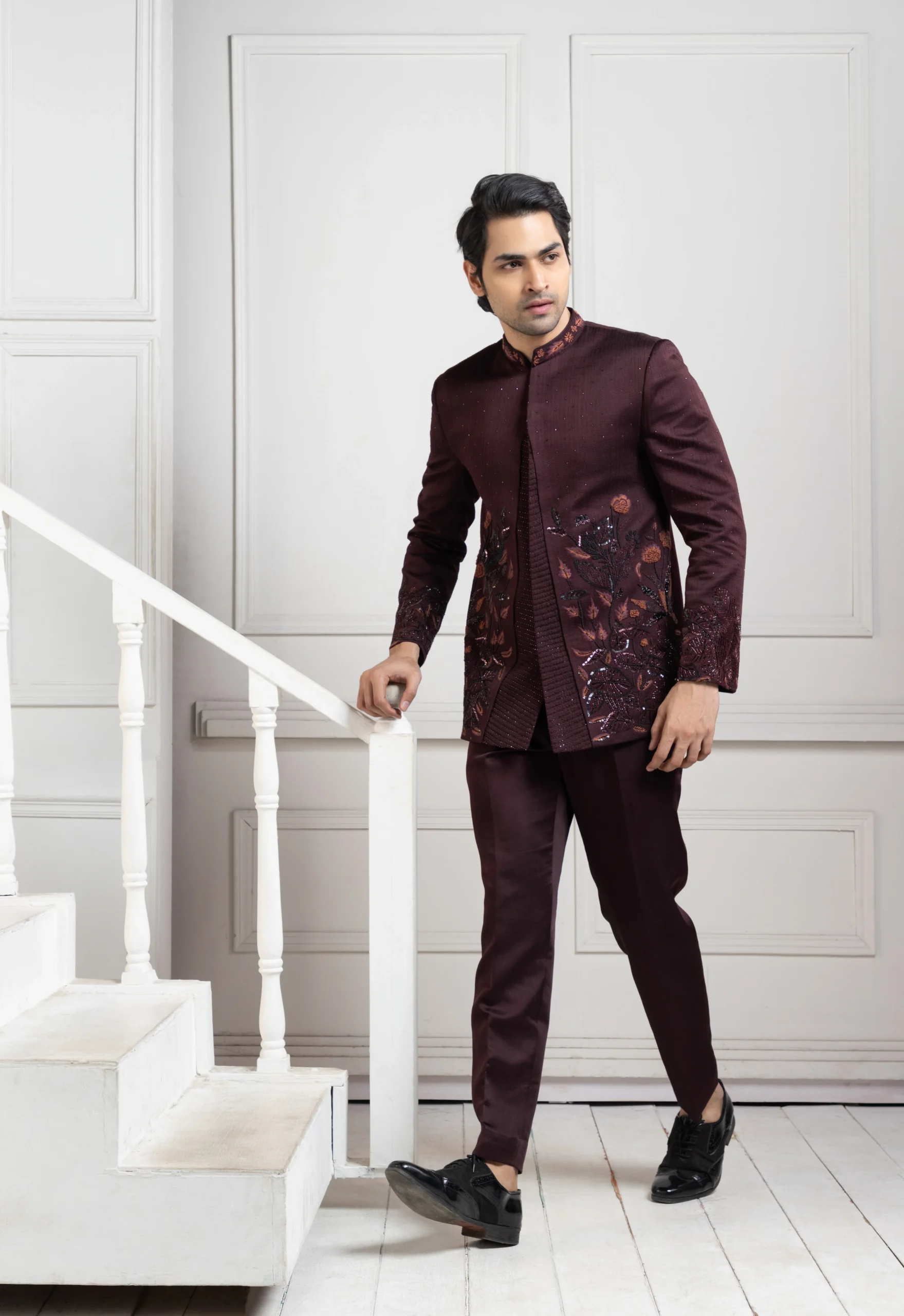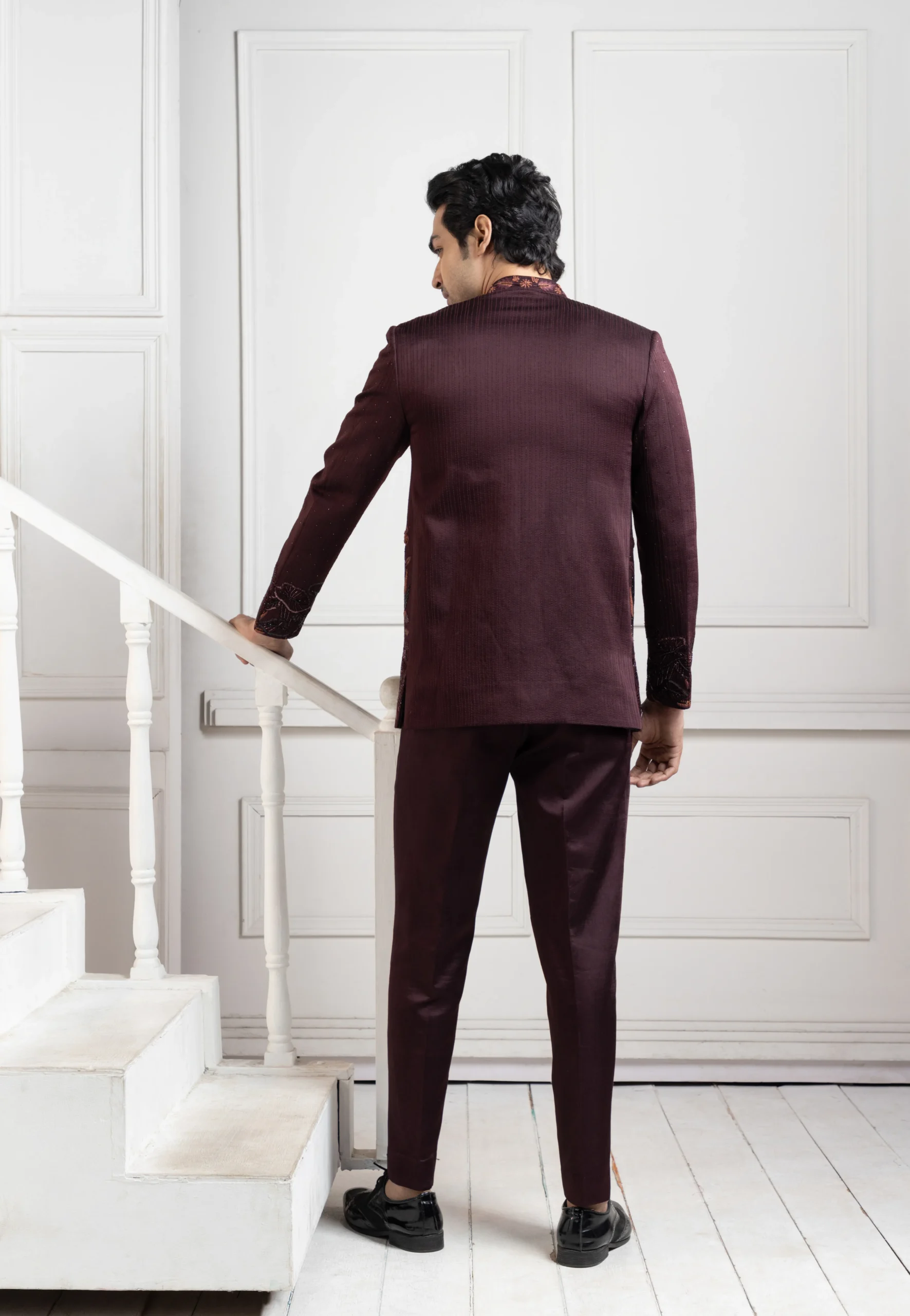 Style this Wine Bandhgala Set with classic black or patent leather shoes for a polished formal look.