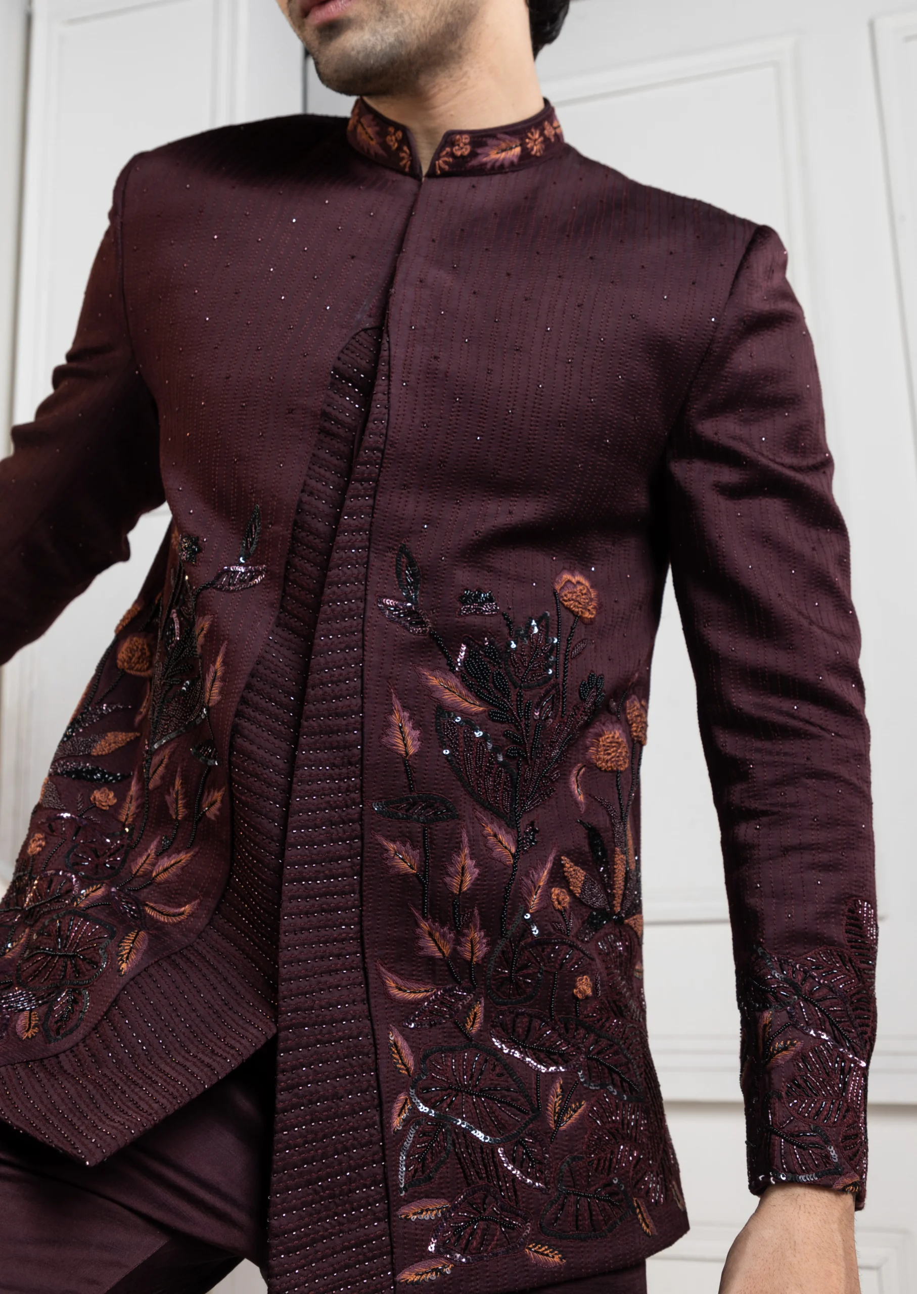 Introducing the wine embellished Bandhgala Set, a sophisticated ensemble crafted from linen satin fabric for refined elegance. Featuring intricate tonal embroidery with floral 3D applique detailing and subtle shimmer accents, it offers a rich, modern appeal. Paired with tailored matching cotton trousers, this set is perfect for weddings, receptions, and festive occasions.