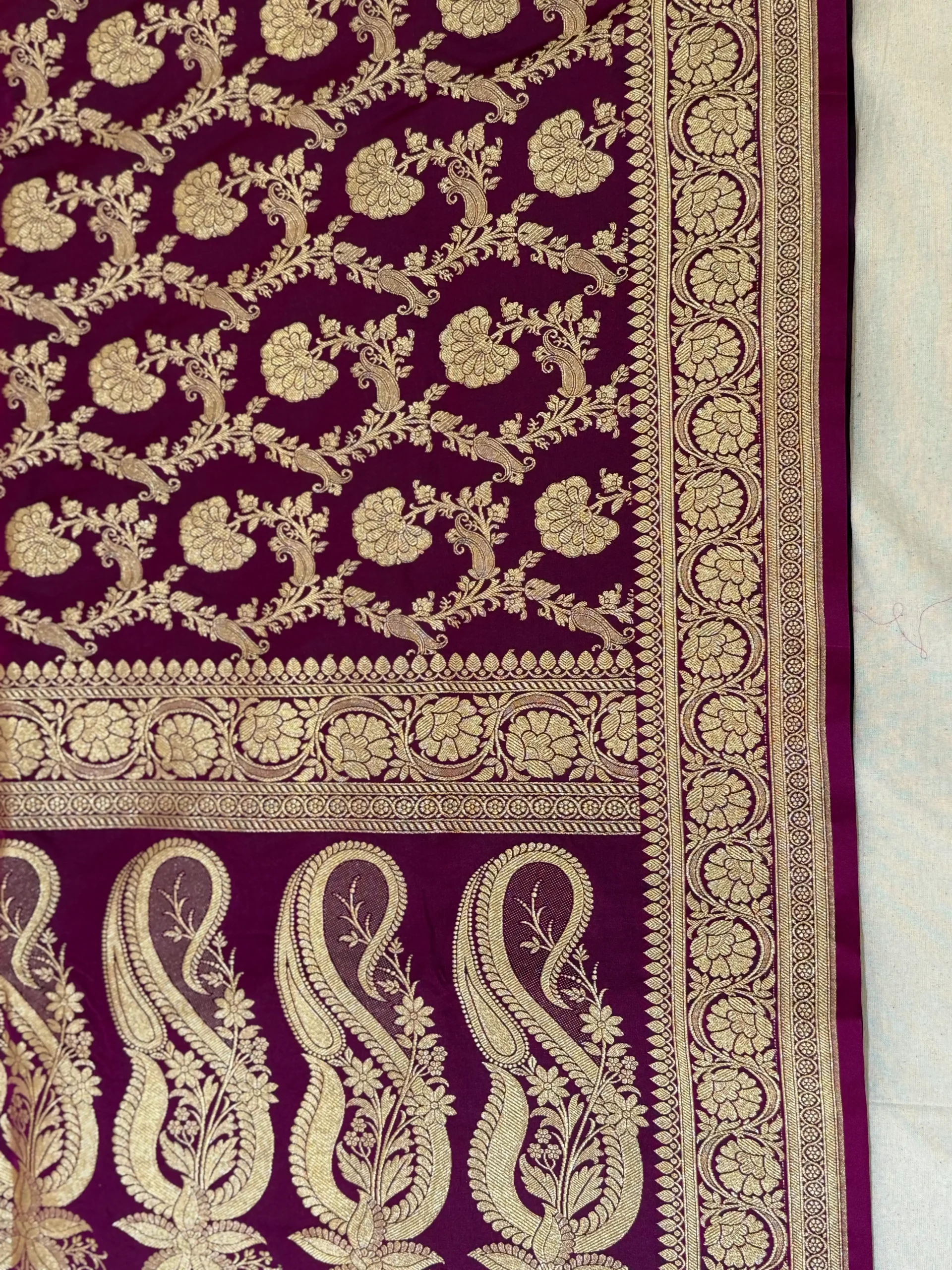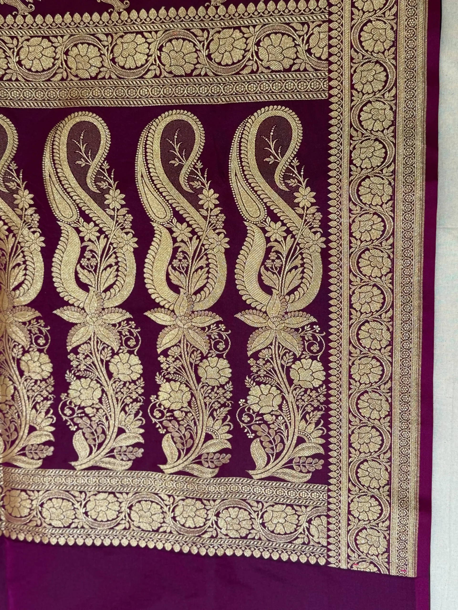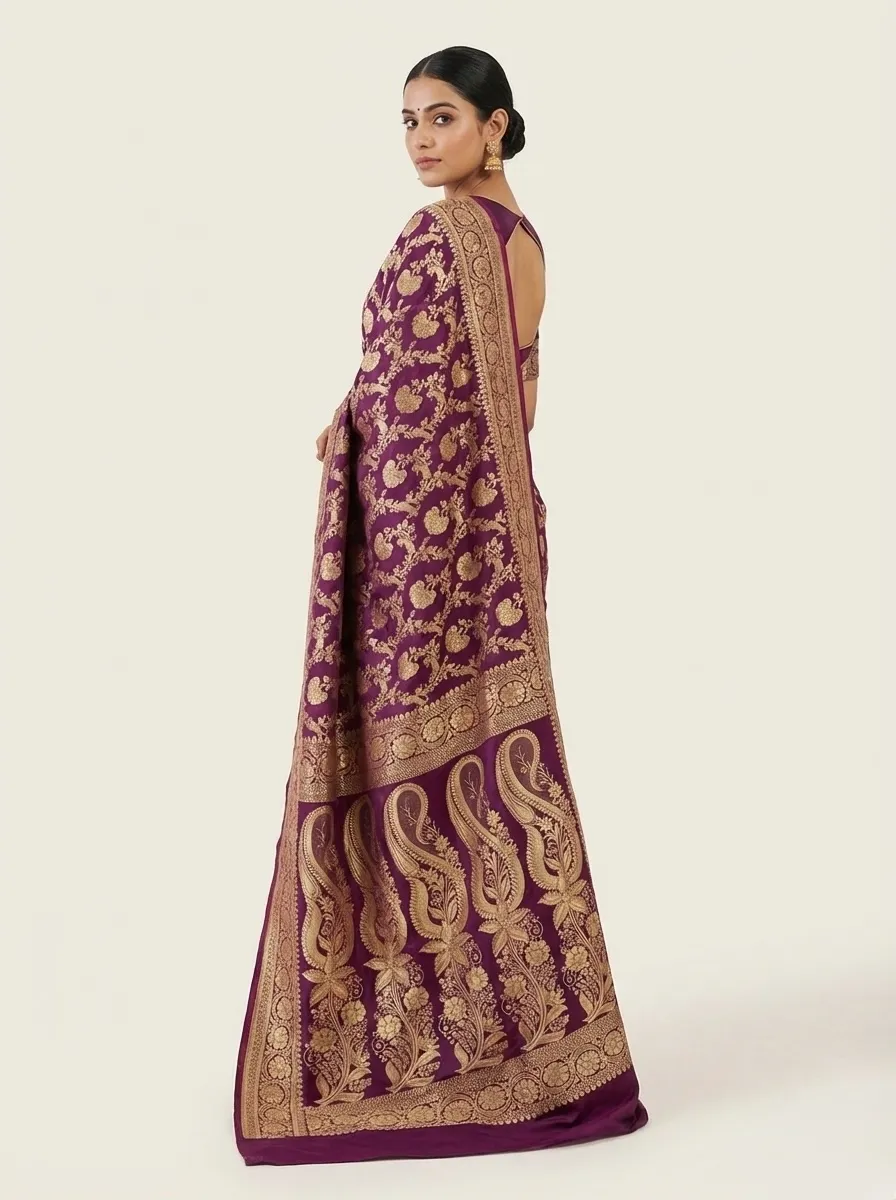 Plum Purple Banarasi Soft Silk Saree with Silver Gold Zari Floral Jaal from Golden Muslin By Naaritva Banaras