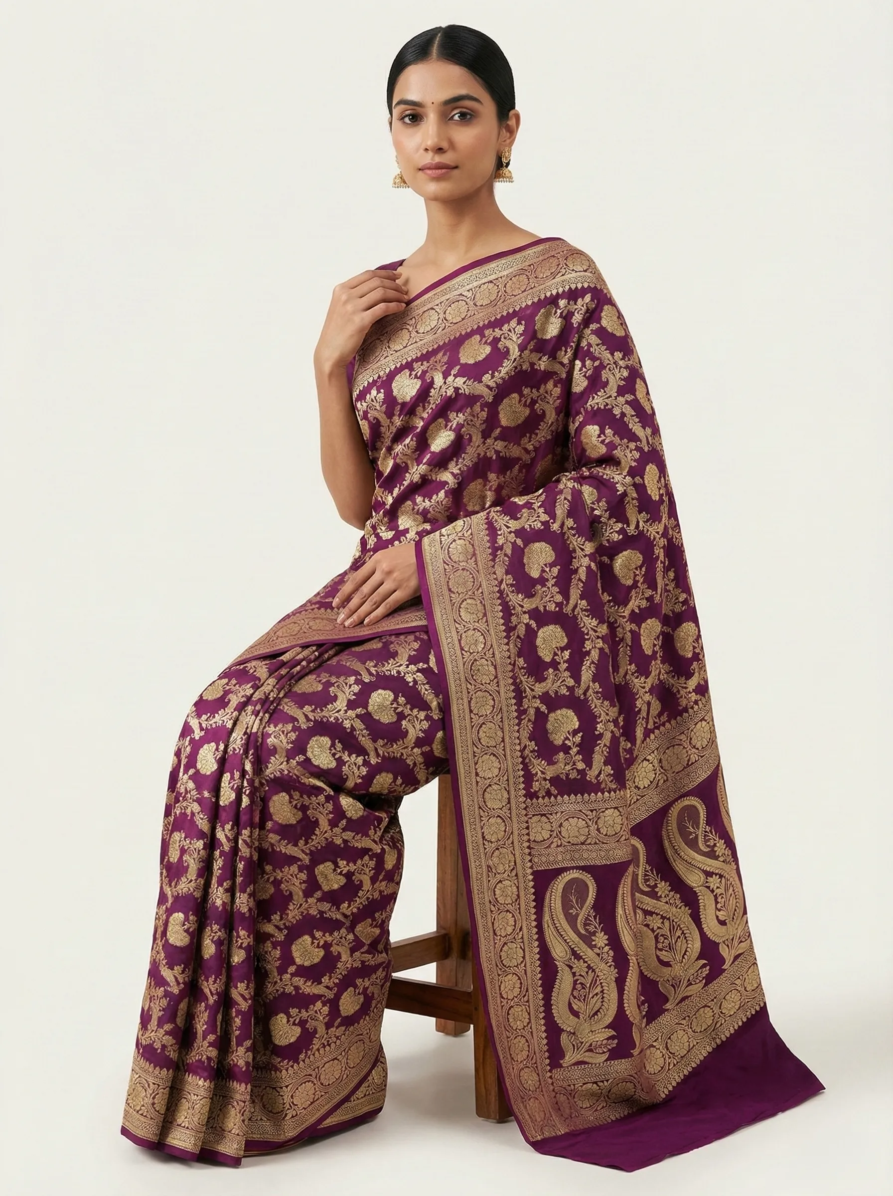 This Wine Mashroo Silk Saree is handwoven in Varanasi, celebrating timeless Banarasi craftsmanship. Designed by Naaritva Banaras, it reflects heritage artistry from older eras. Comes with a matching running blouse piece. Crafted with love and passion.