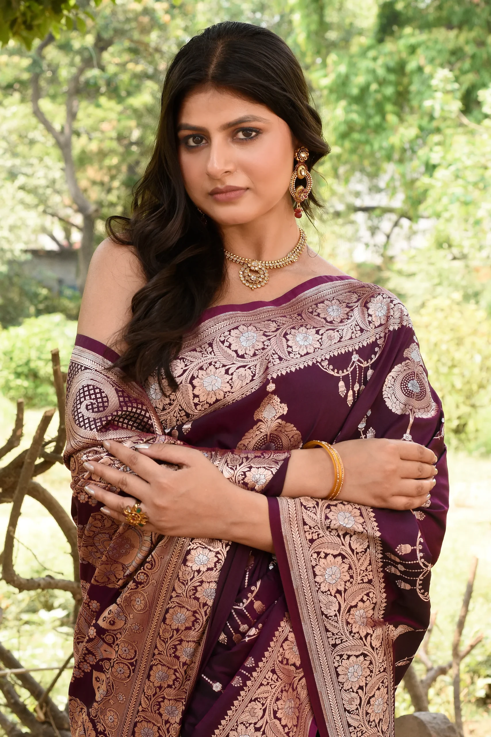 Plum Purple Banarasi Soft Silk Saree with Silver Zari Floral Jaal
